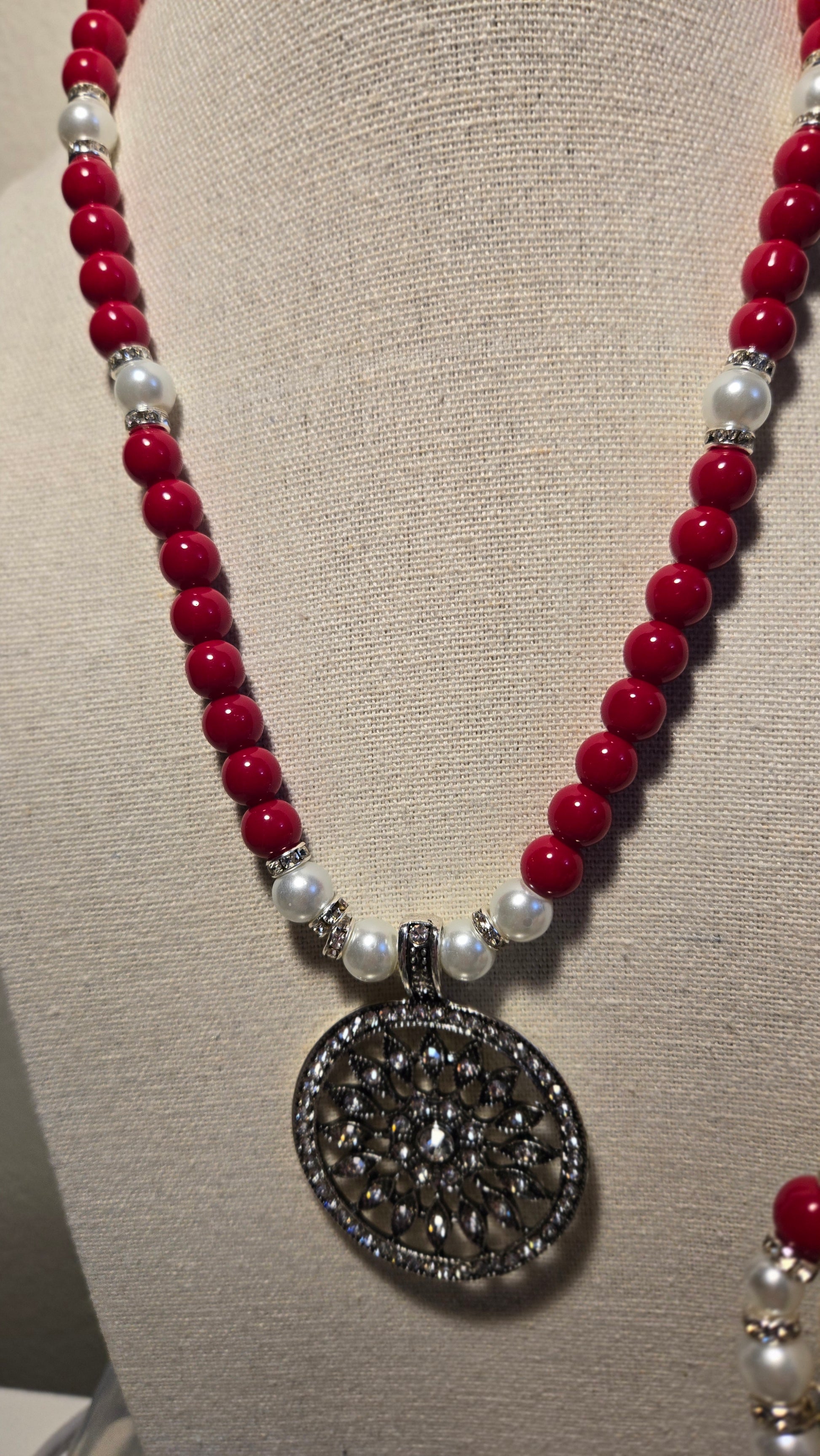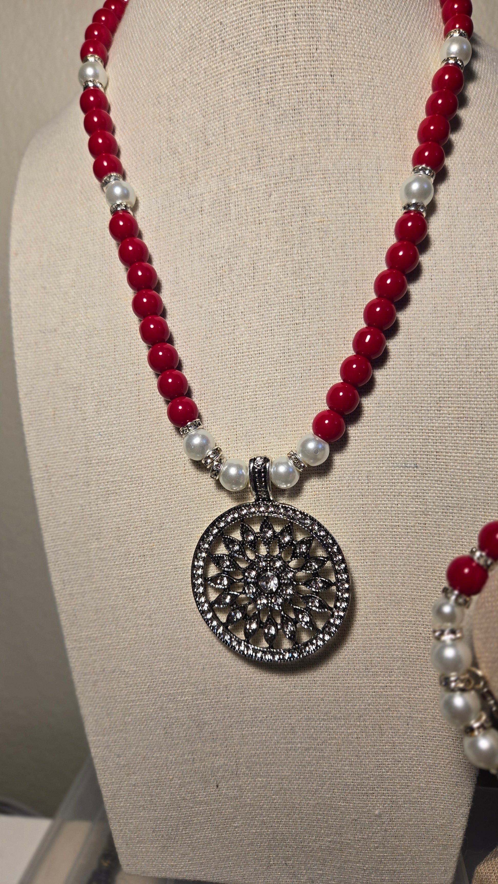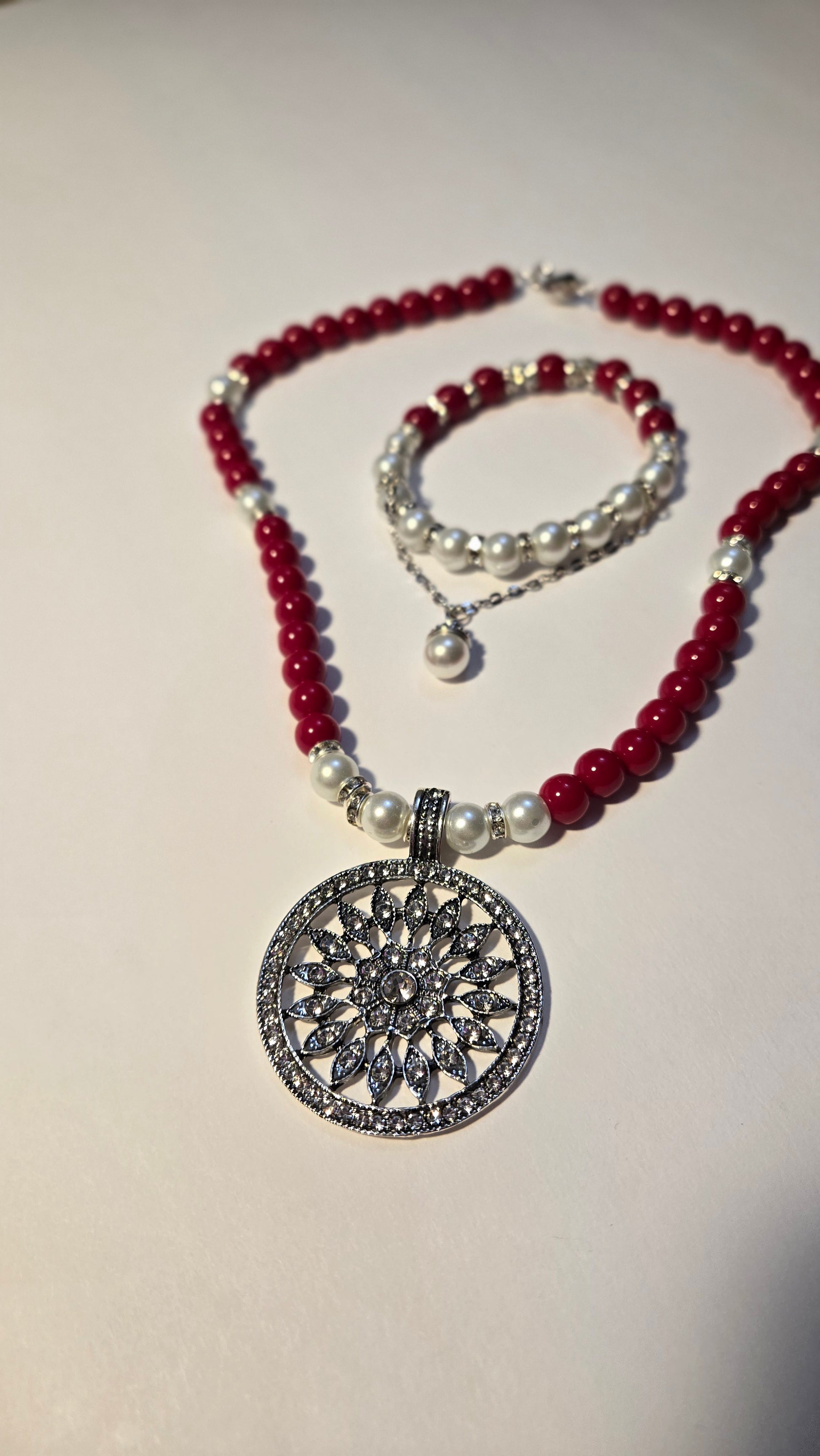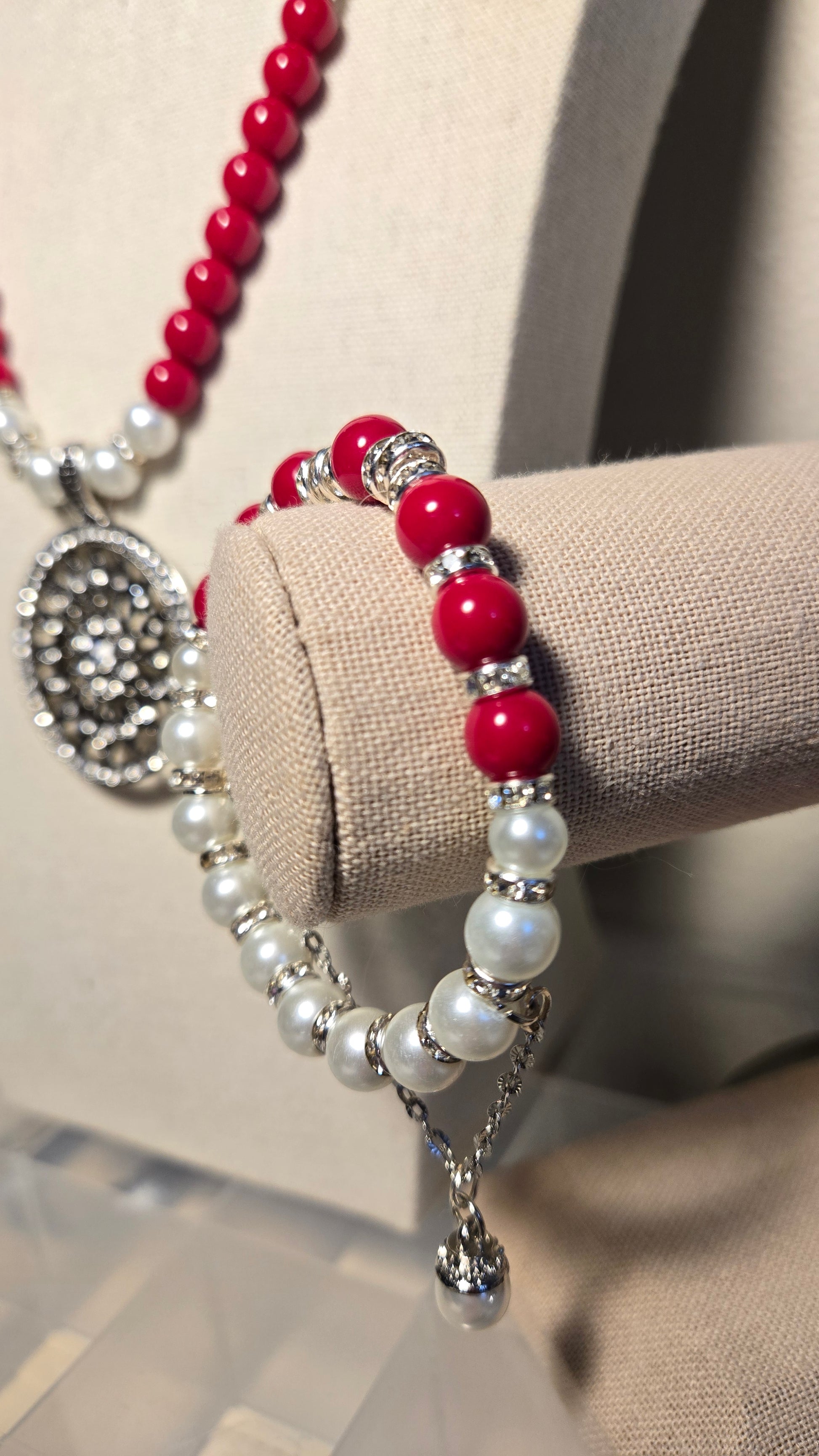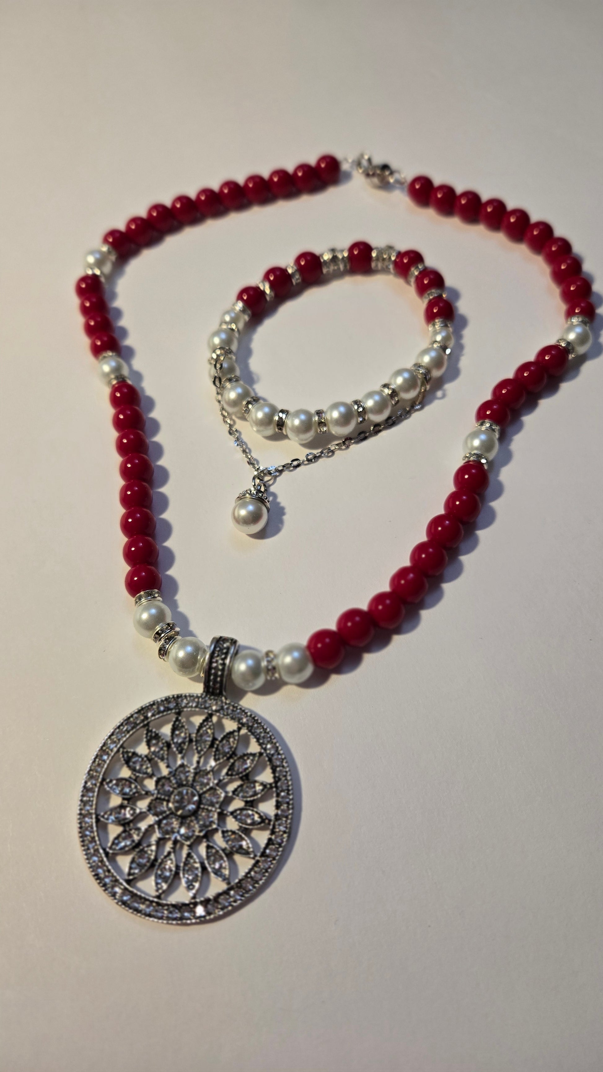 A vibrant jewelry set featuring a necklace and bracelet made of glossy red beads, soft white pearls, and shimmering silver accents. A bold yet elegant combination perfect for lively, feminine looks.