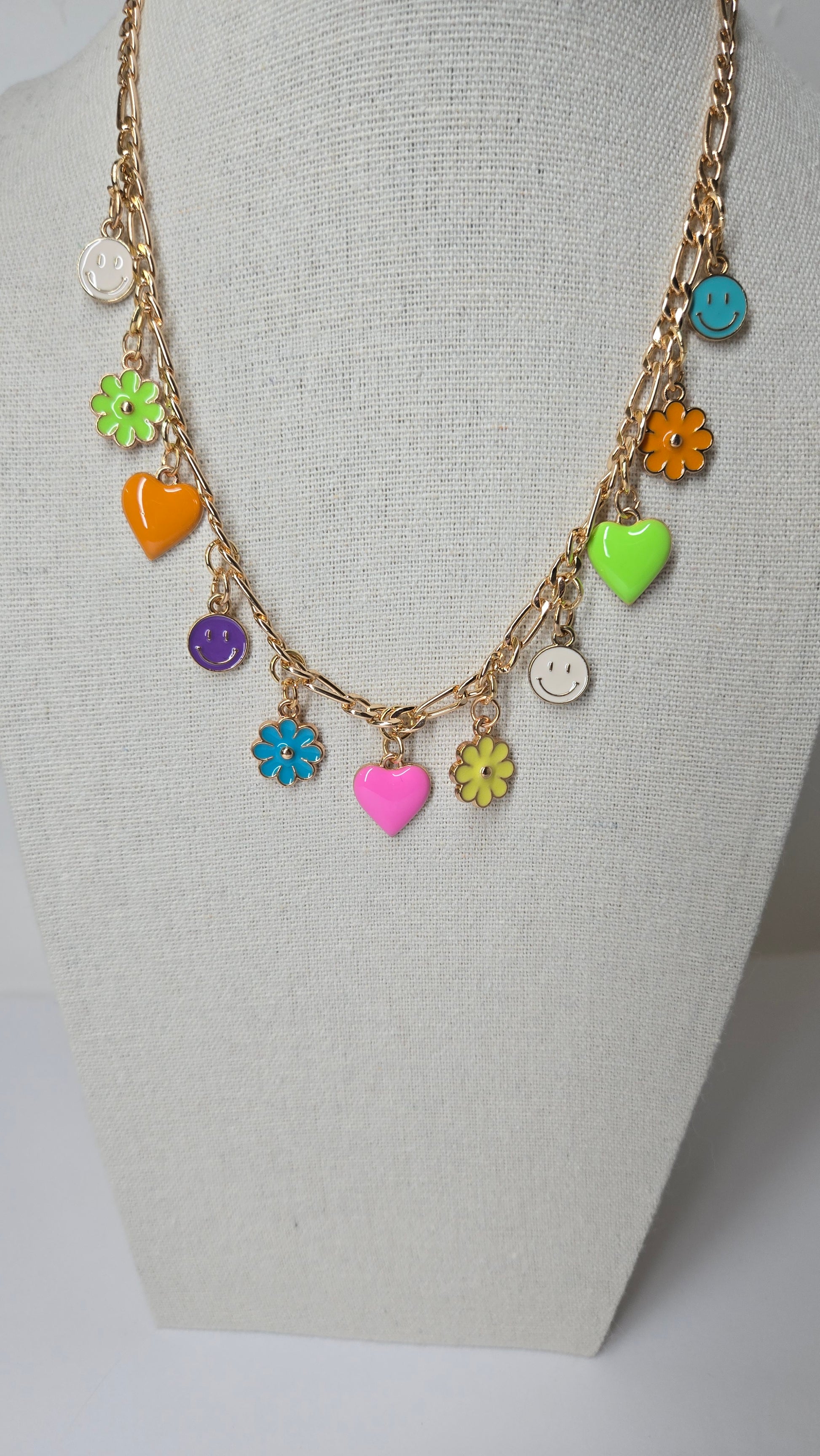A cheerful gold chain necklace decorated with colorful enamel charms — hearts, flowers, and smiley faces. This fun and vibrant piece adds happiness and a playful touch to any outfit, perfect for bright souls and joyful spirits.