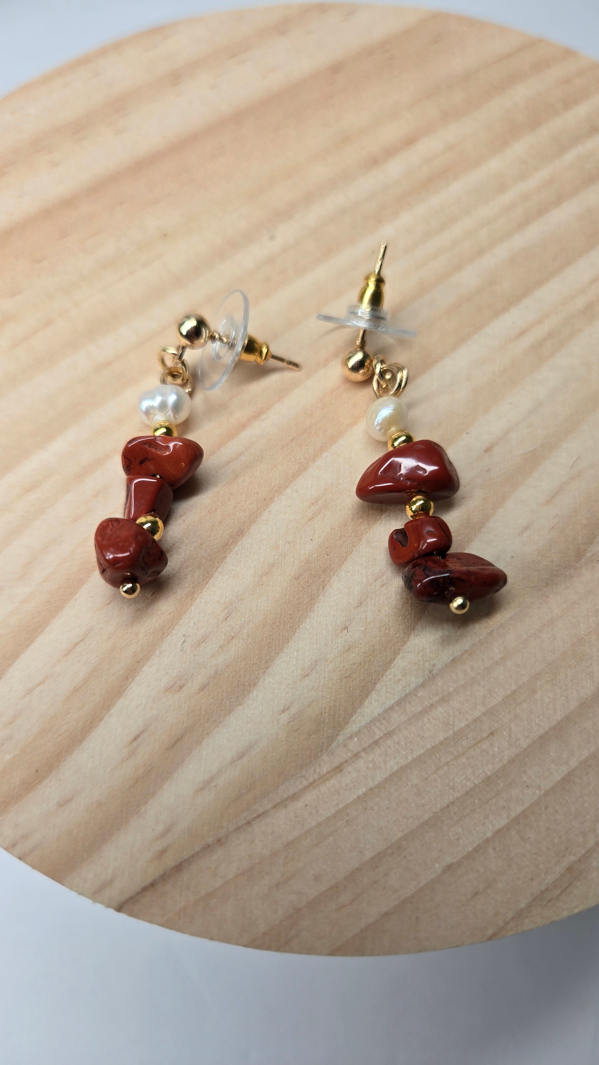 Handcrafted earrings featuring deep red coral stones paired with golden accents and a touch of natural pearl. Designed to bring warmth and elegance, these earrings reflect both passion and timeless style.