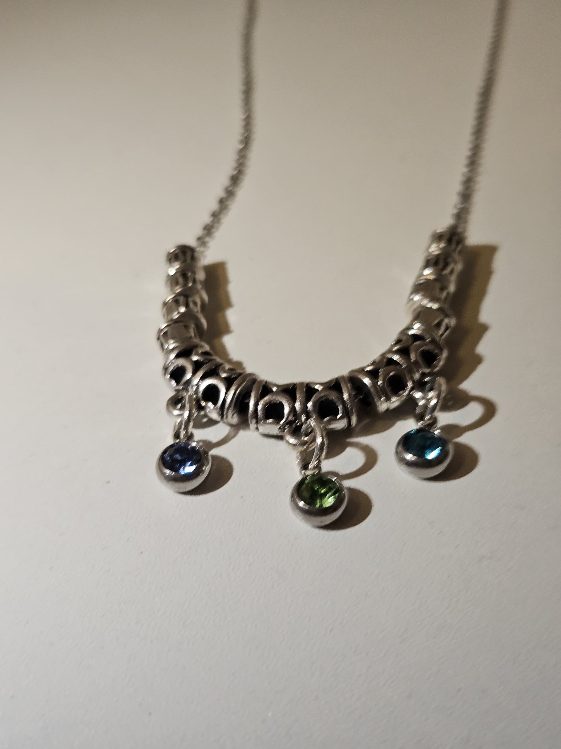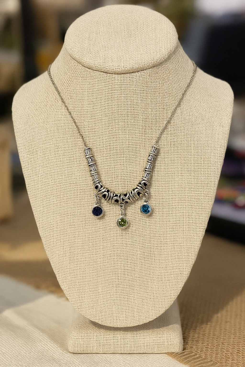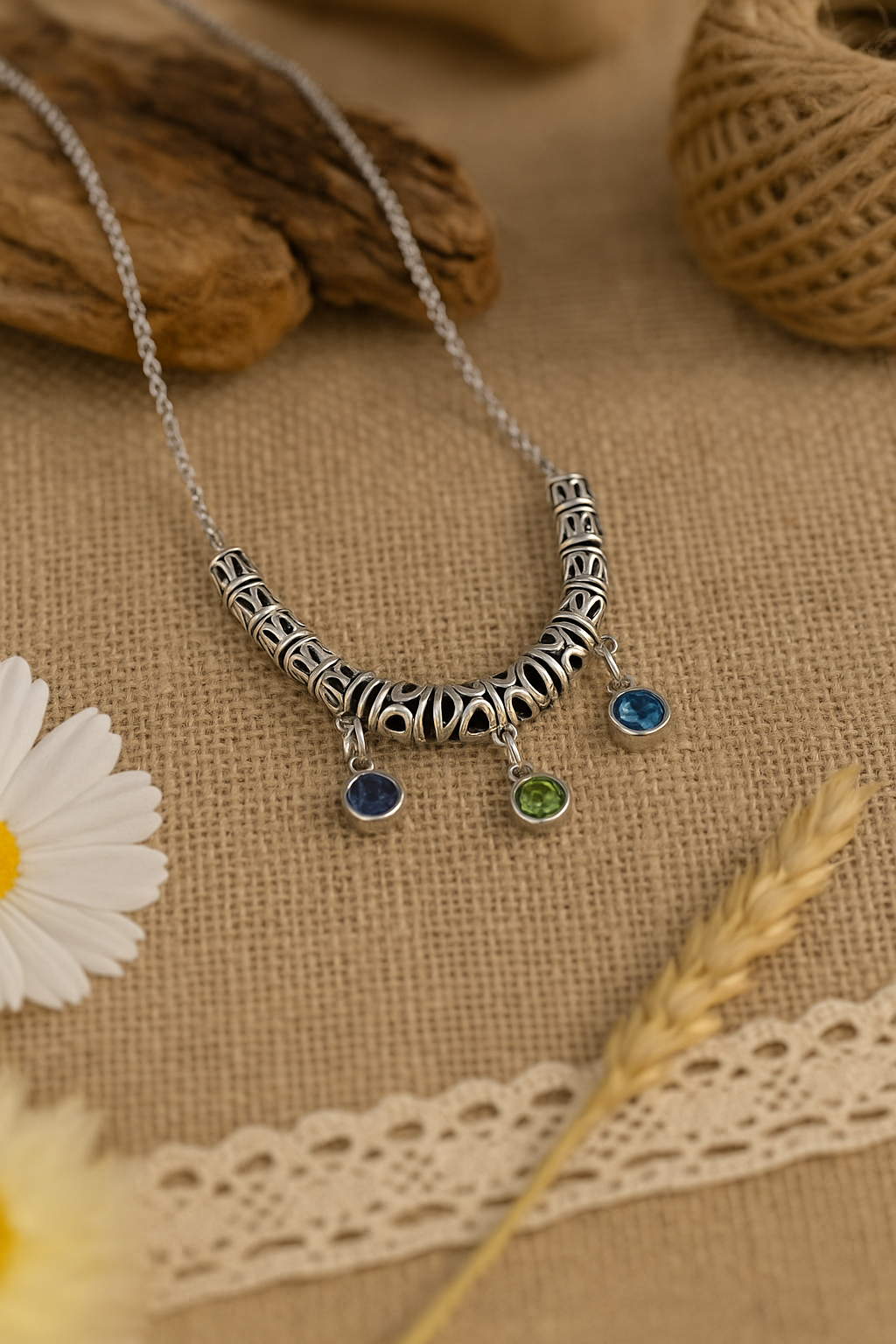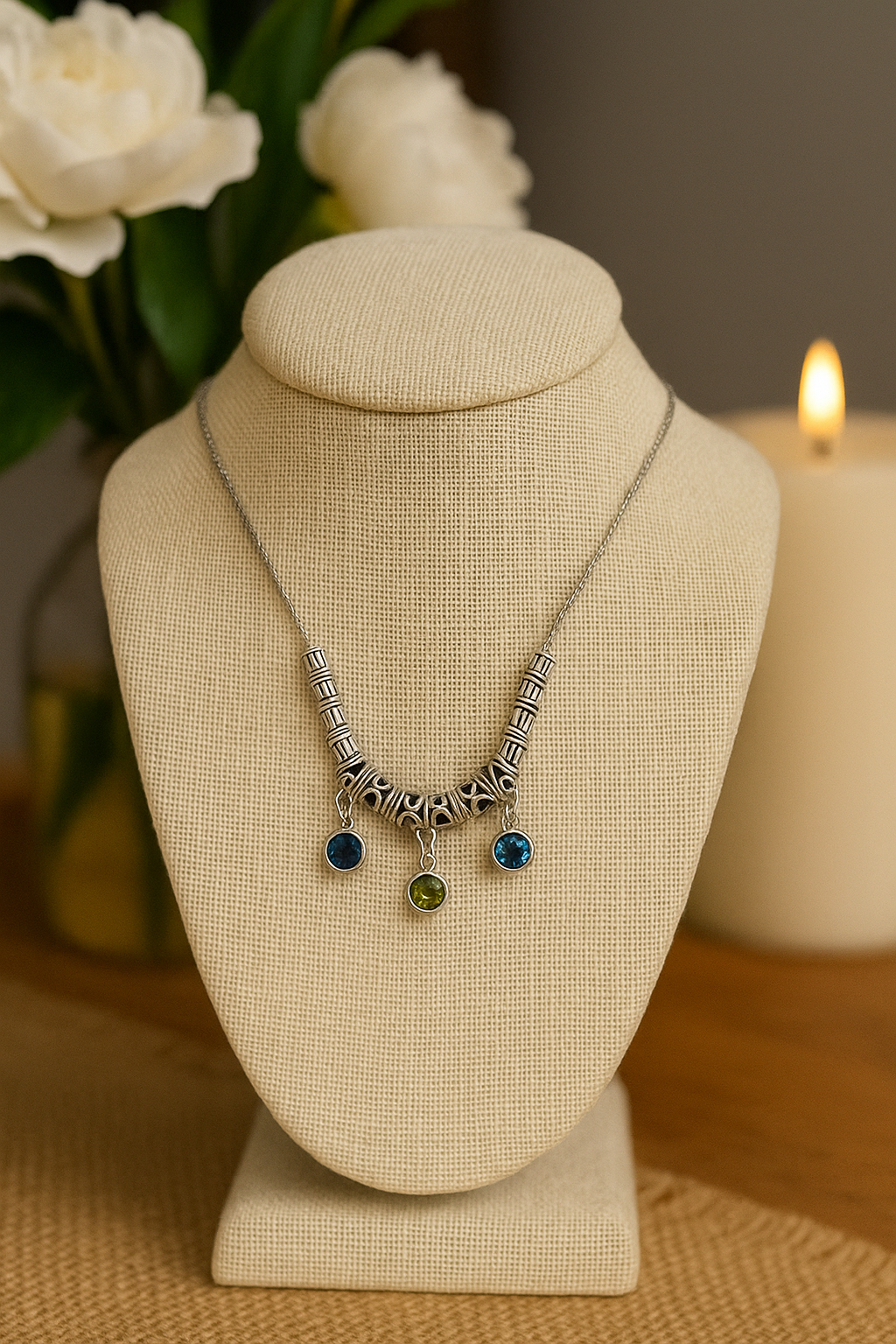 A stylish silver necklace with a modern design, adorned with three crystal stones in shades of sea, sky, and nature—symbolizing purity, calm, and balance. A piece that blends elegance and uniqueness, adding a serene touch of beauty to any outfit.