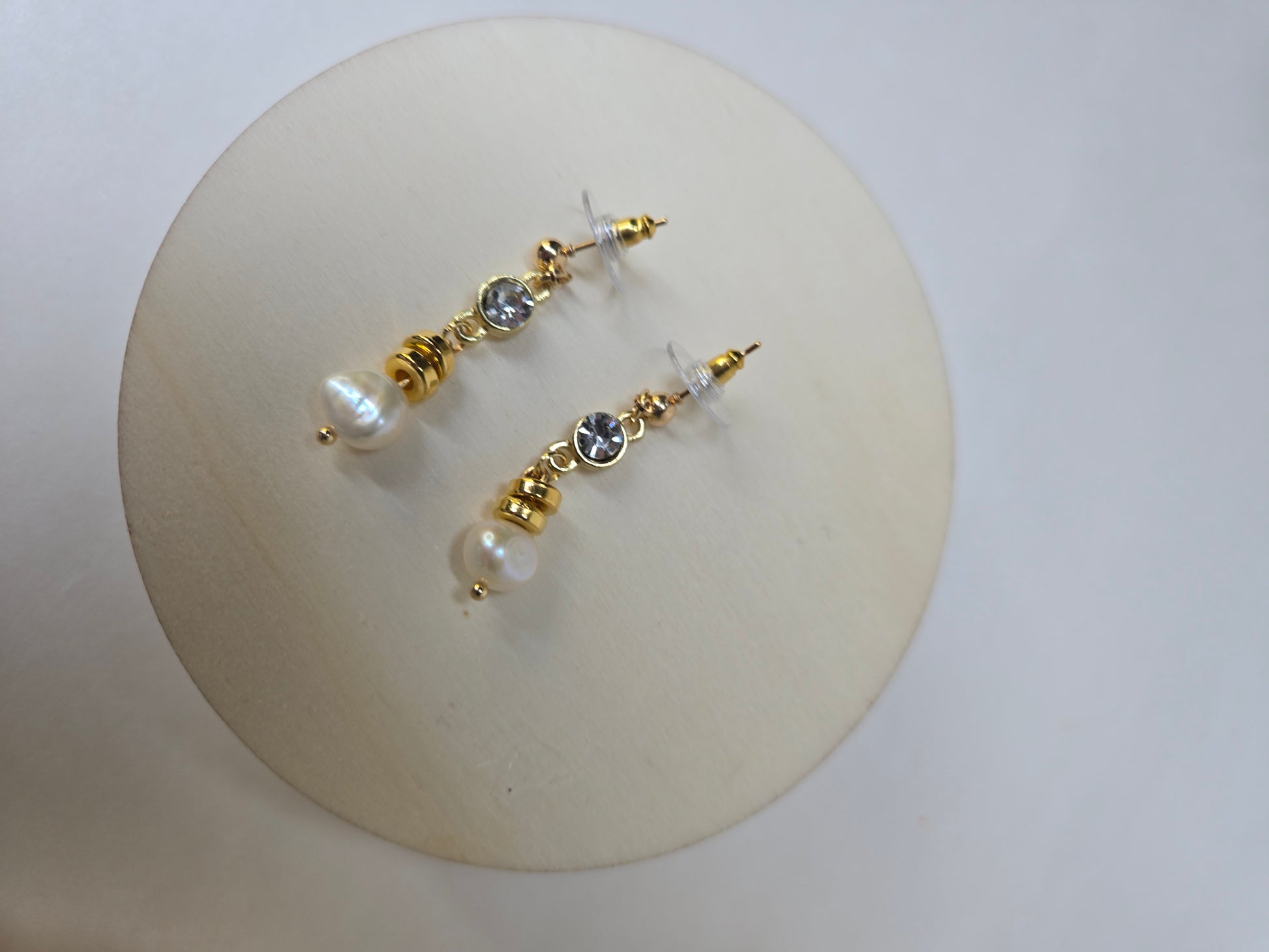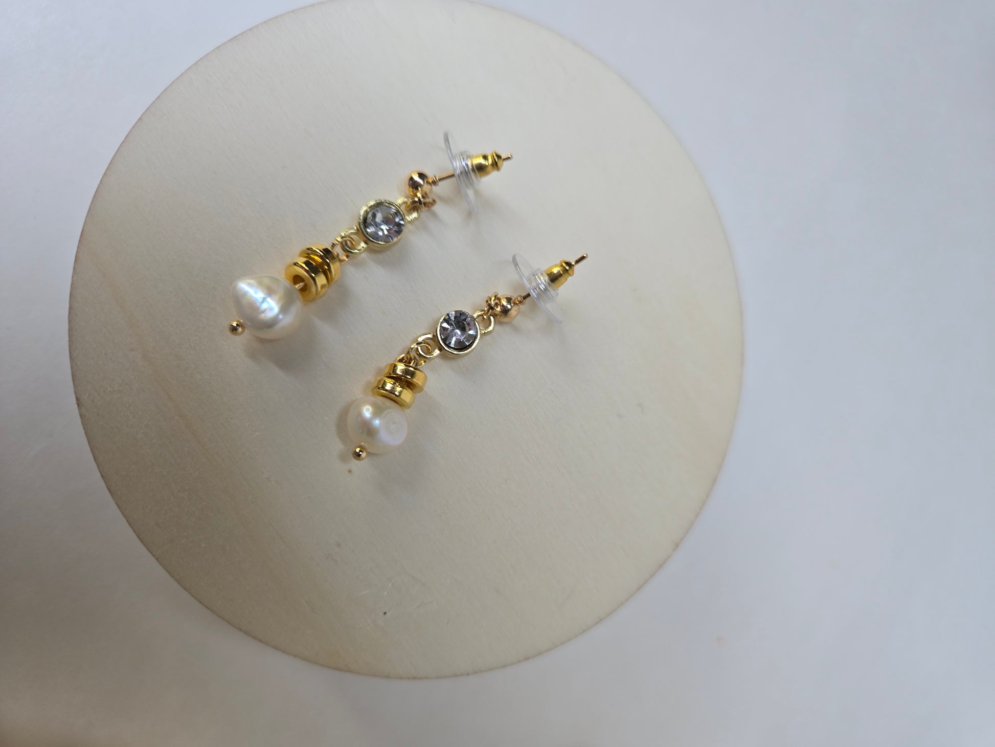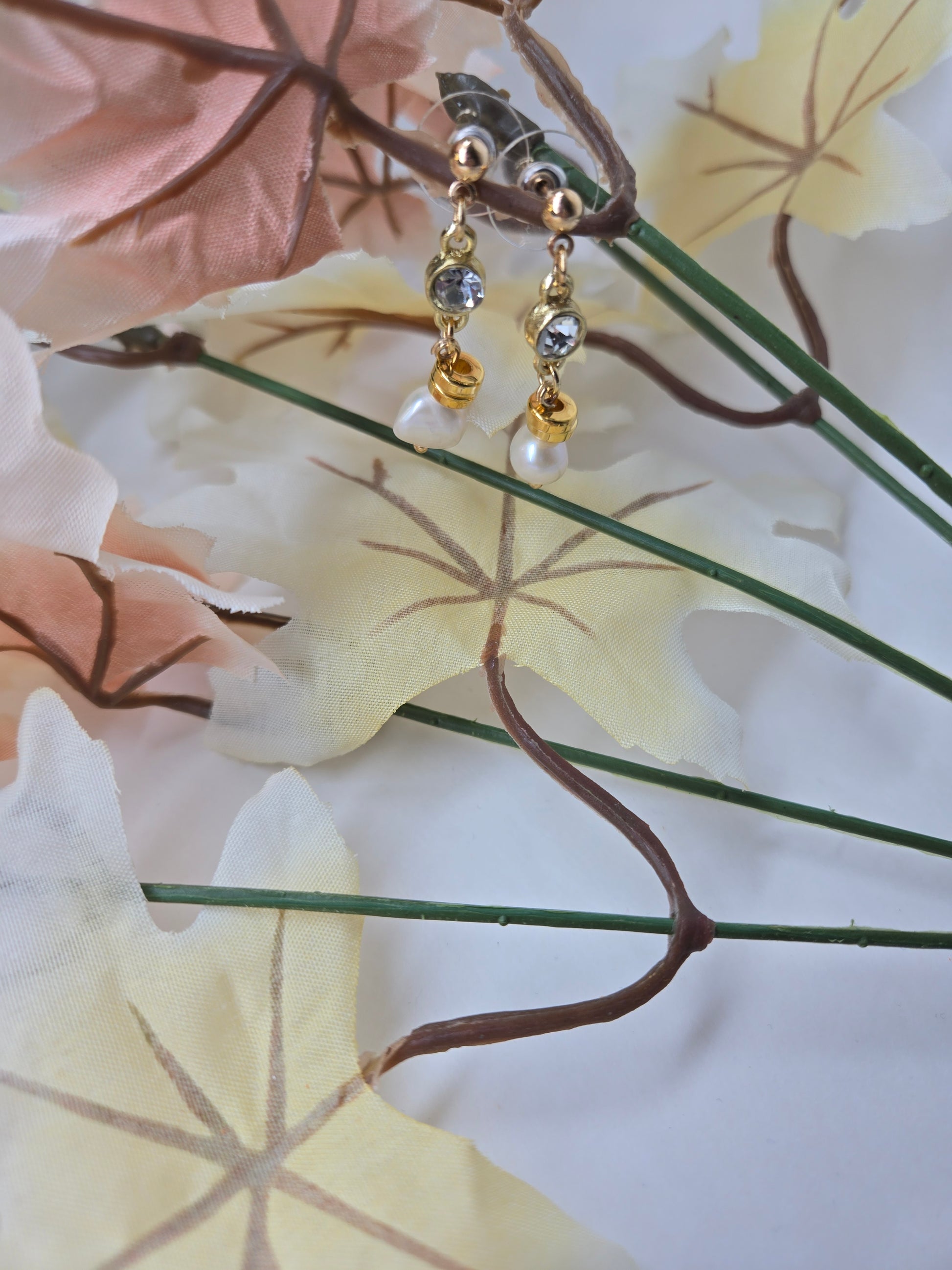 Elegant gold earrings featuring a natural pearl drop below a sparkling clear stone. A timeless design for graceful and radiant looks.