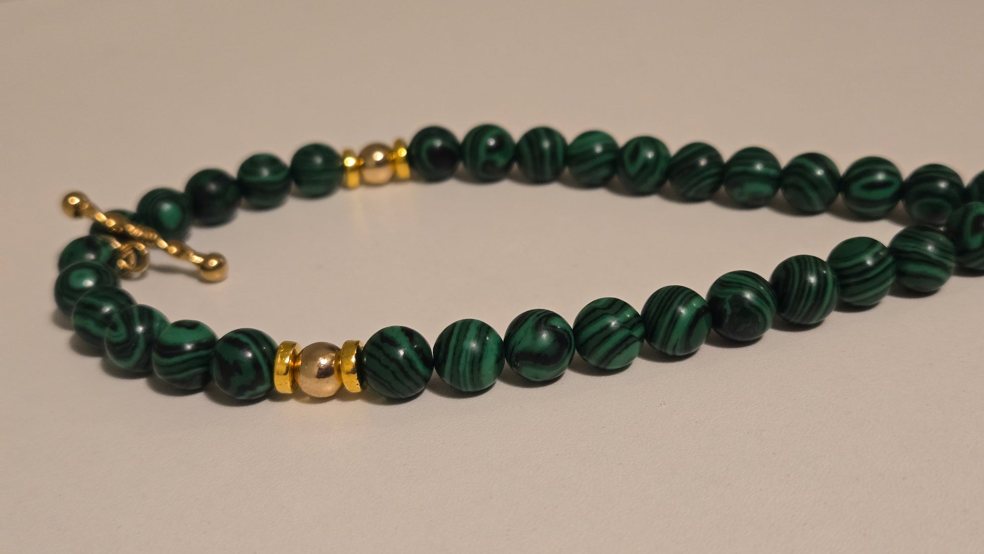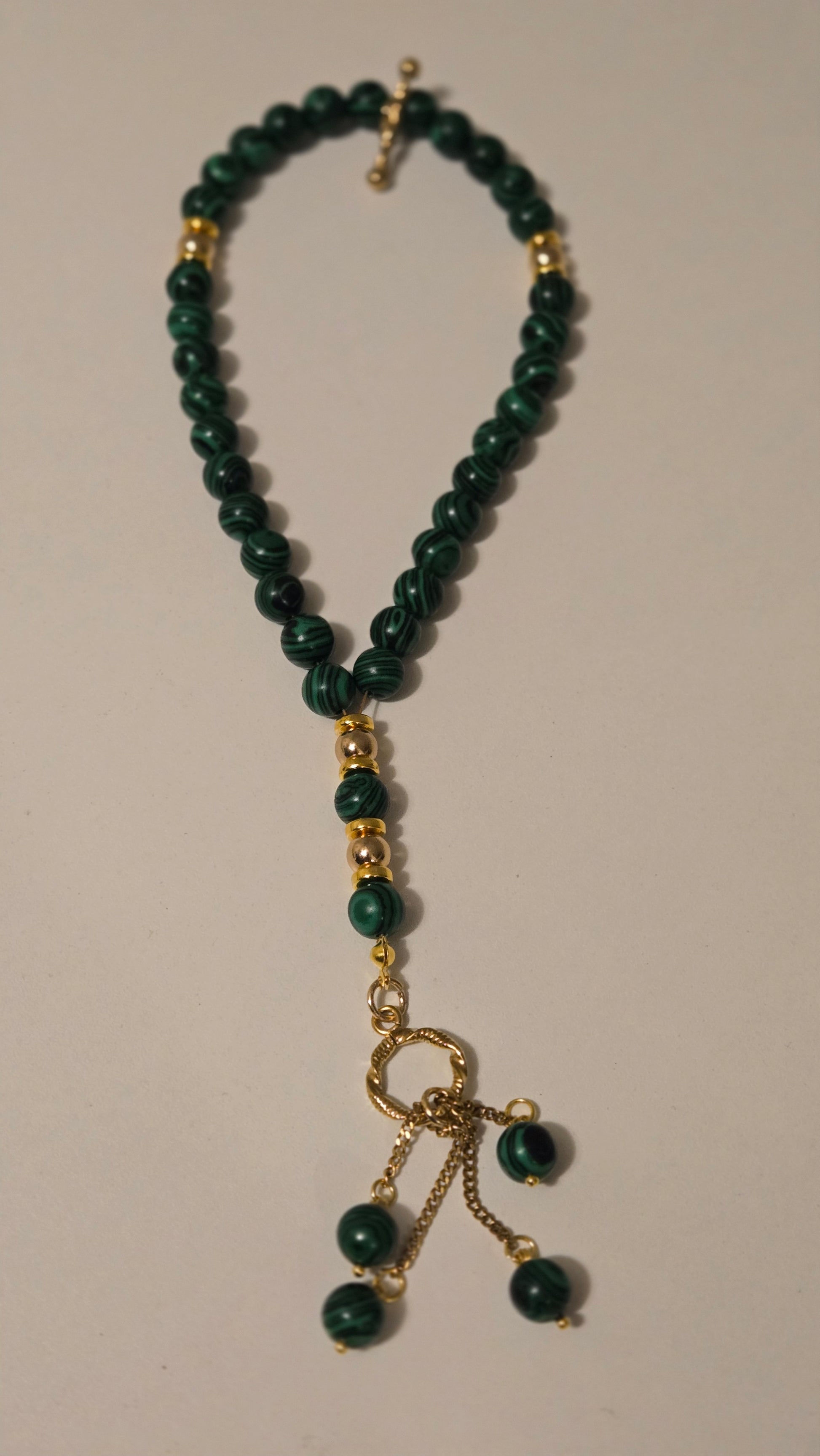 A versatile elegant piece crafted with deep green beads and soft gold accents. Designed to be worn as a stylish necklace or converted into a modern bracelet, offering flexible styling and natural, refined elegance.