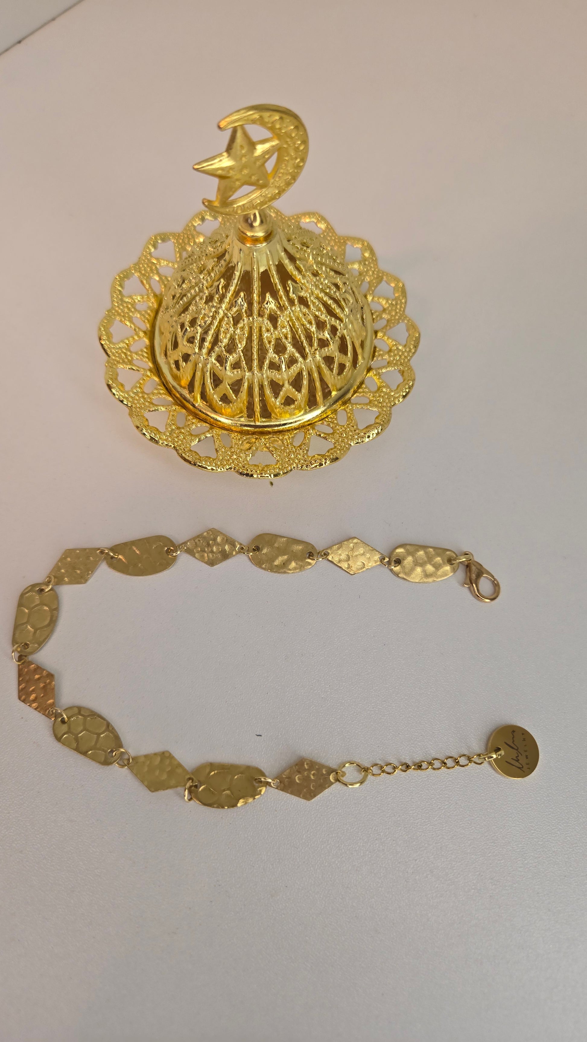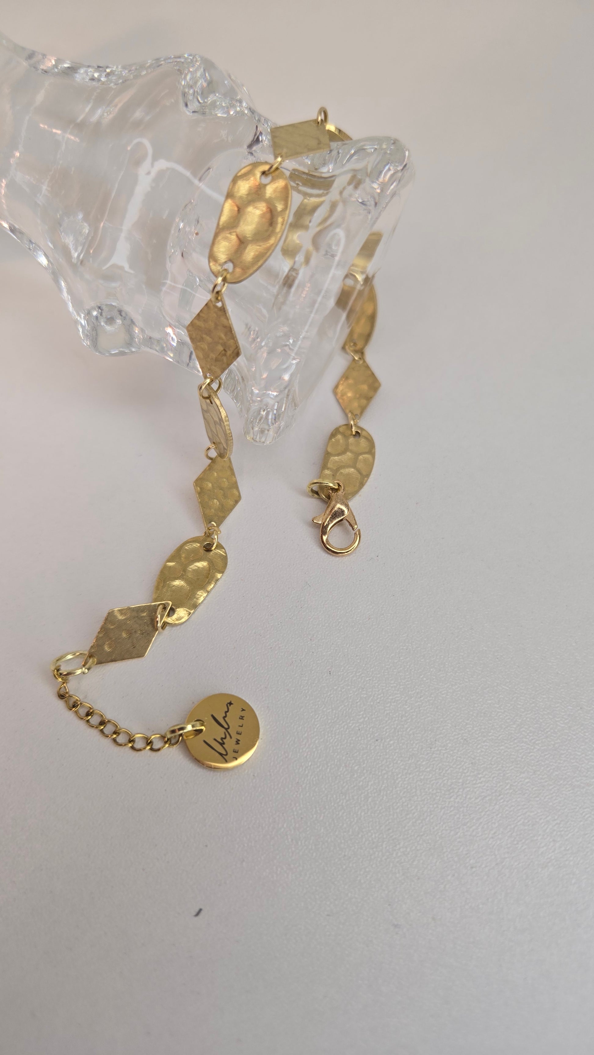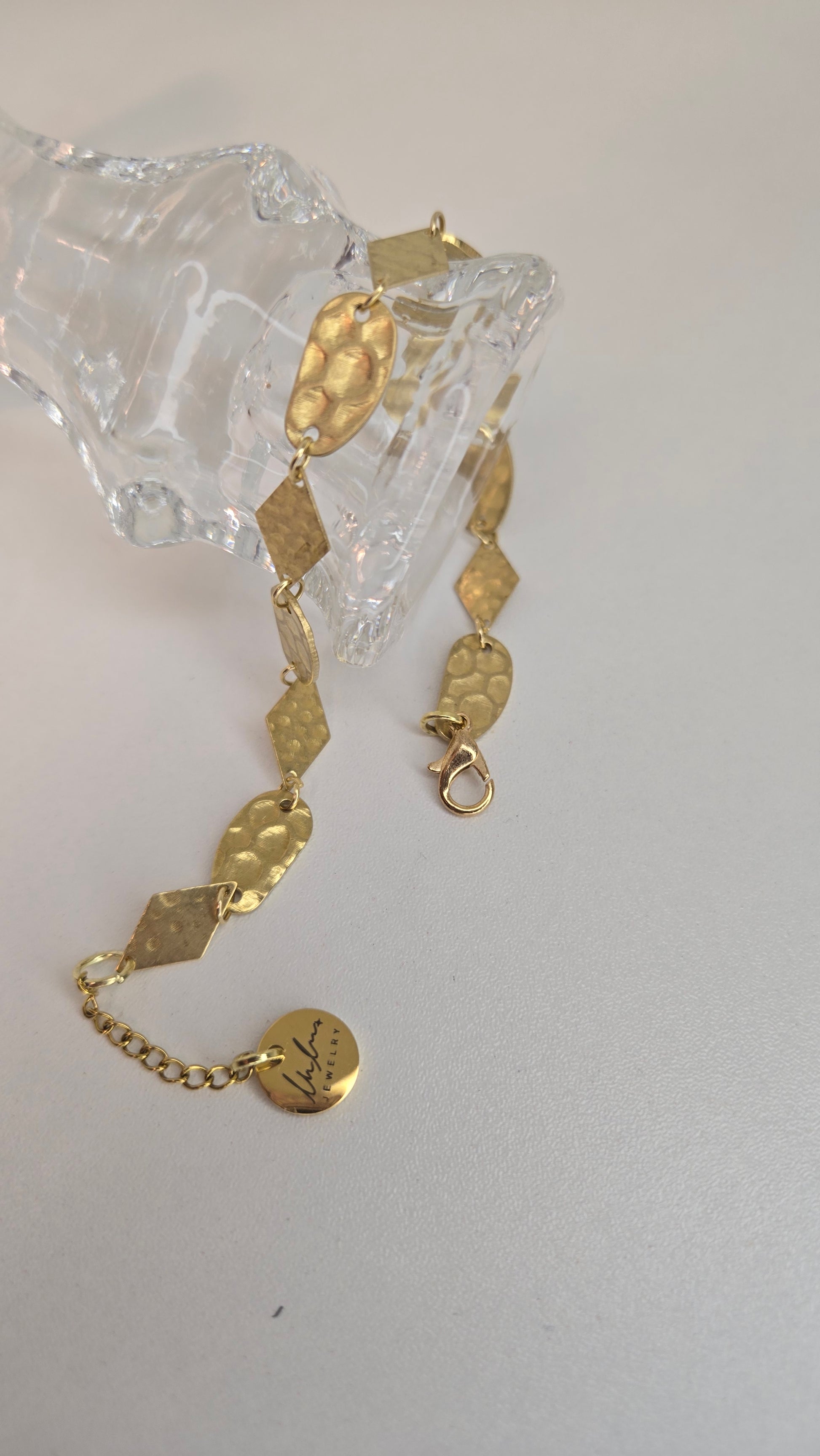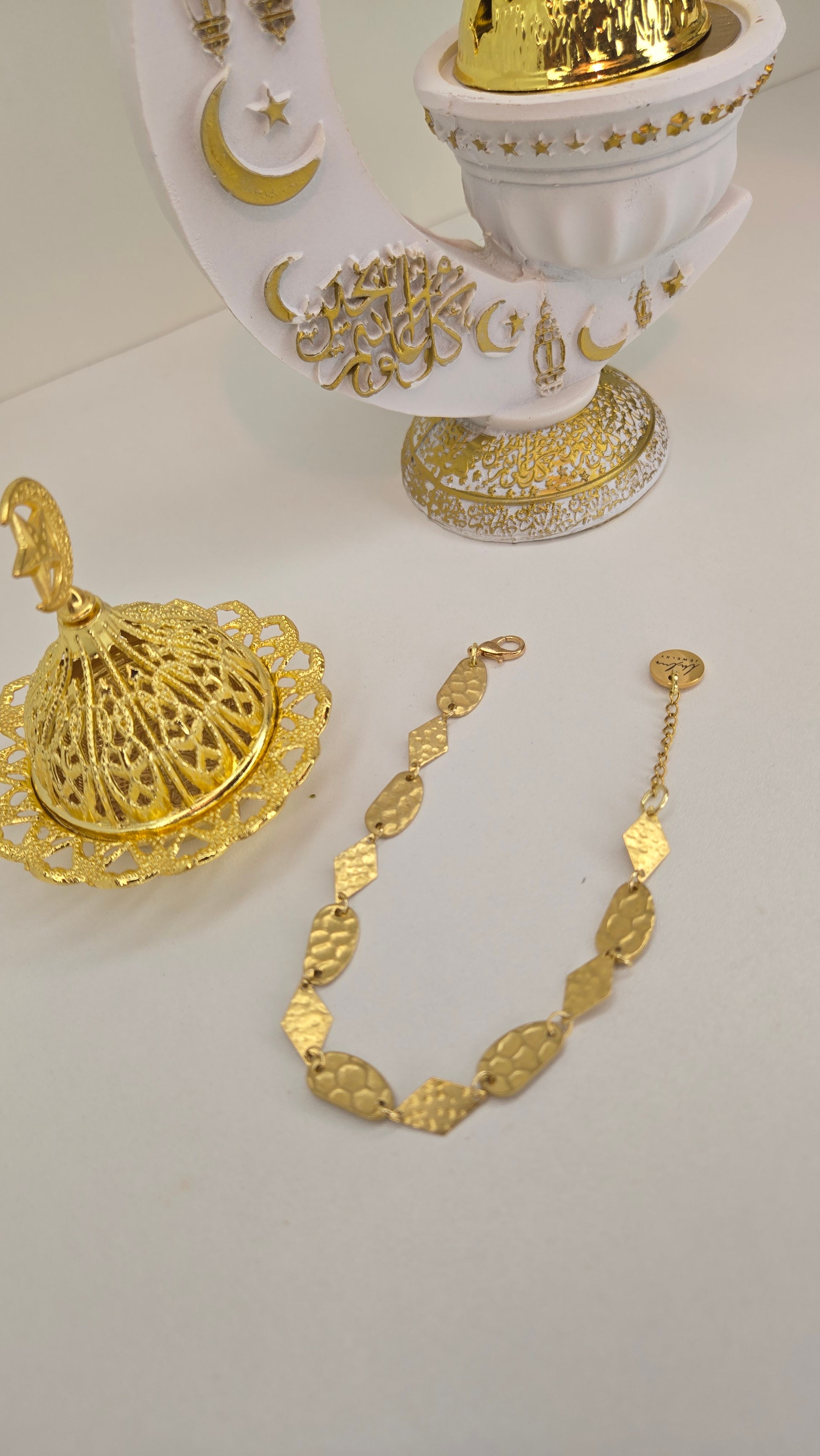 A modern geometric bracelet featuring a seamless combination of oval and diamond-shaped links, creating a balanced and elegant look on the wrist. The textured gold finish reflects light softly, adding depth and a subtle radiant glow without being overpowering.