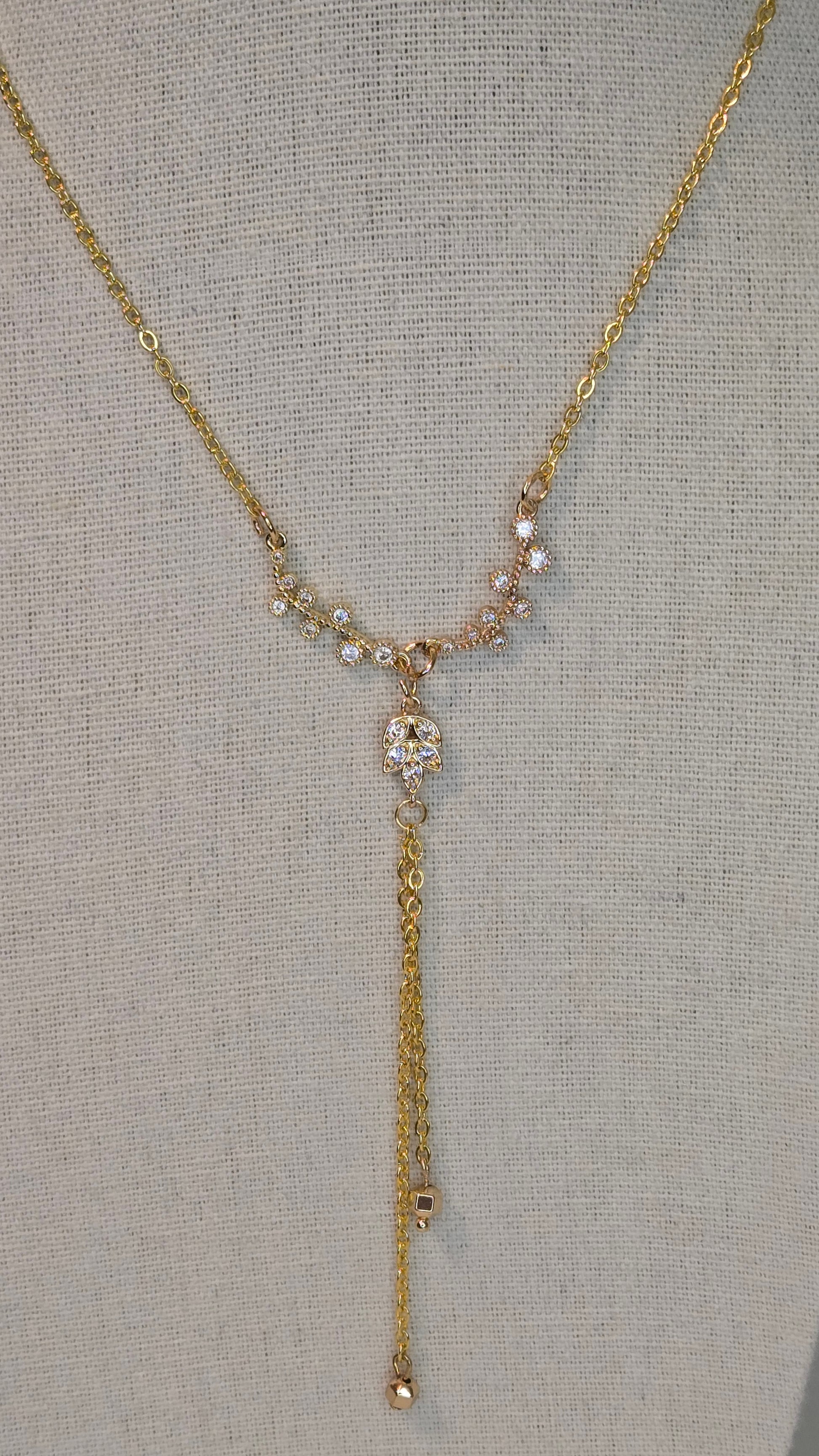 A long, elegant necklace with a soft rose-inspired design, crafted in gold-tone stainless steel. It adds a refined touch and graceful length to any outfit, perfect for a calm and sophisticated style.