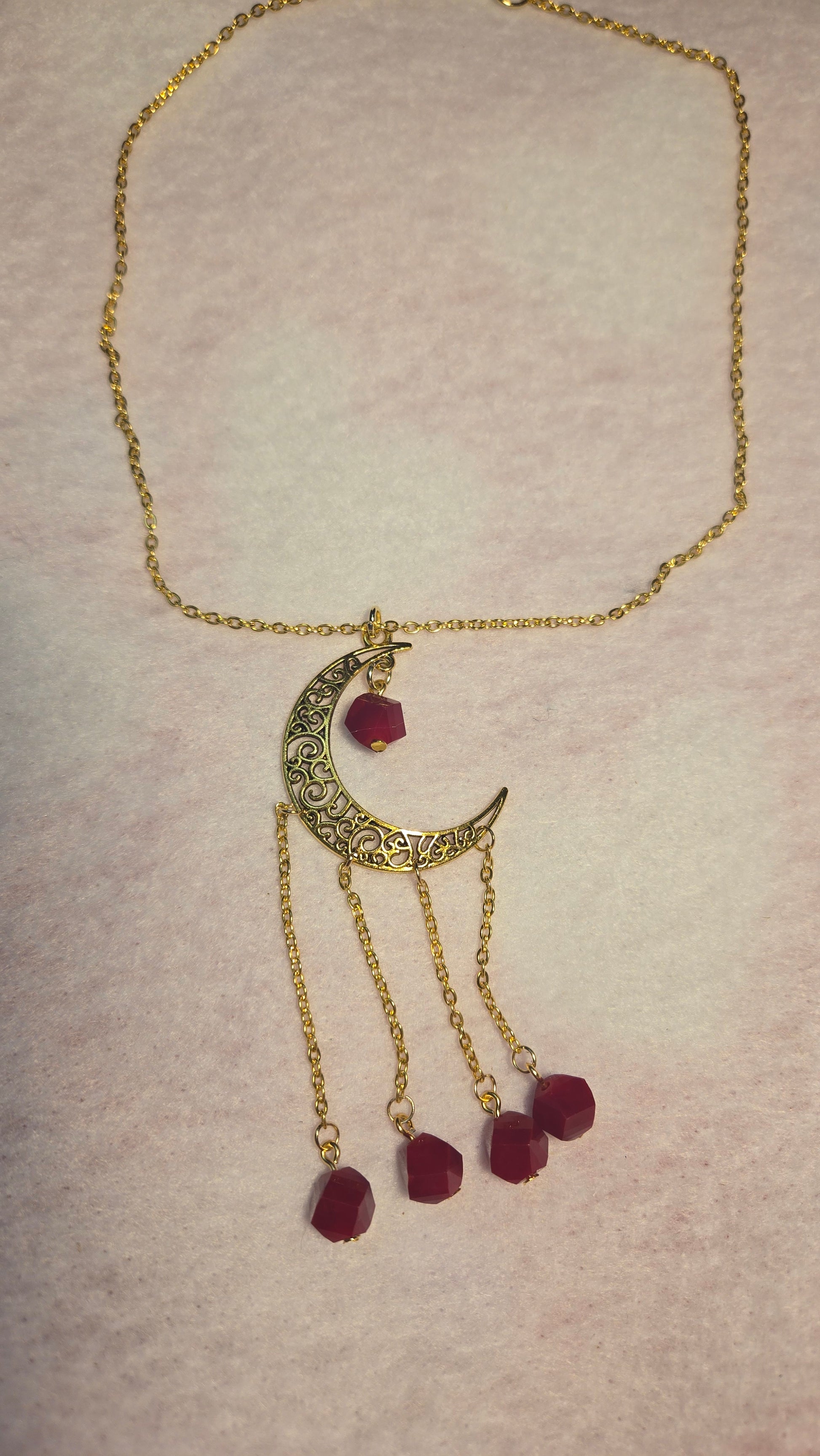 An elegant crescent necklace featuring intricate oriental engravings that reflect the charm of serene nights. Delicate gold chains cascade from the crescent, ending with deep ruby-toned stones that add graceful movement and feminine allure.
