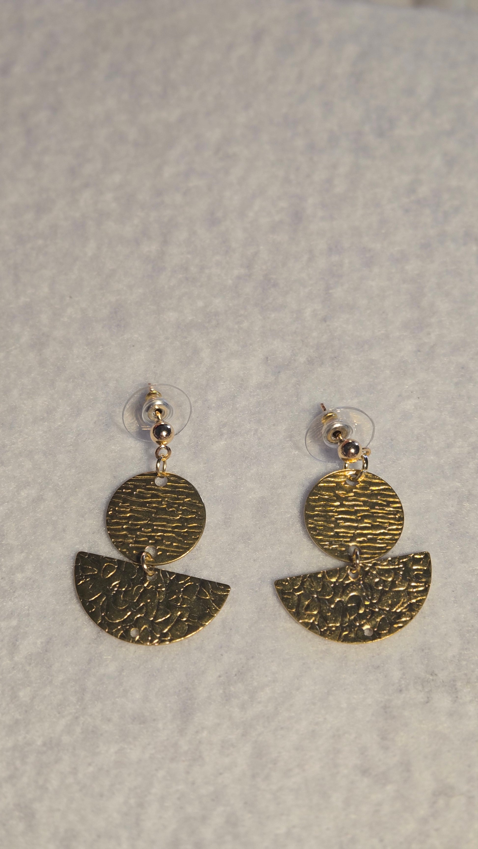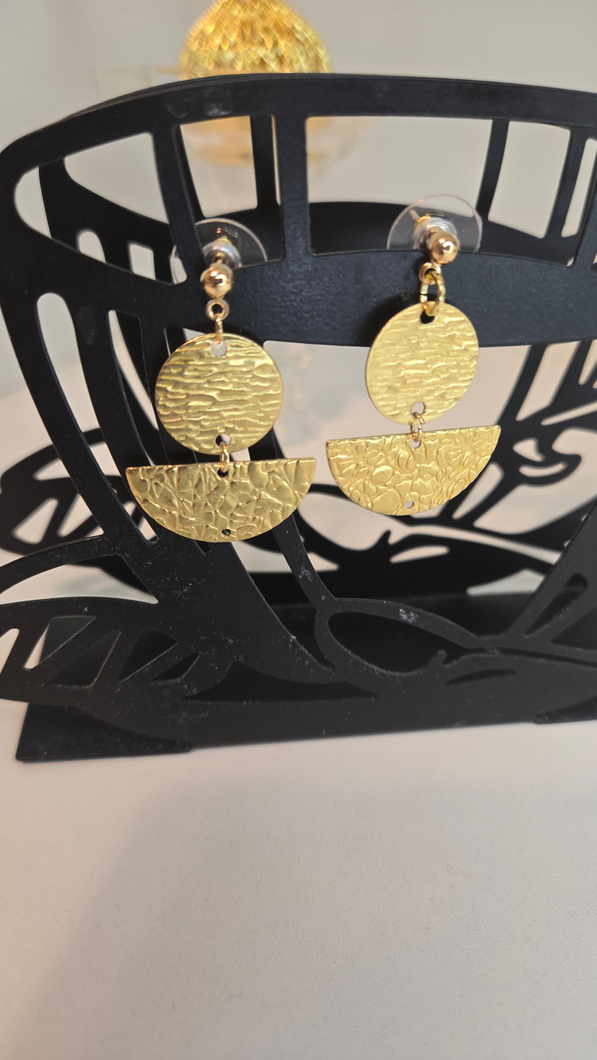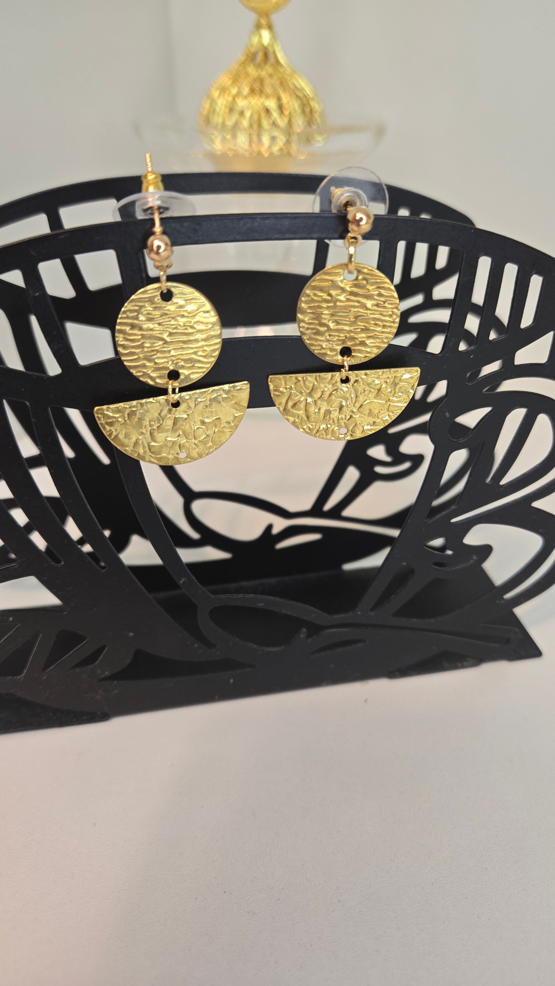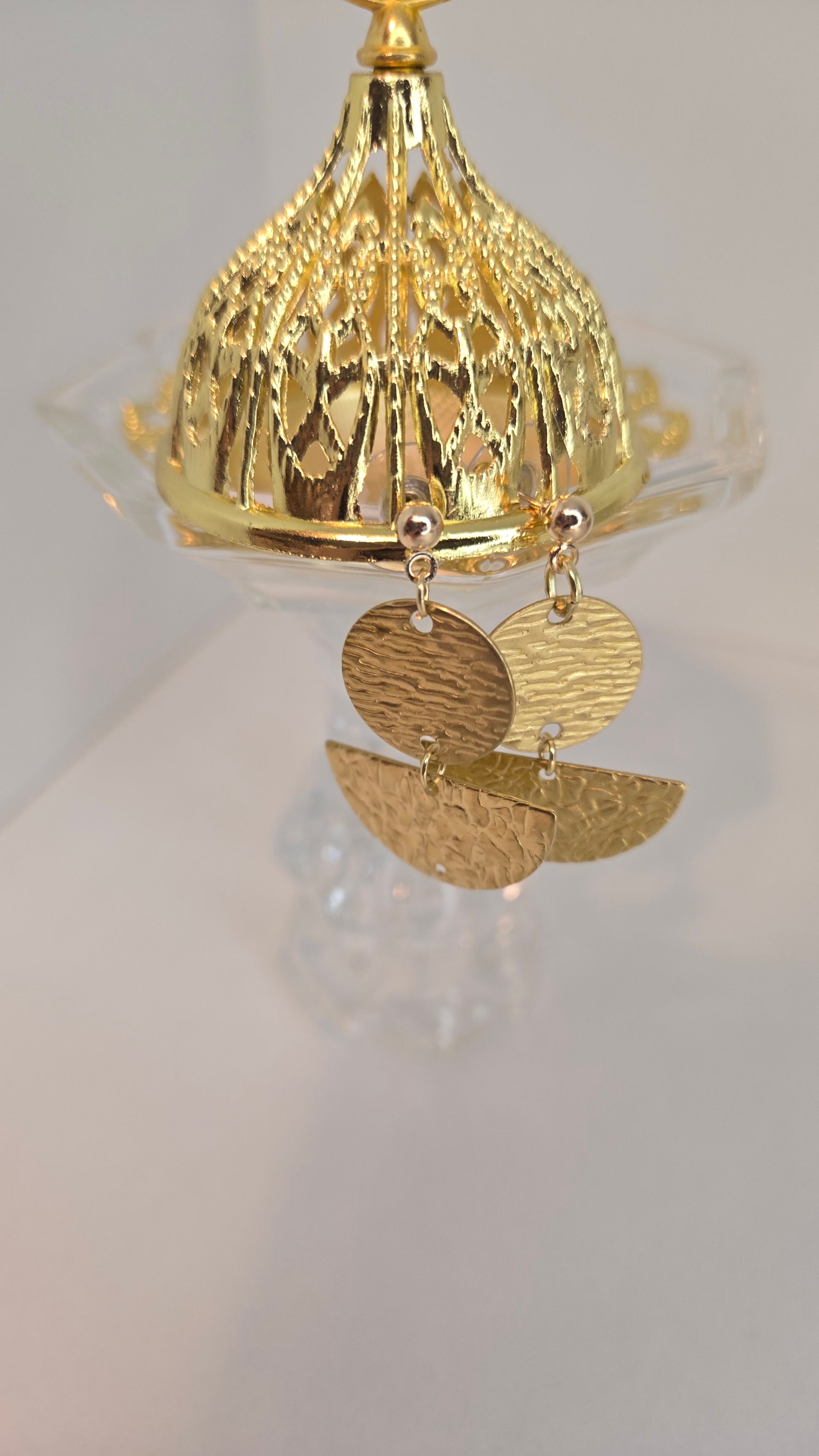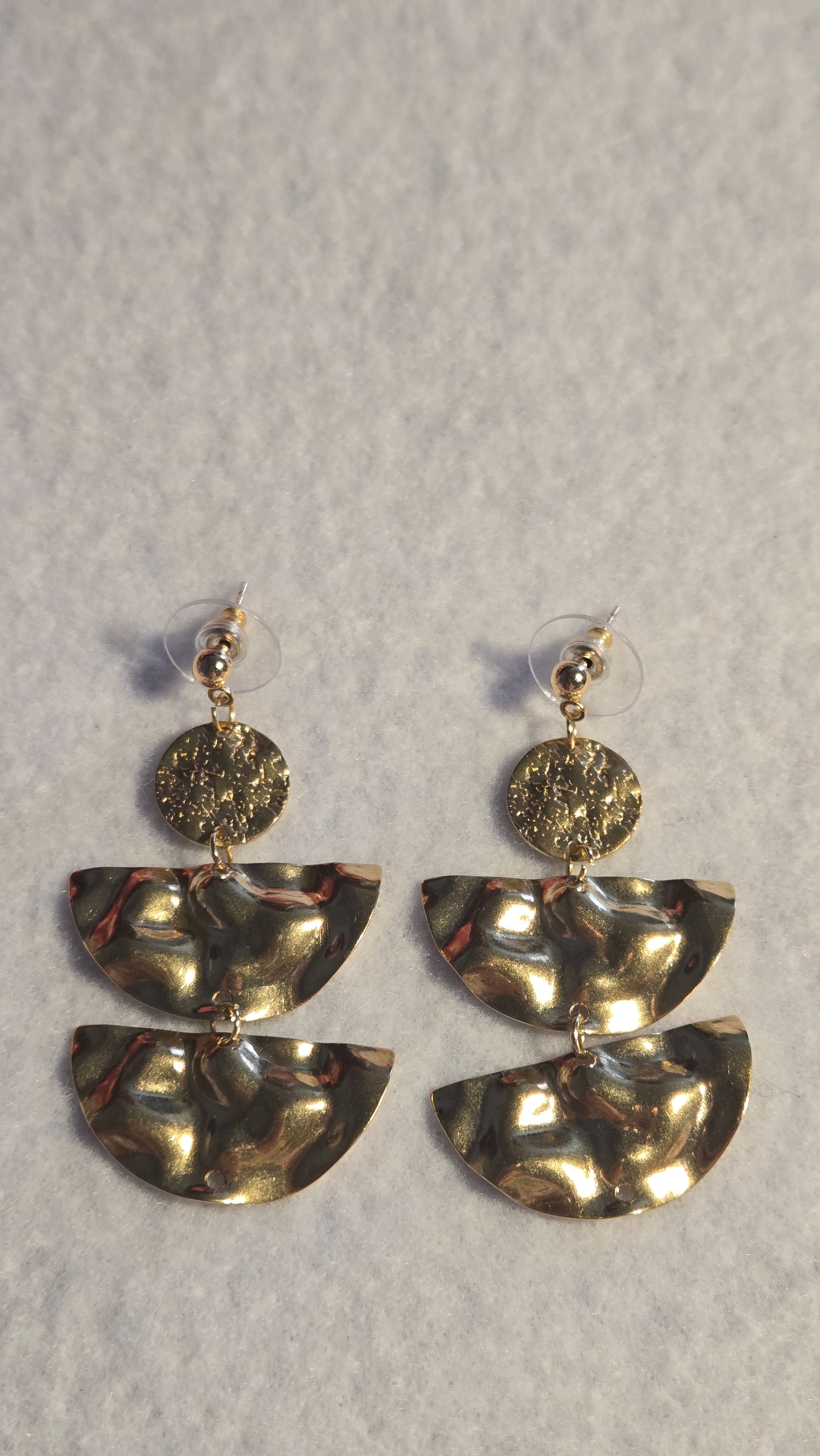 Bold statement earrings featuring textured gold discs cascading into curved, reflective panels. The fluid shapes and luminous finish create dynamic movement and artistic elegance. A striking piece designed for confident evening or contemporary looks.