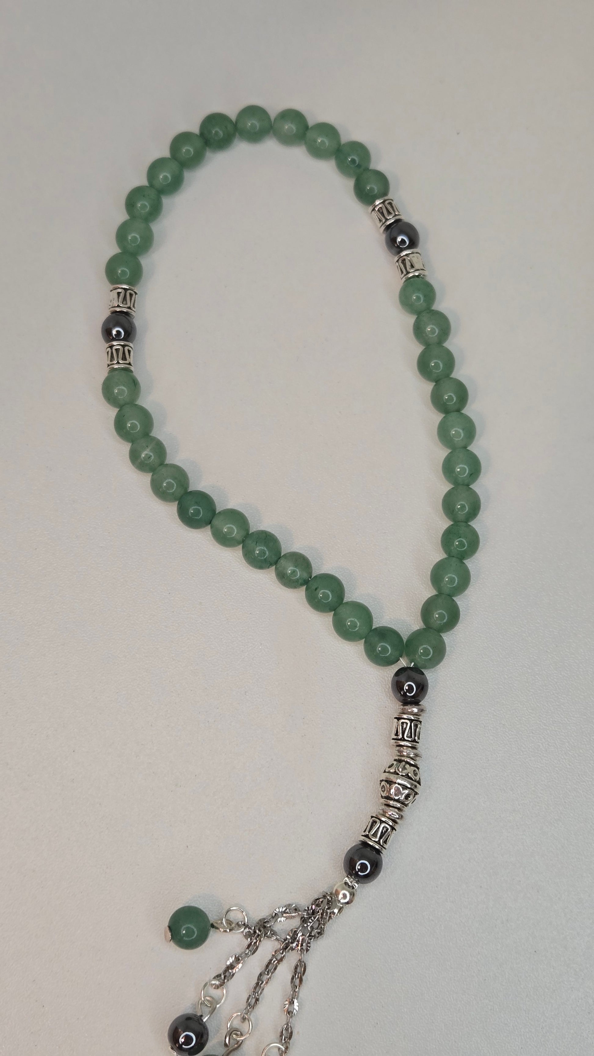 Elegant prayer beads made with smooth green aventurine stones, accented with polished hematite and detailed silver-toned spacers. Finished with a refined chain tassel, this piece reflects calm energy, balance, and timeless sophistication, ideal for daily use or as a meaningful gift.