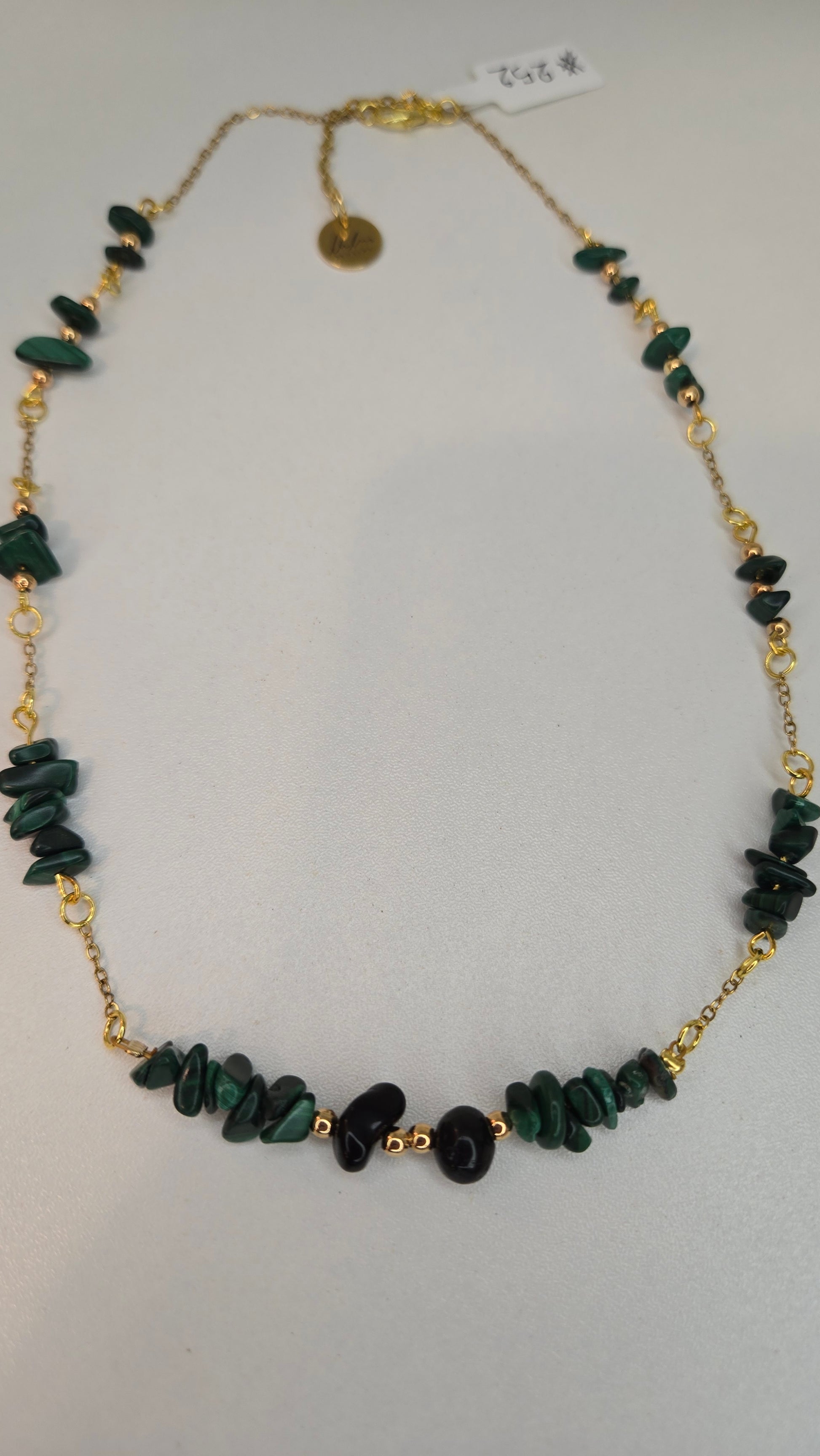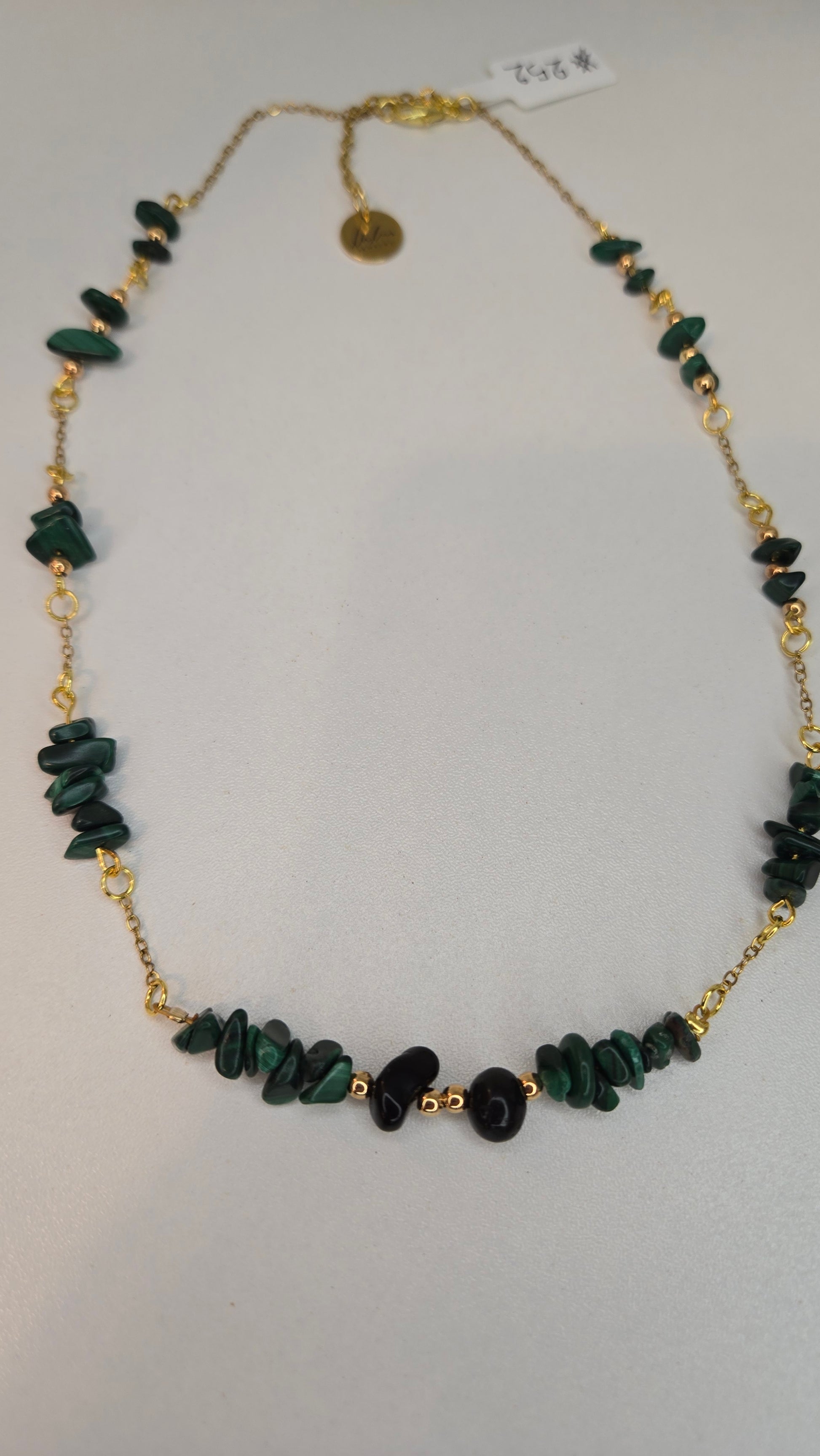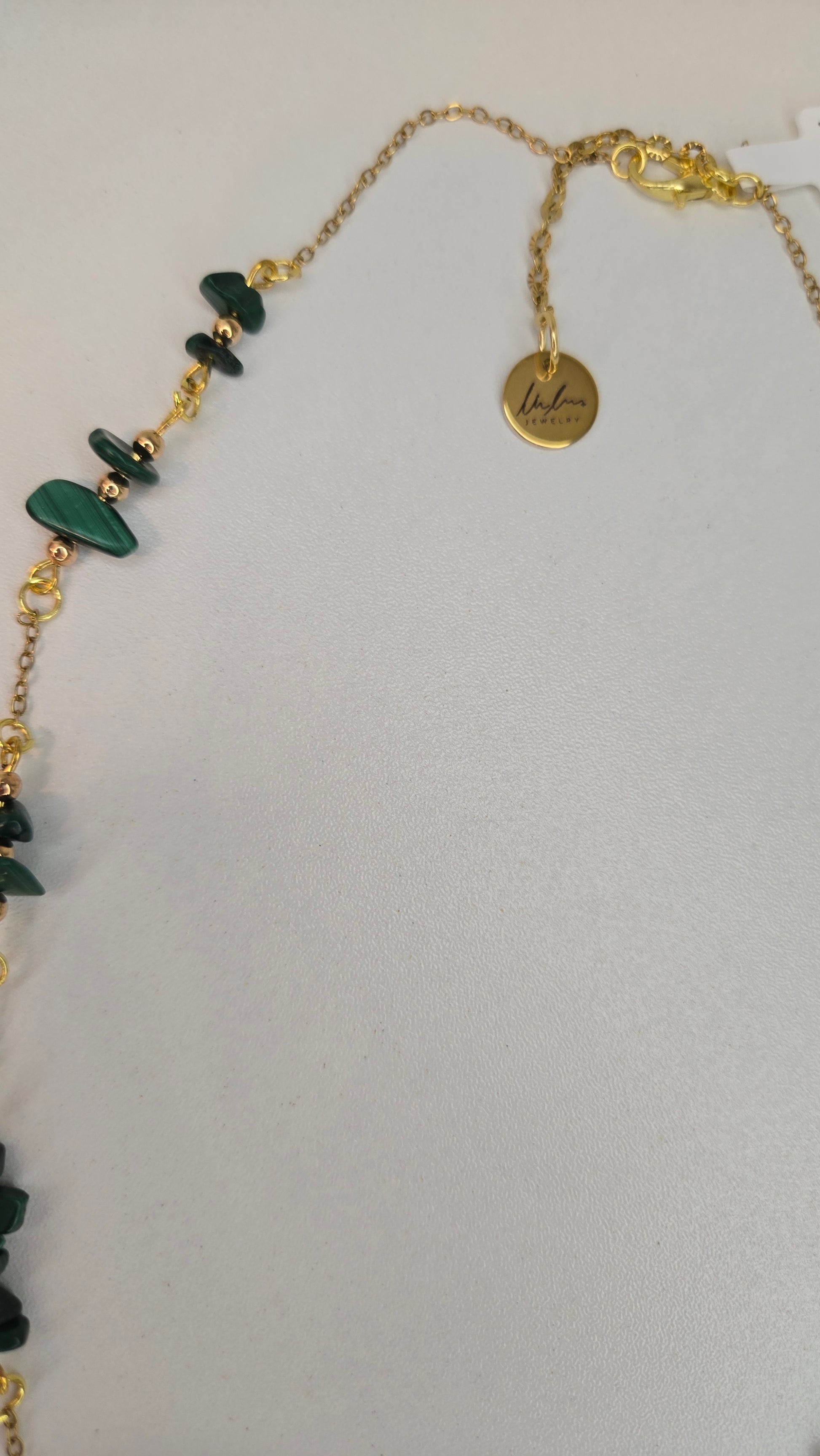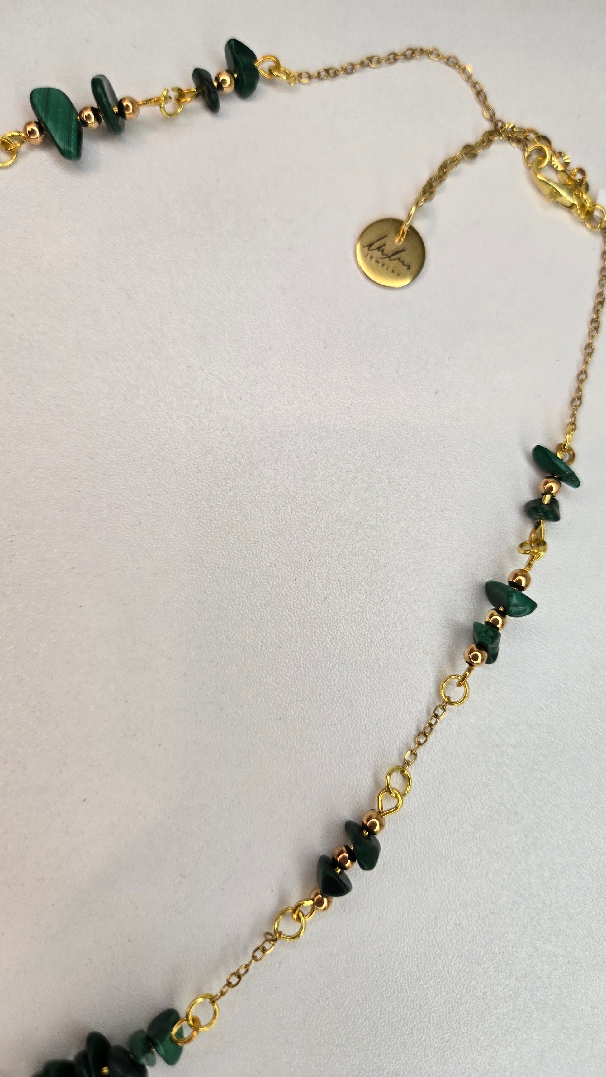 An elegant necklace crafted with natural malachite beads and a gold-tone chain, featuring a minimal and refined design suitable for both everyday wear and elegant looks.