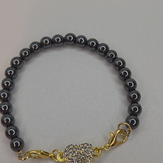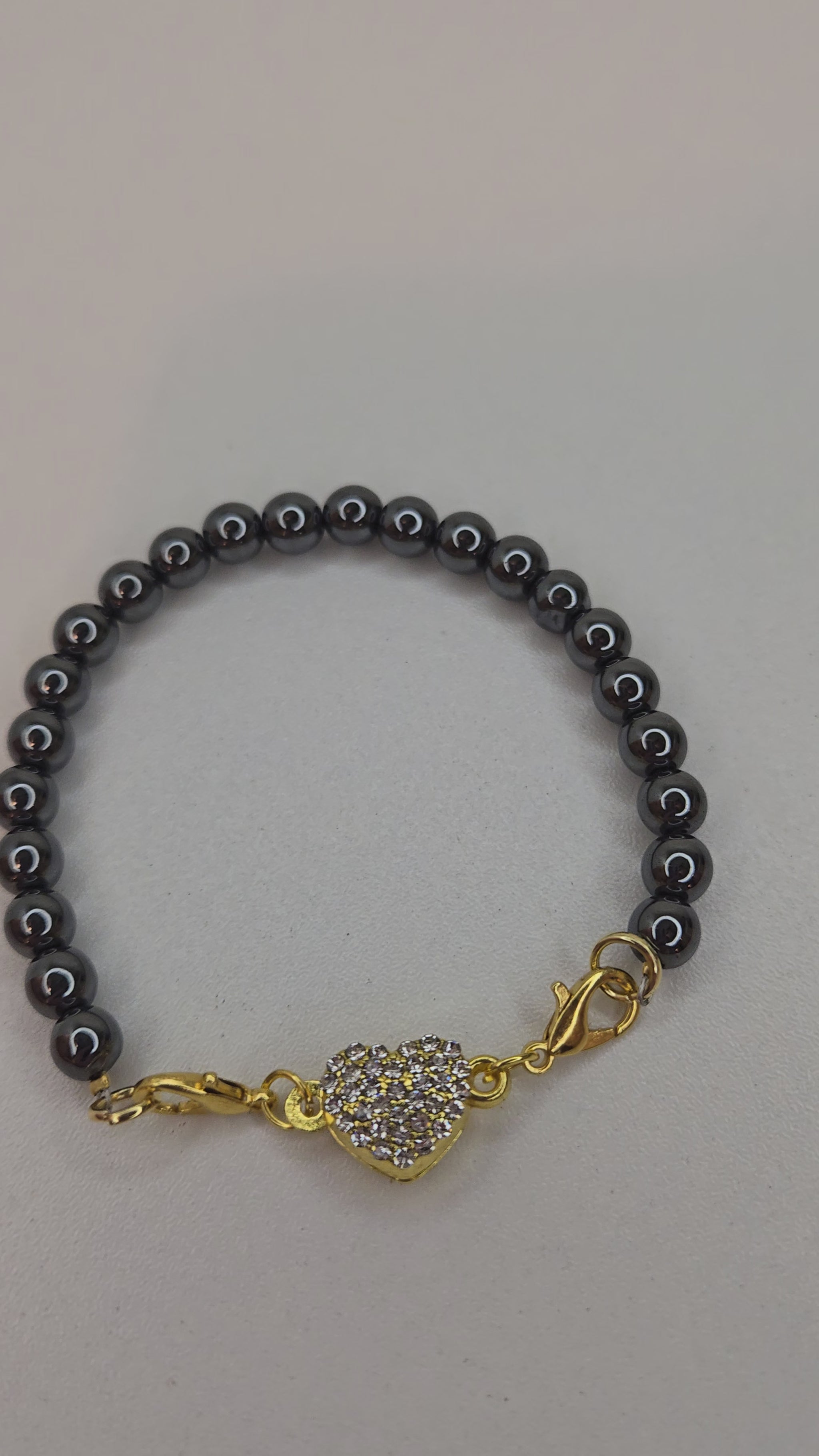 A sleek bracelet crafted from polished hematite beads, highlighted by a sparkling heart charm with gold-tone accents. This piece blends modern elegance with a touch of romance, making it perfect for everyday wear or a meaningful gift.