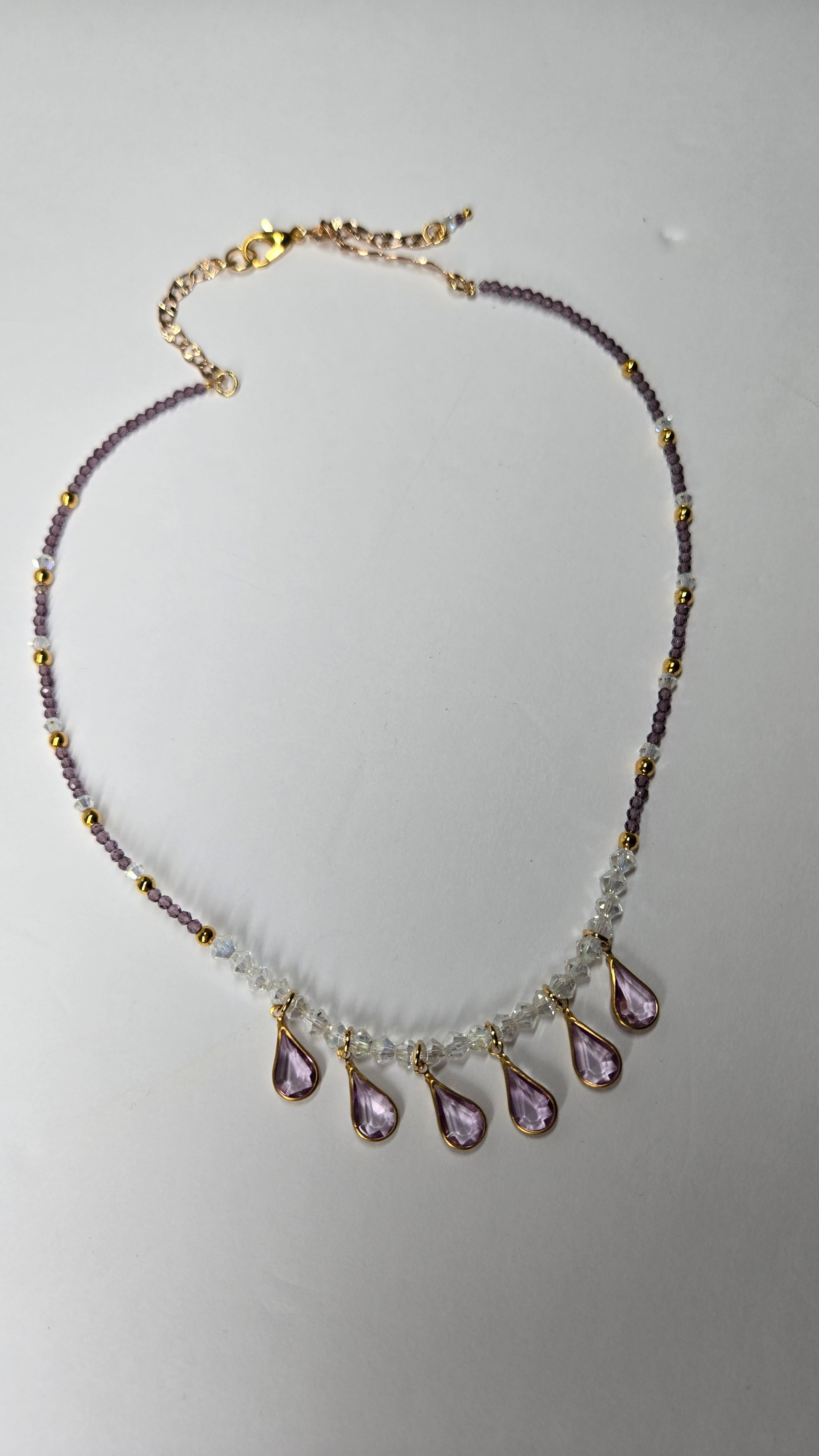 A delicate handmade necklace featuring light lavender teardrop crystals with golden frames and clear crystal beads. Its soft glow and feminine charm make it the perfect piece for romantic evenings or elegant daytime looks.