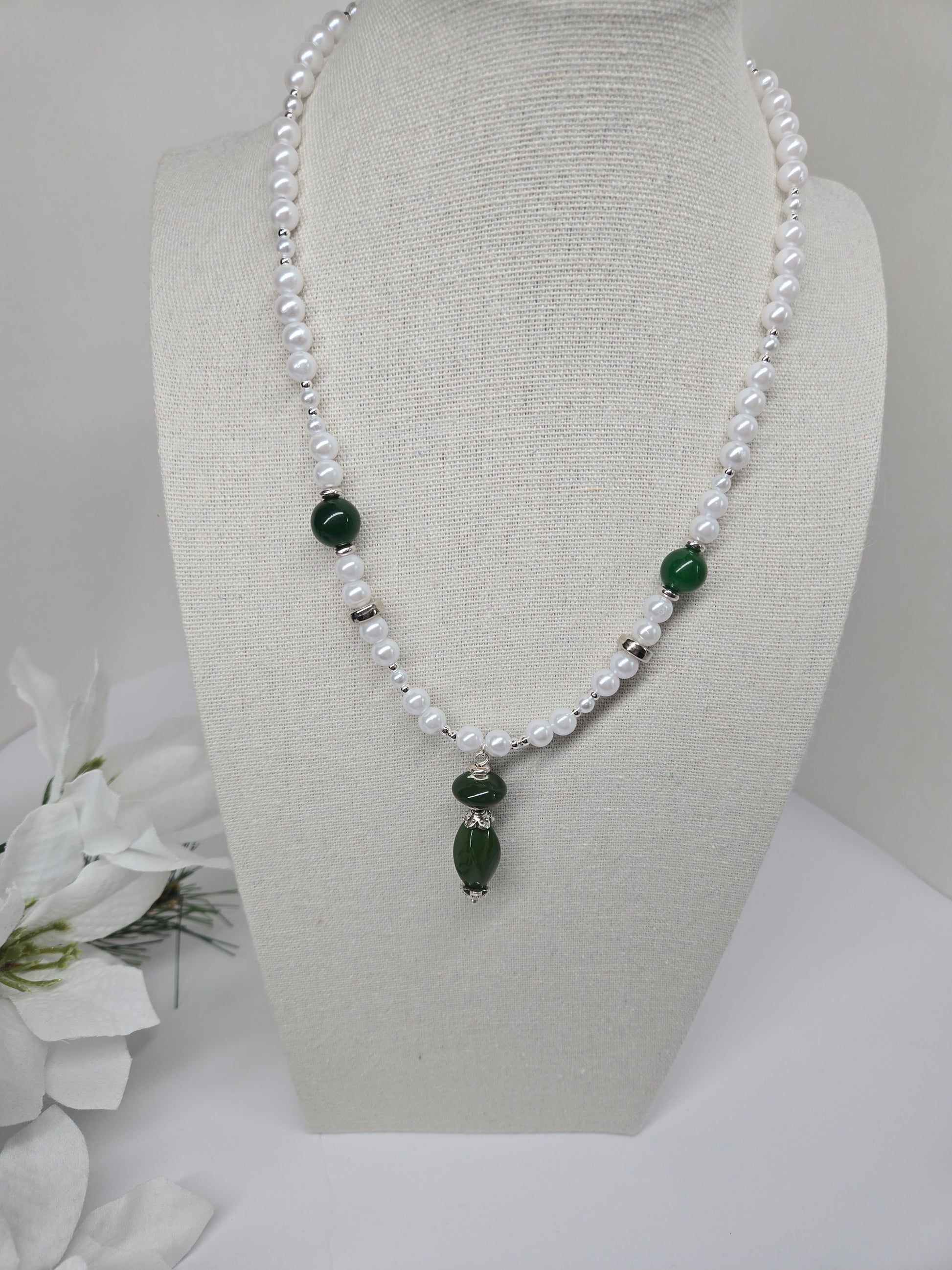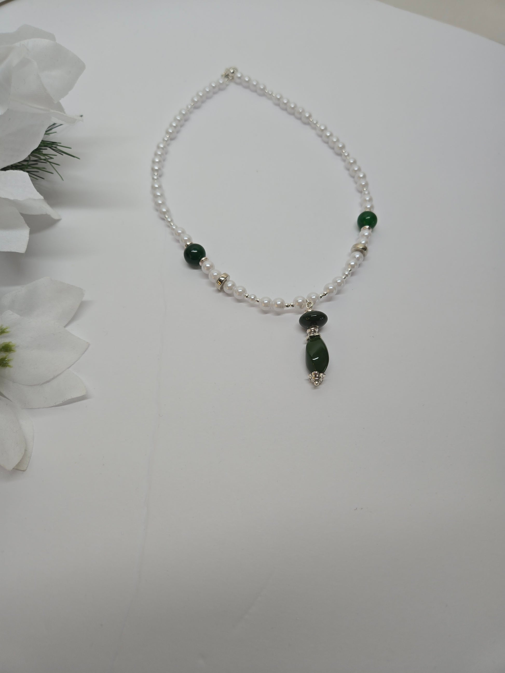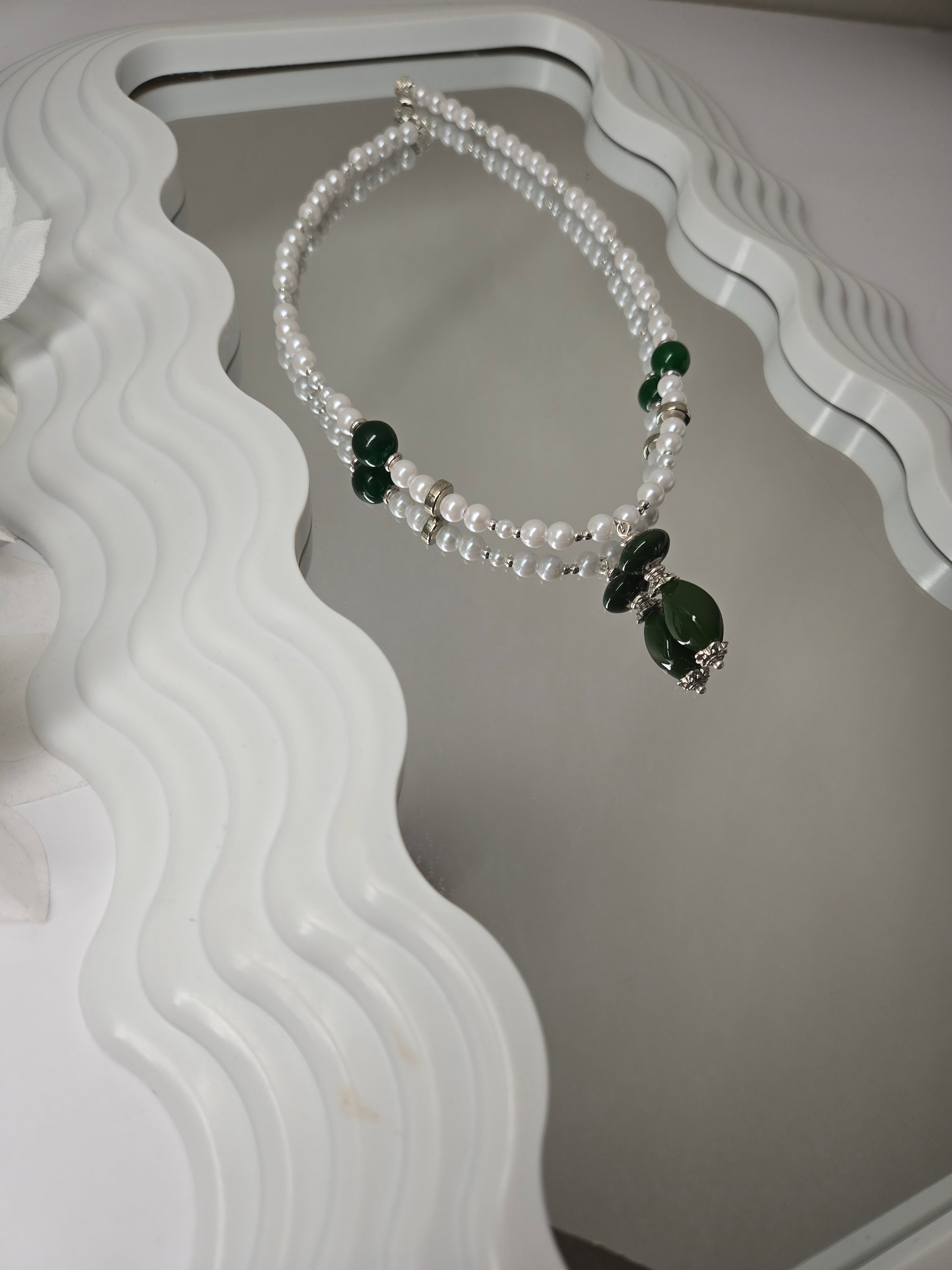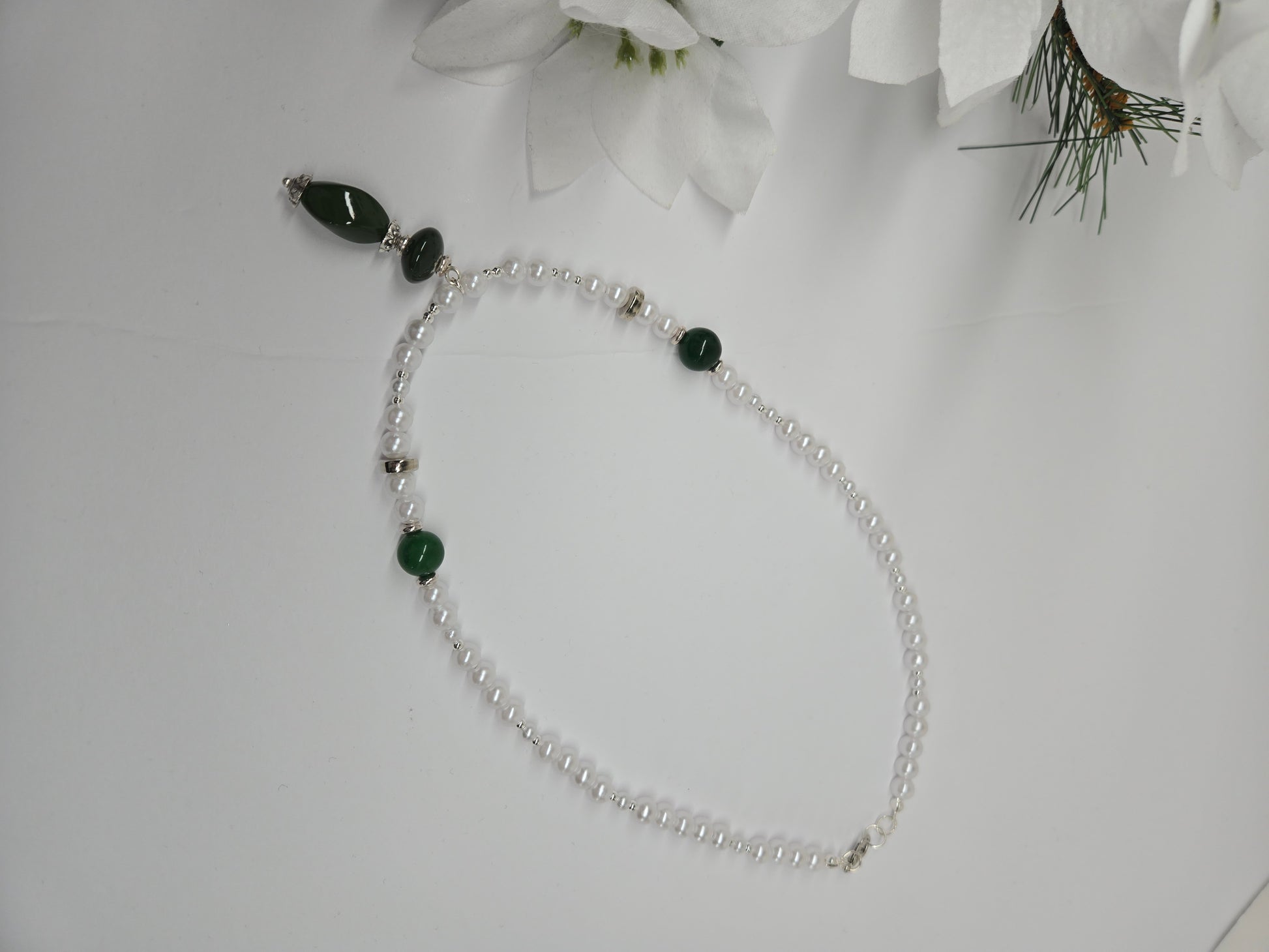 An elegant necklace crafted from soft white pearls, accented with deep green stones and finished with a unique central pendant. A timeless design inspired by nature perfect for women who appreciate calm elegance and natural charm.