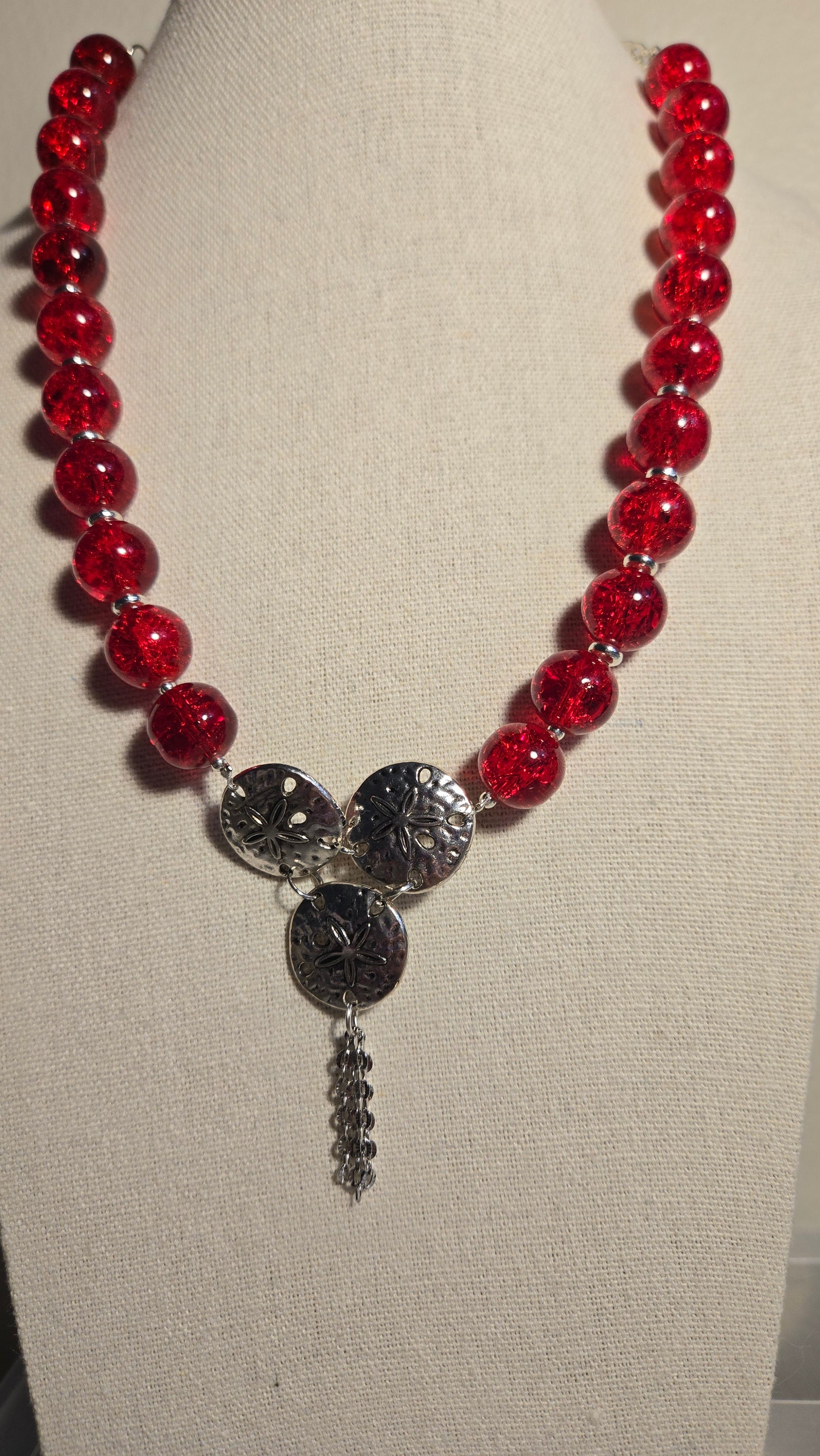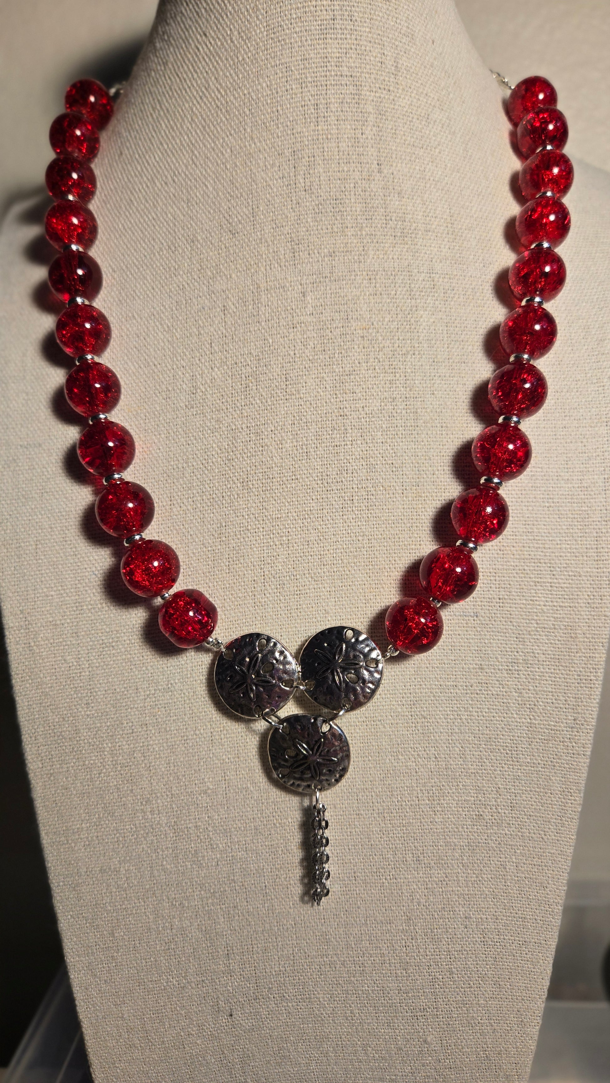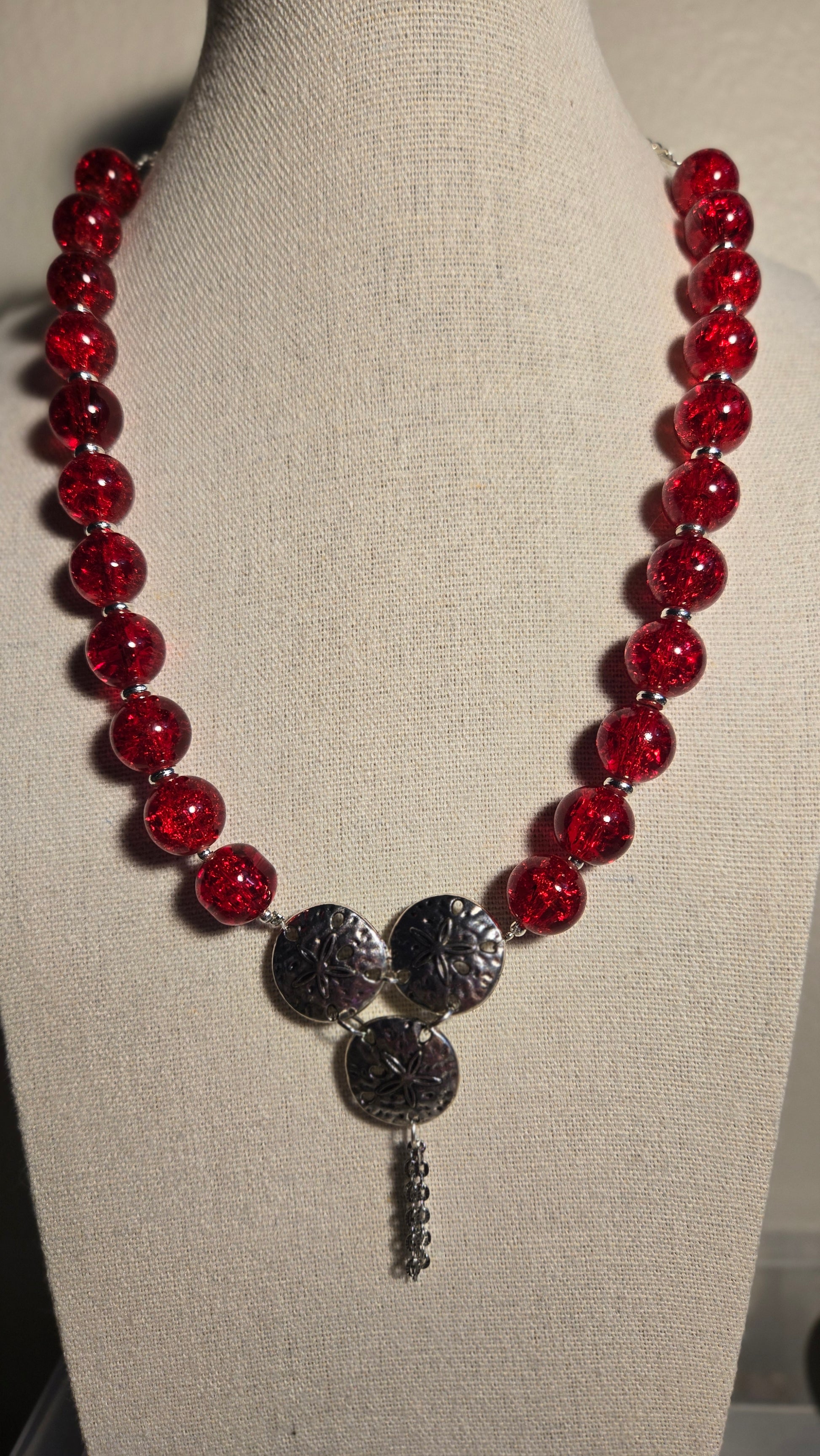A luxurious necklace adorned with radiant red beads symbolizing strength and passion, accented with engraved silver details that add a touch of artistry and authenticity. Its bold design blends modern and classic elegance, making it the perfect piece for a confident and graceful woman.
