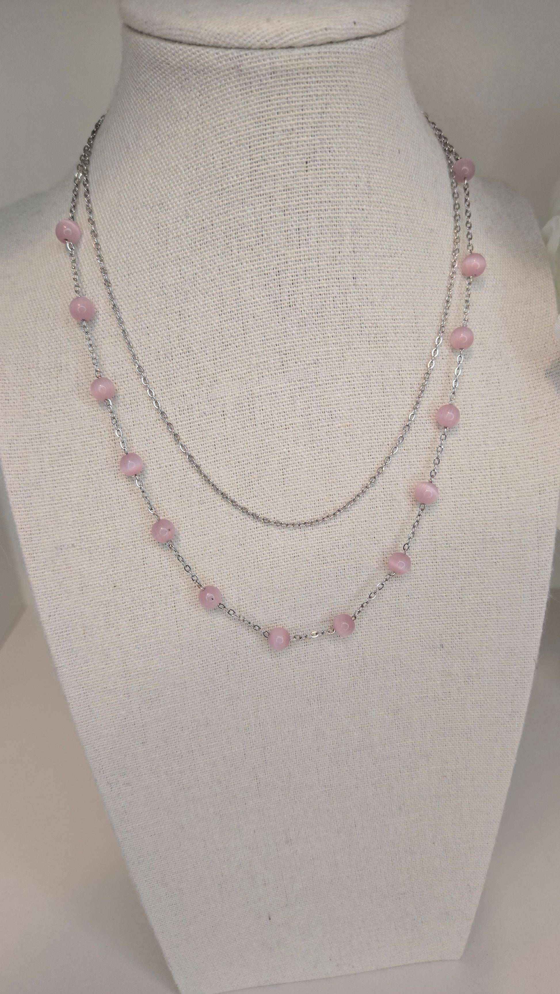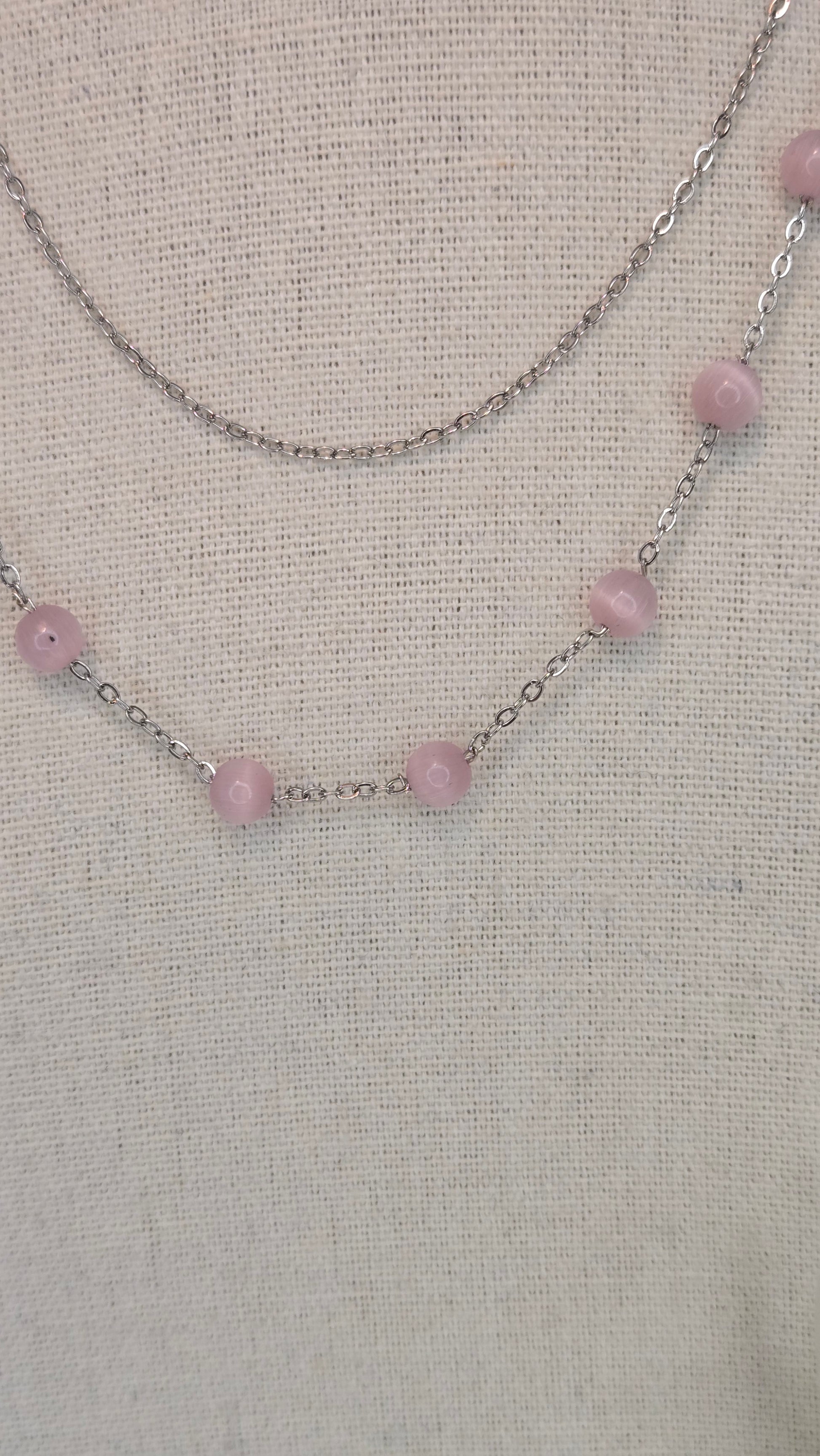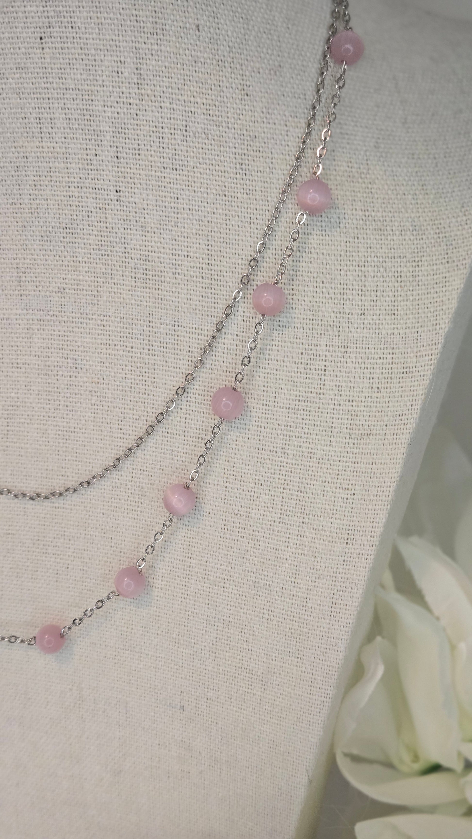 A delicate double-layer necklace crafted with fine silver chains and soft pink glass beads for a gentle, feminine touch. The evenly spaced beads create a refined, minimalist look, making it perfect for everyday wear or elegant layering with other necklaces.