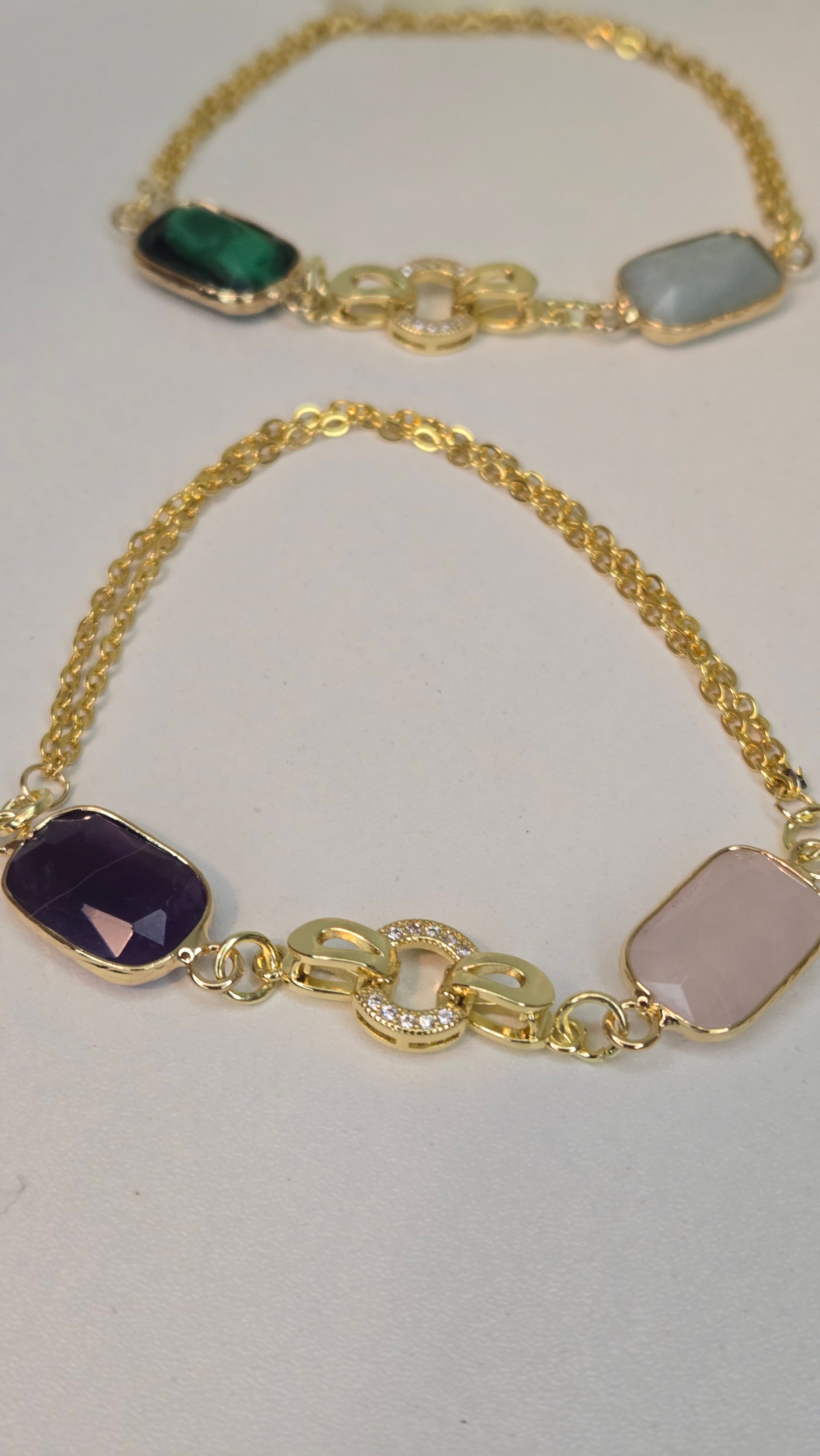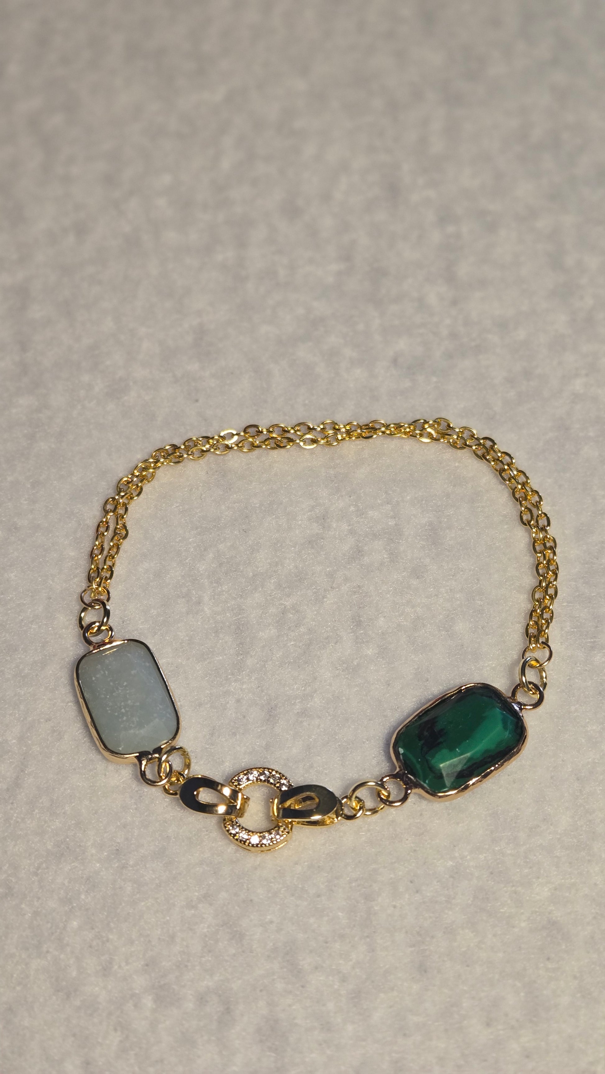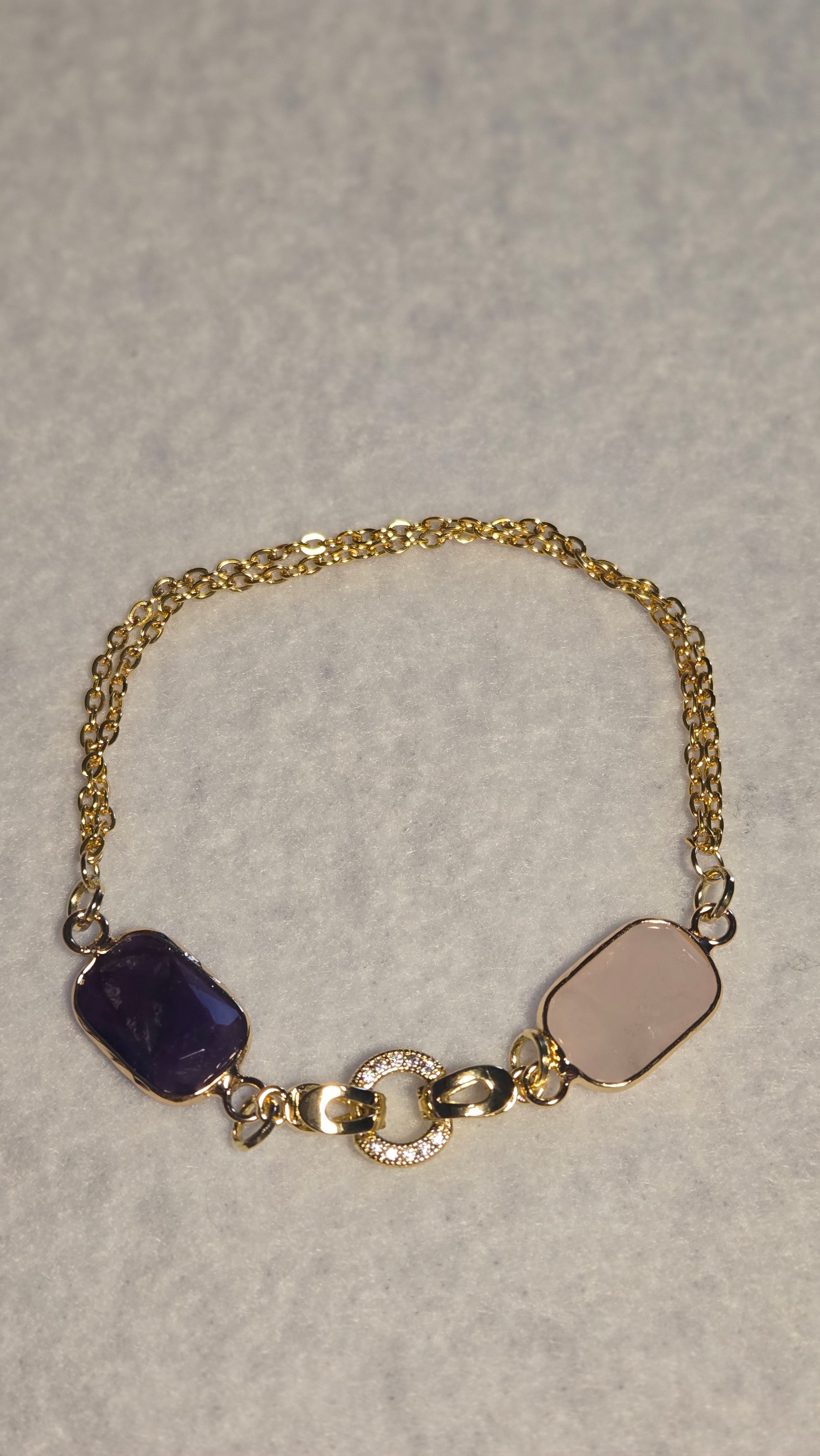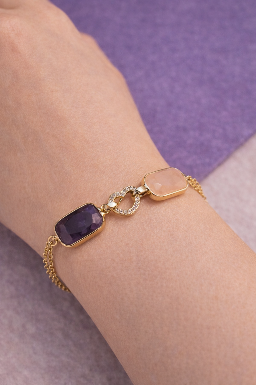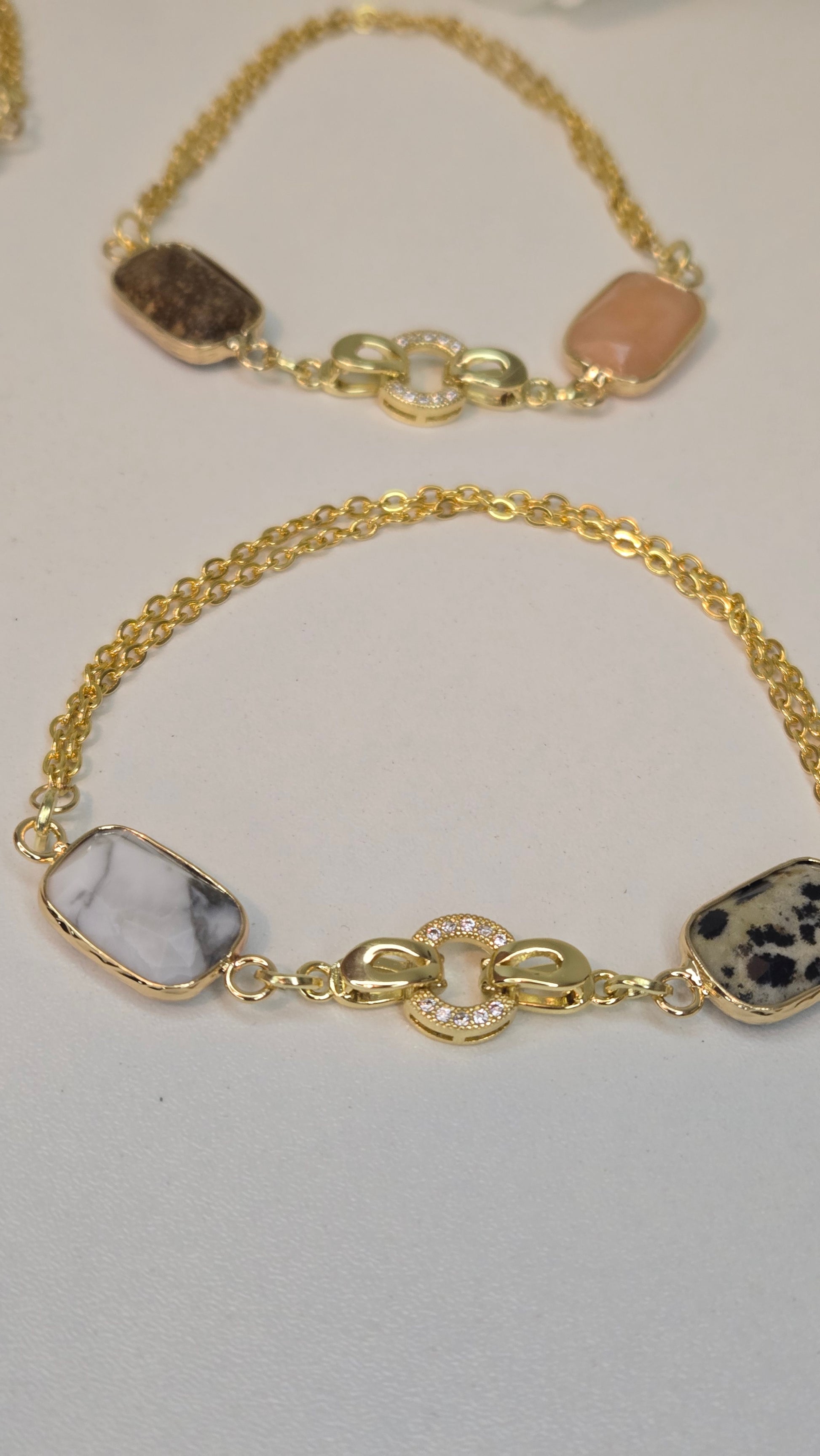 An elegant bracelet featuring polished agate stones in soft rectangular cuts, set in luxurious gold frames and connected by a distinctive central link with subtle sparkling accents. The depth of the agate’s color gives the piece a strong yet warm presence, while the double gold chain adds graceful fluidity around the wrist.