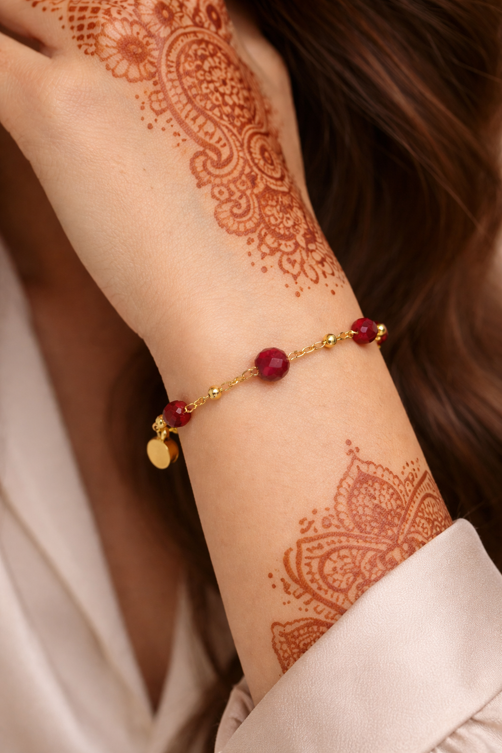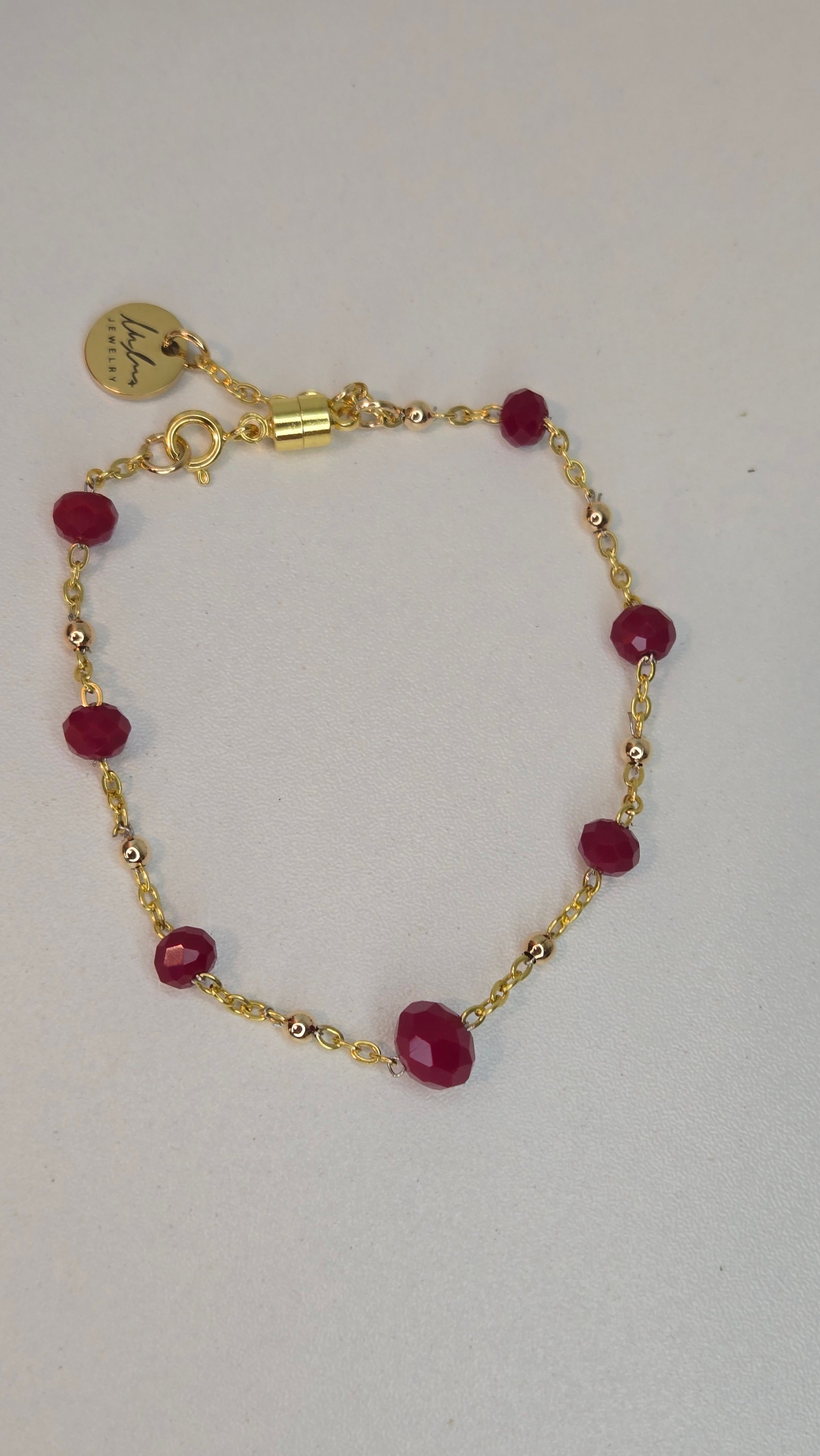 A delicate bracelet featuring faceted ruby-red crystal beads linked with a gold-tone stainless steel chain. Finished with a secure magnetic clasp, it offers a perfect balance of elegance and simplicity for everyday wear or special occasions.