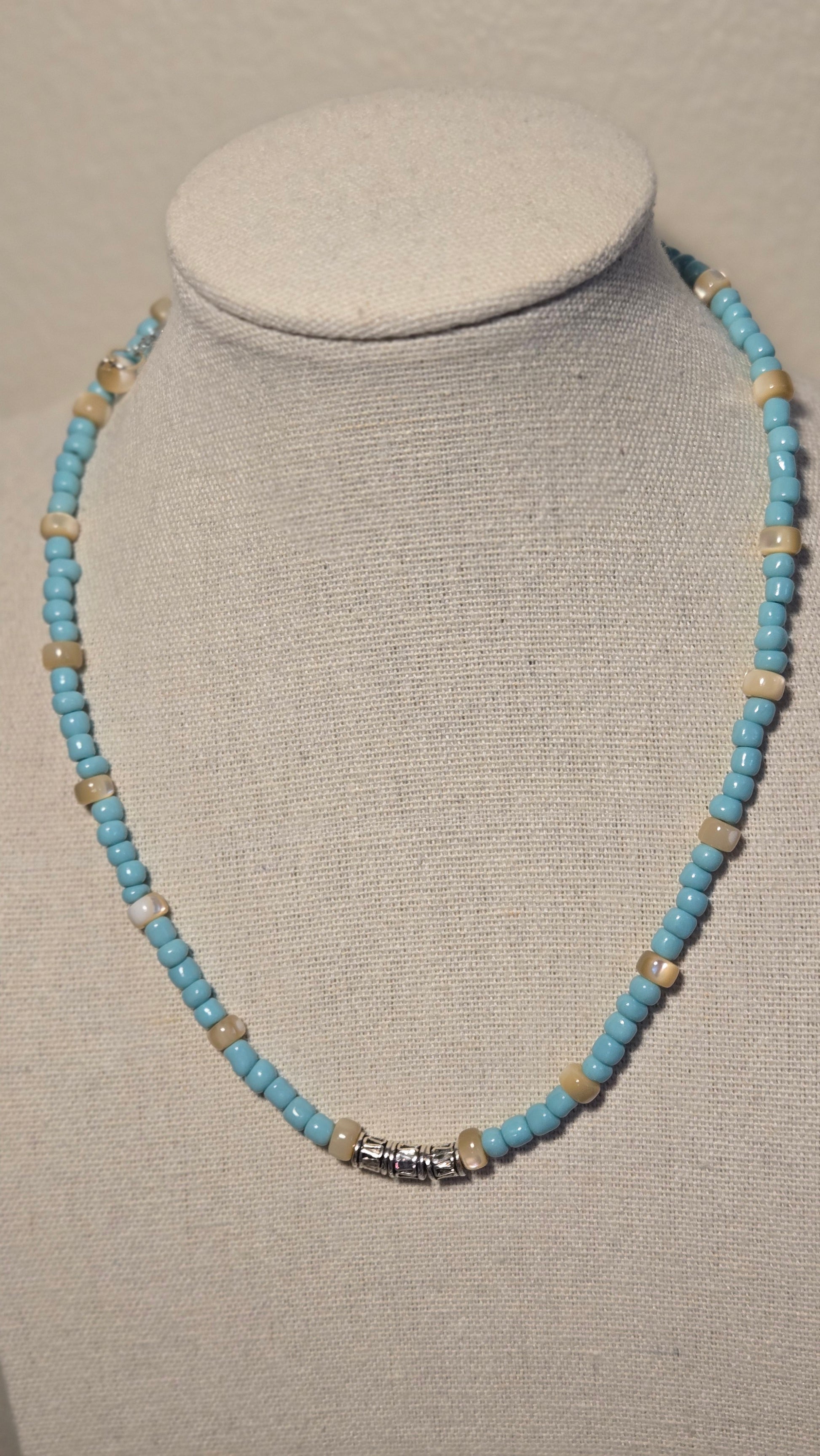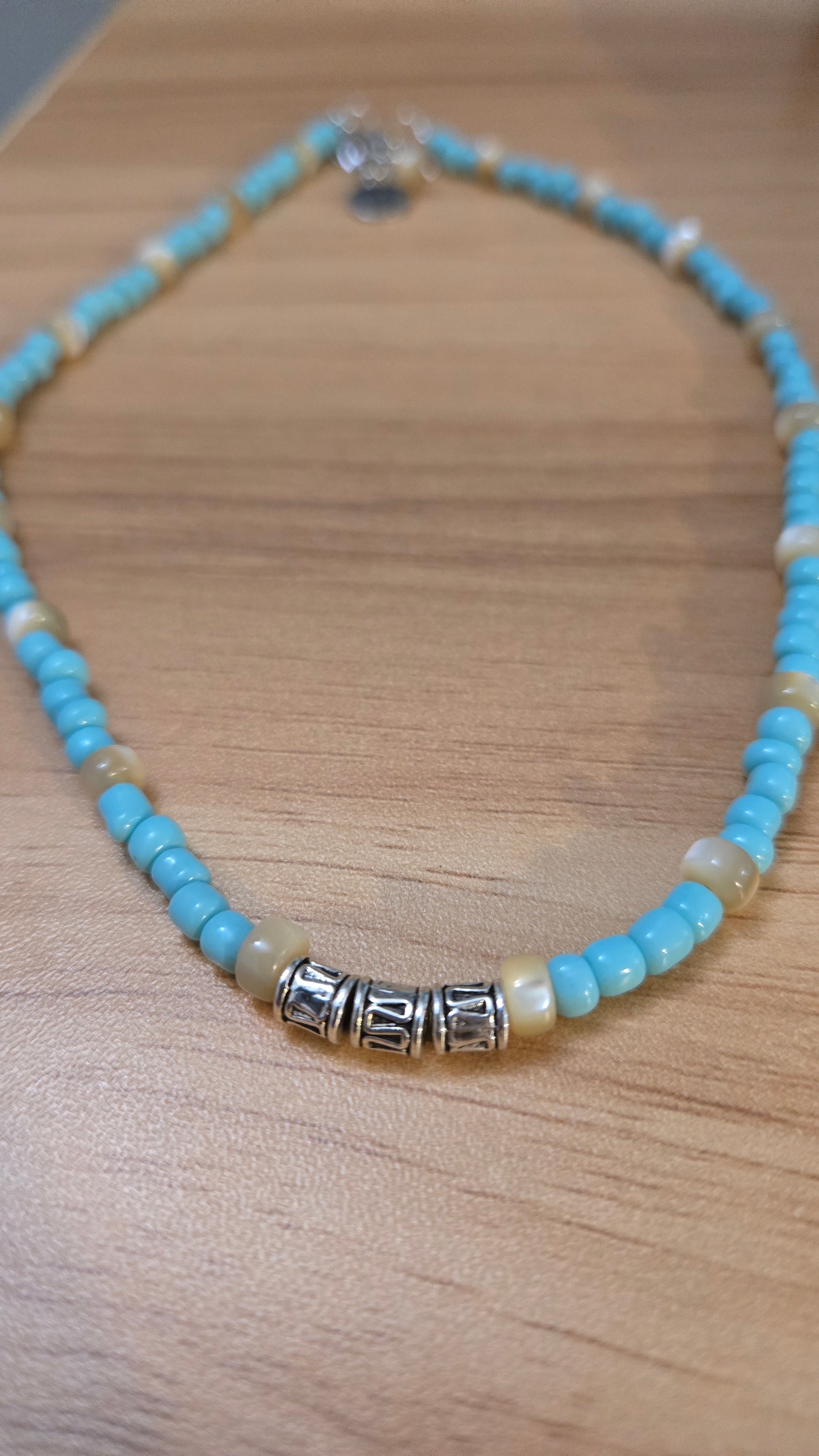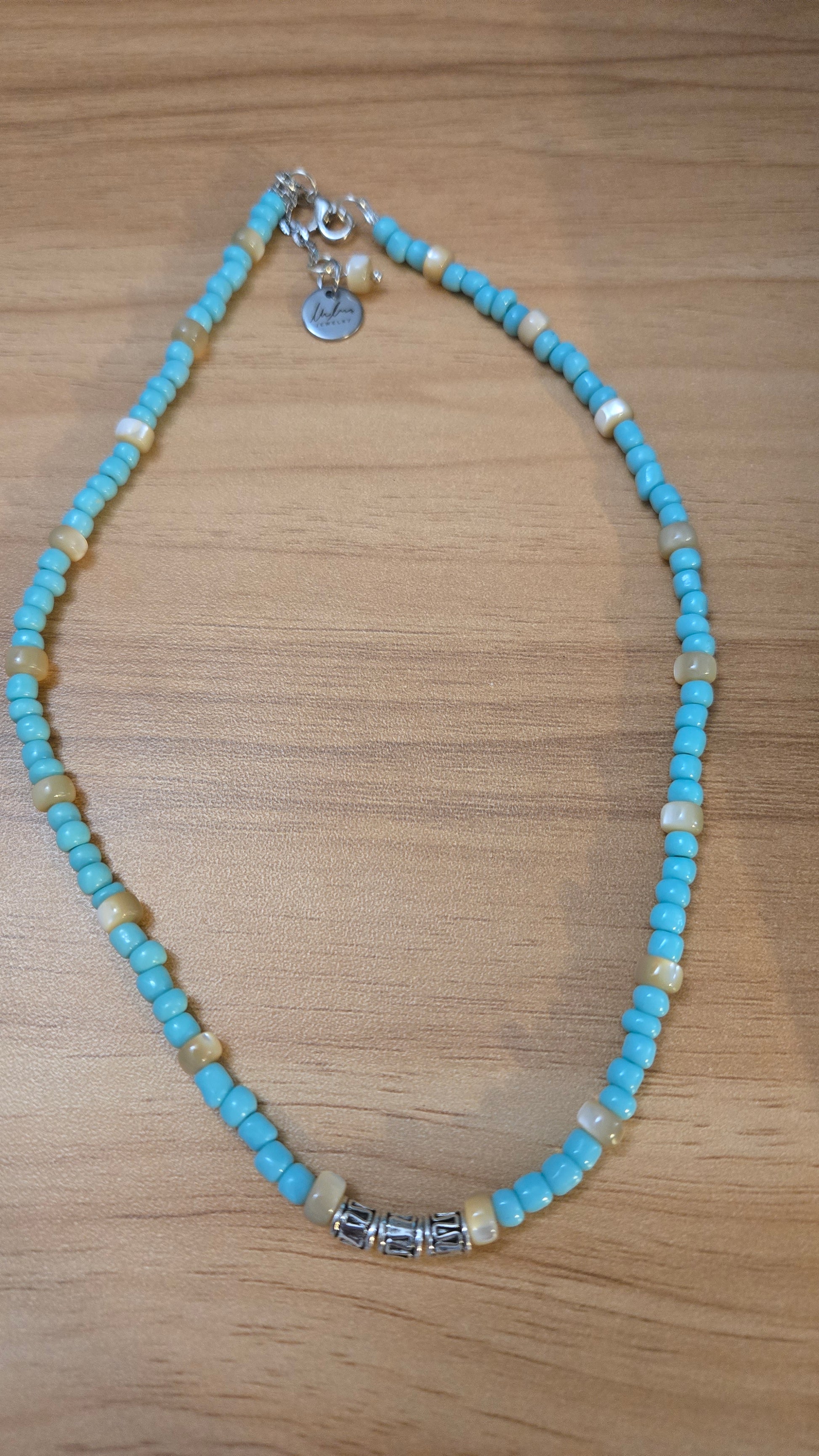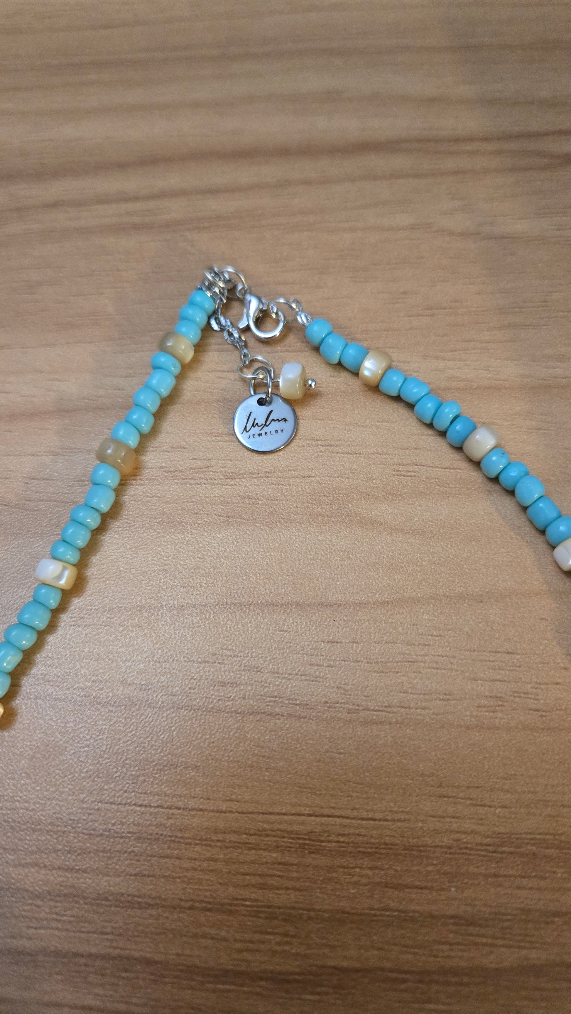 A necklace inspired by the colors of the sea and sand, featuring a mix of soft turquoise and warm ivory beads accented with subtle silver details. Its minimalist, modern design makes it perfect for casual or summer looks, adding a touch of calm elegance and coastal charm.