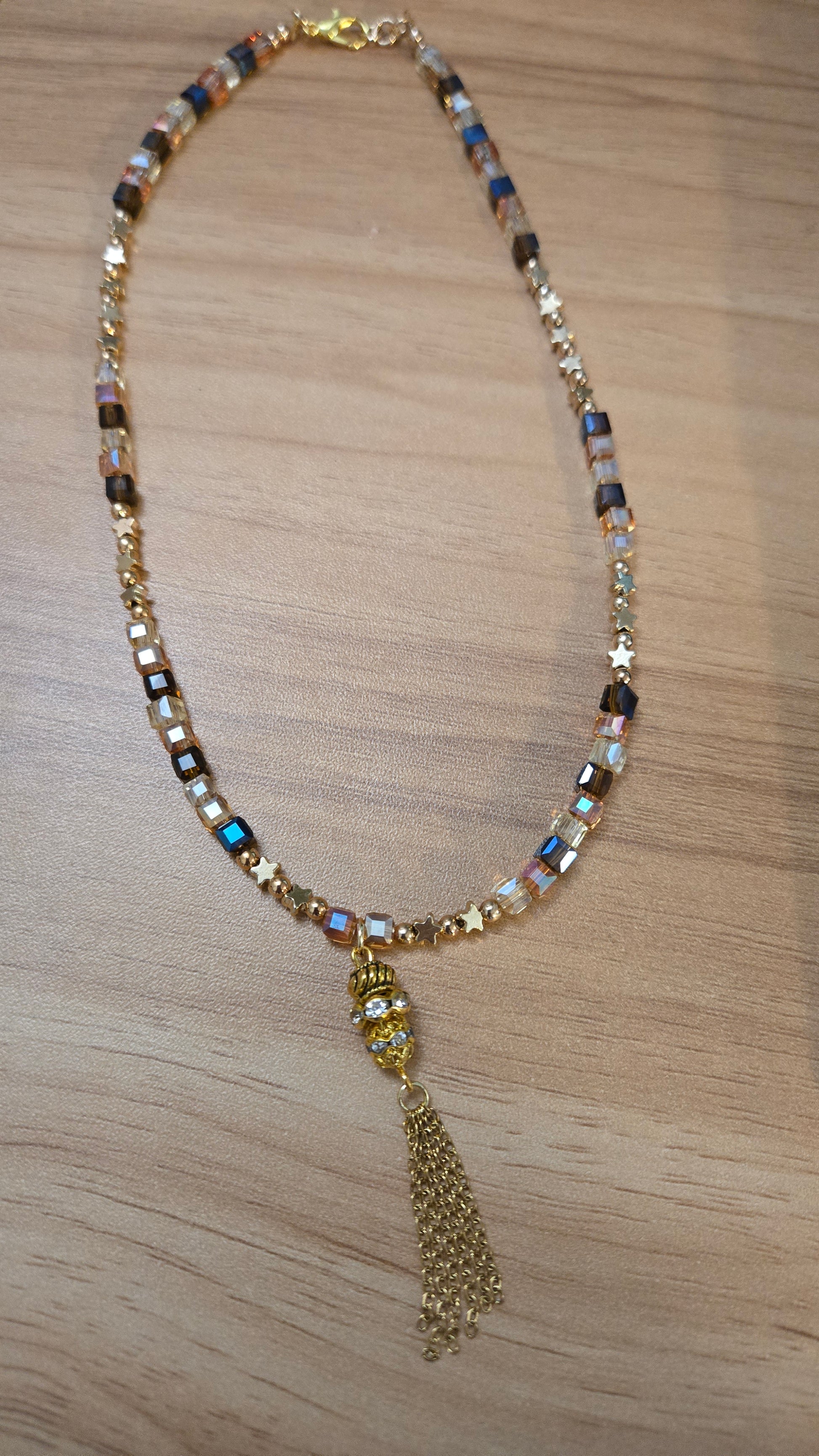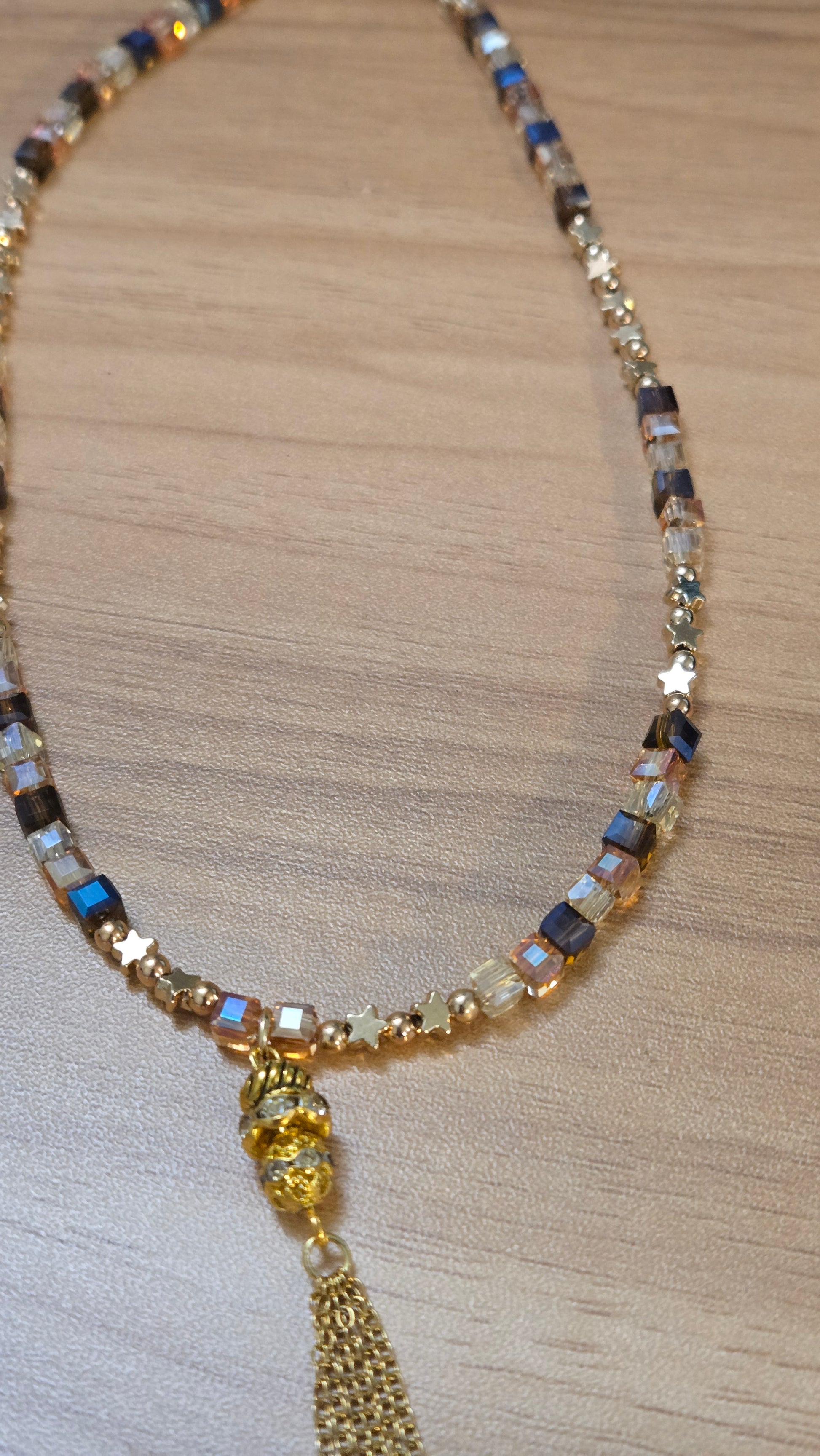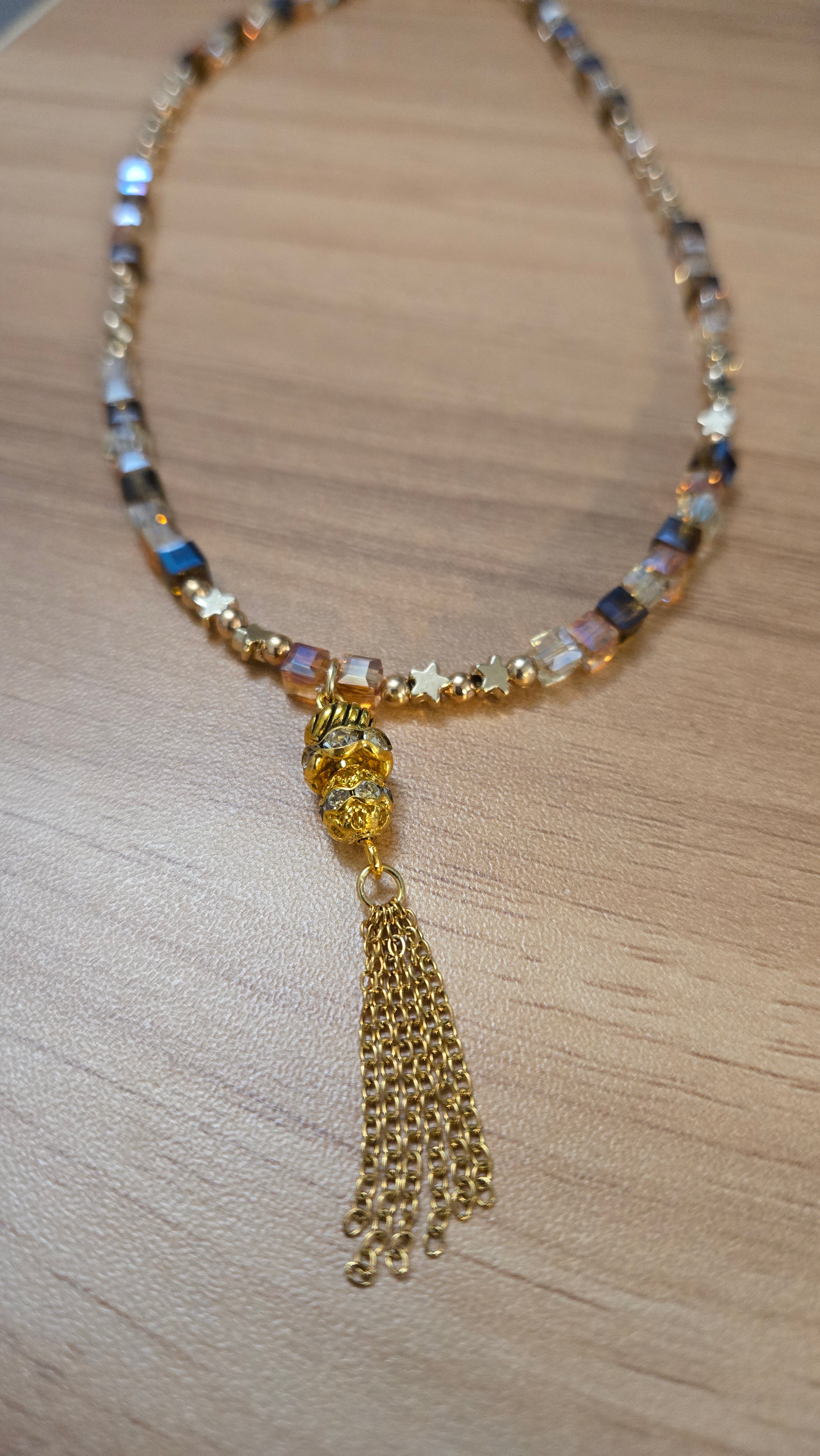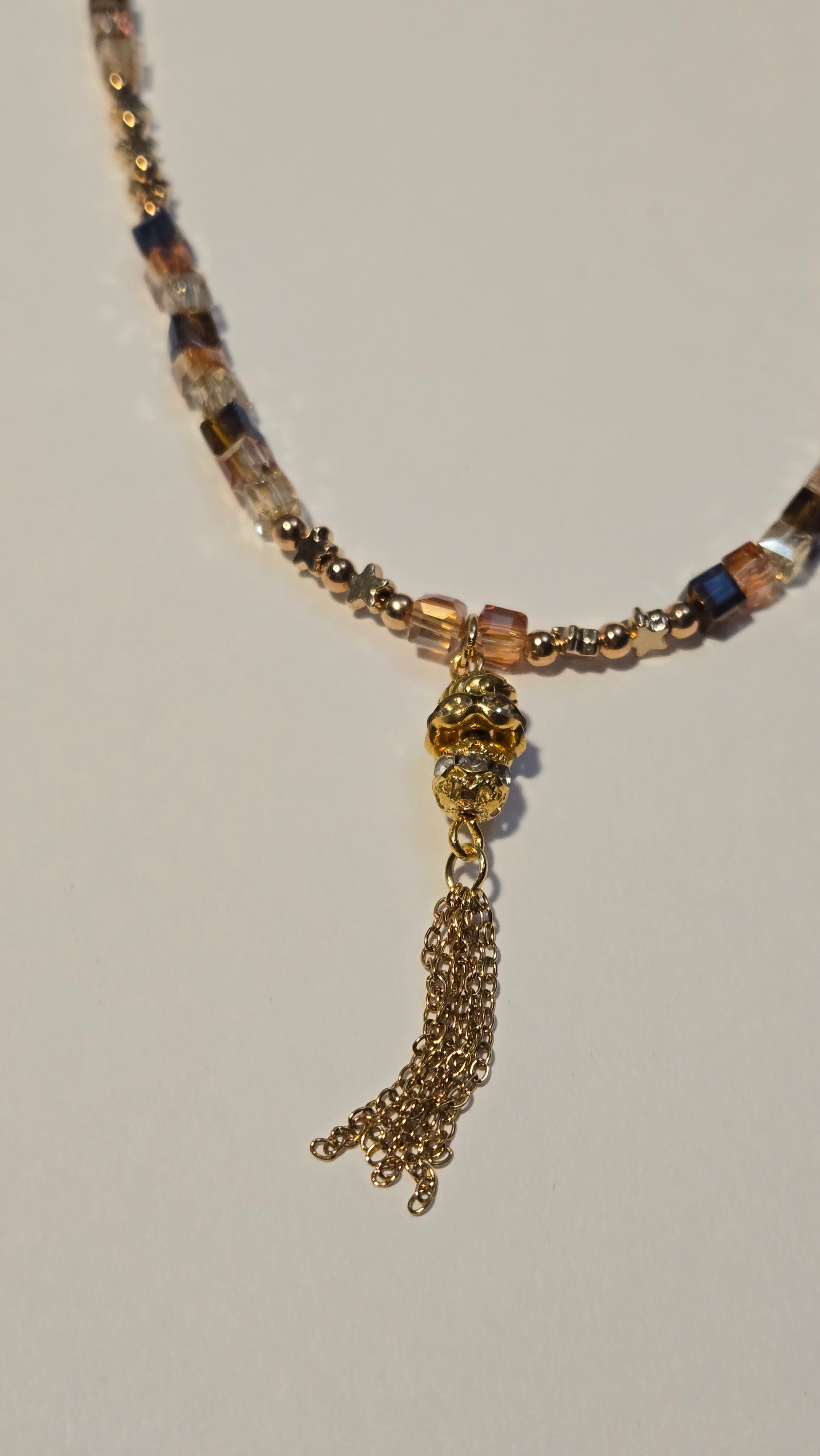 A luxurious necklace featuring a geometric design that combines shimmering crystal cubes in golden and amber sunset tones with delicate golden accents. A crystal-studded charm with fine golden tassels hangs gracefully at the center, adding motion and elegance. The perfect statement piece to elevate your evening look with warmth and sophistication.
