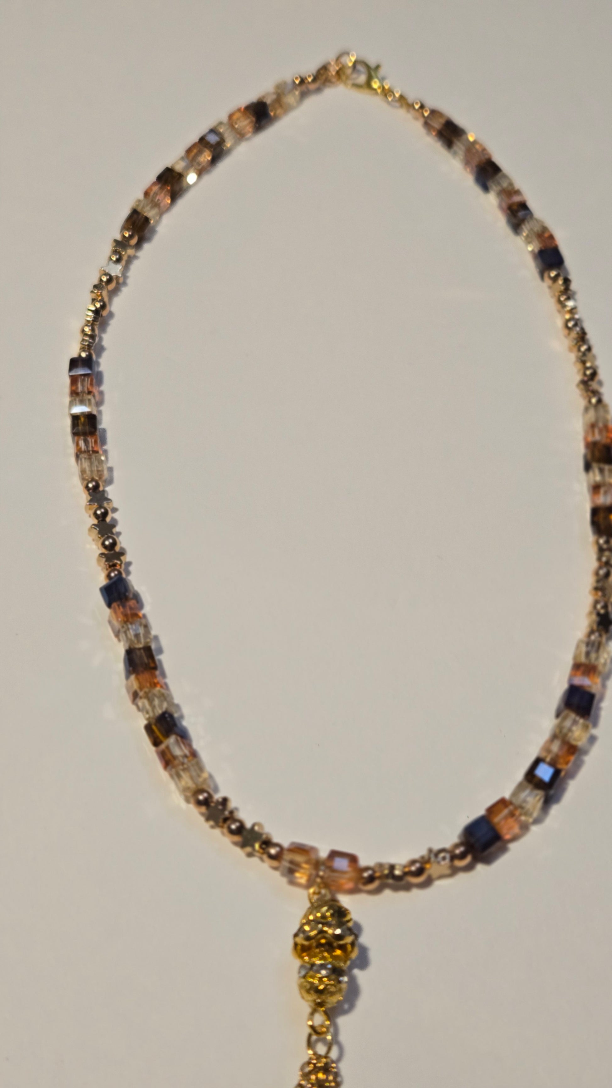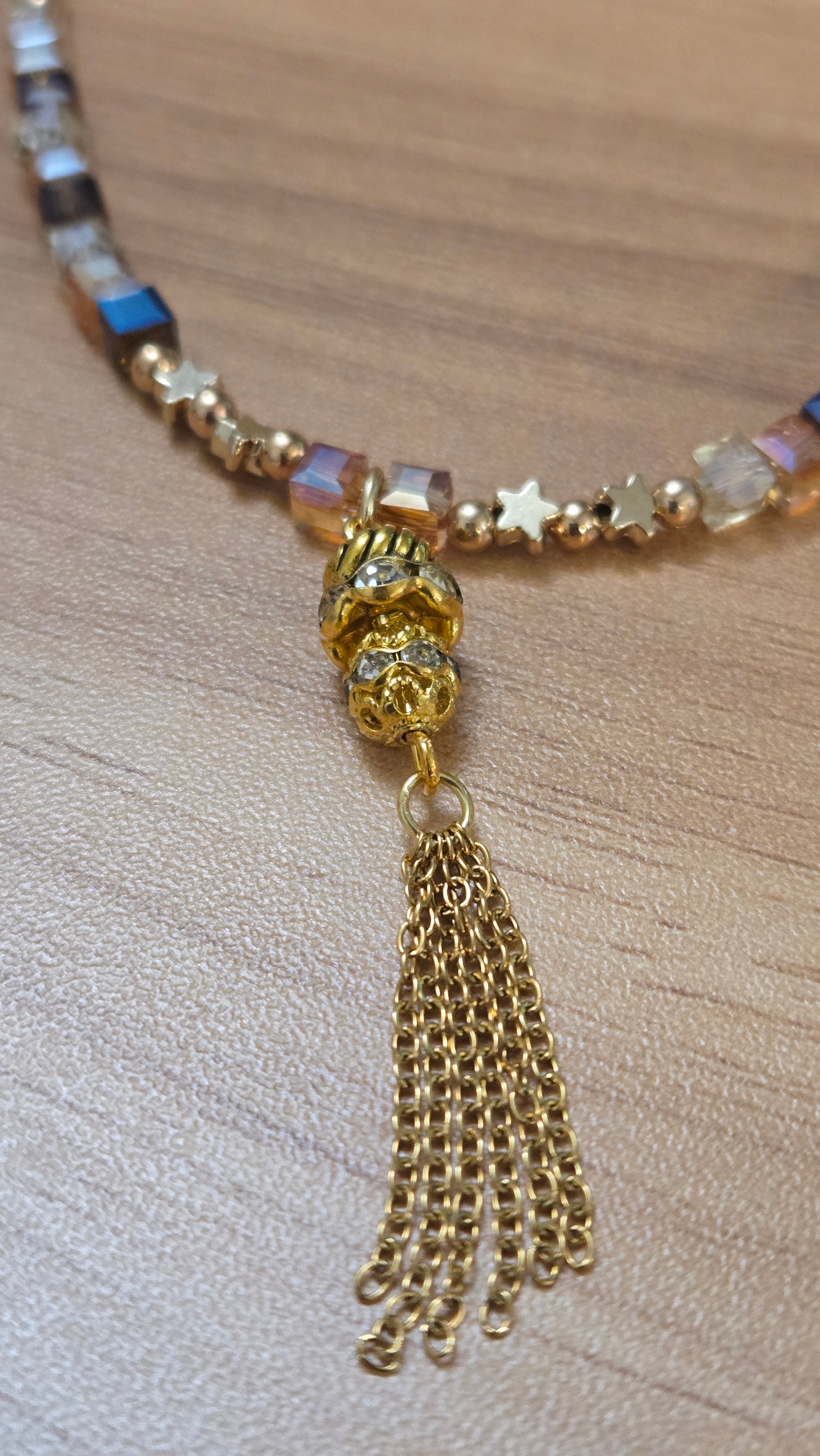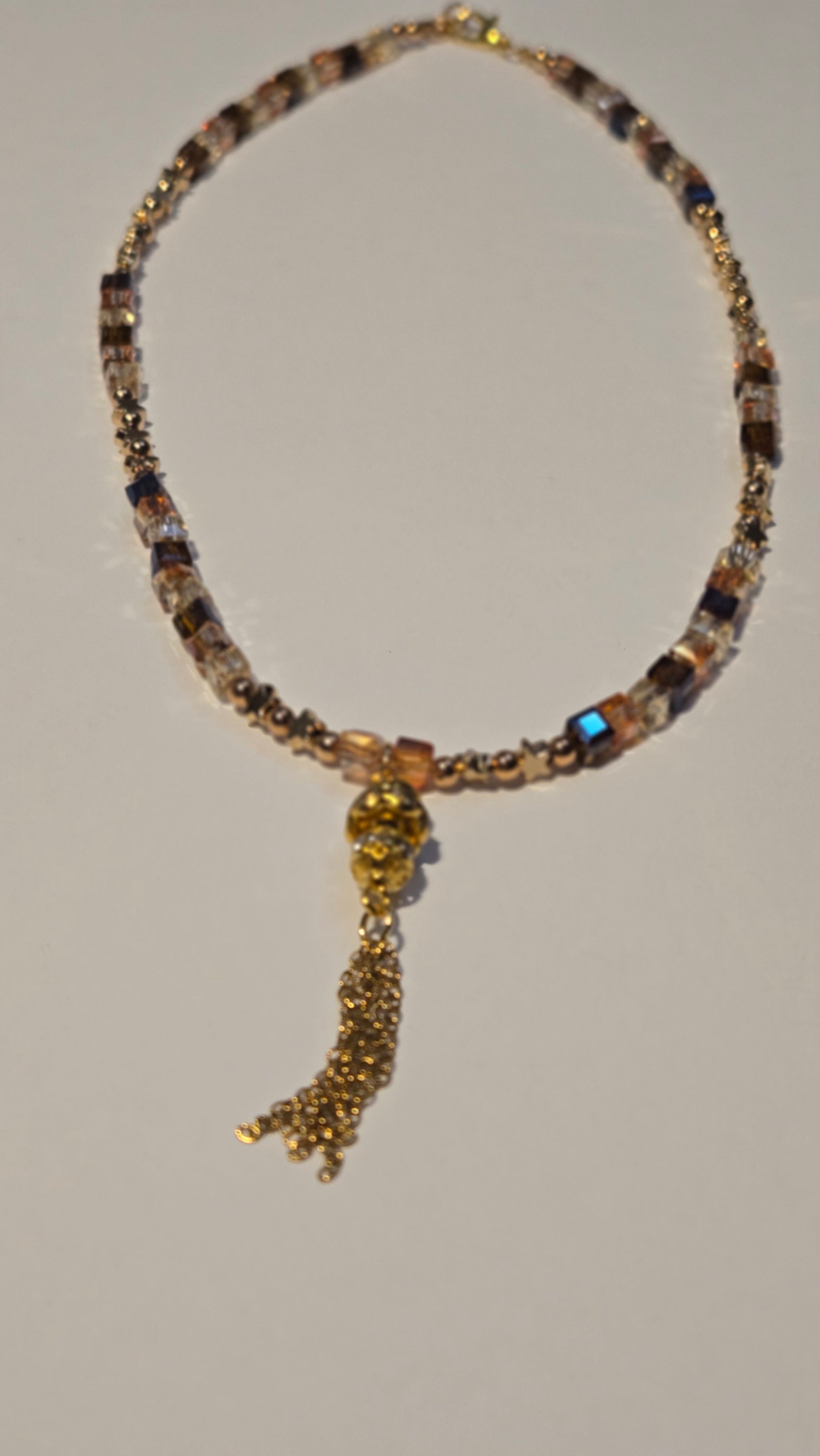 A luxurious necklace featuring a geometric design that combines shimmering crystal cubes in golden and amber sunset tones with delicate golden accents. A crystal-studded charm with fine golden tassels hangs gracefully at the center, adding motion and elegance. The perfect statement piece to elevate your evening look with warmth and sophistication.