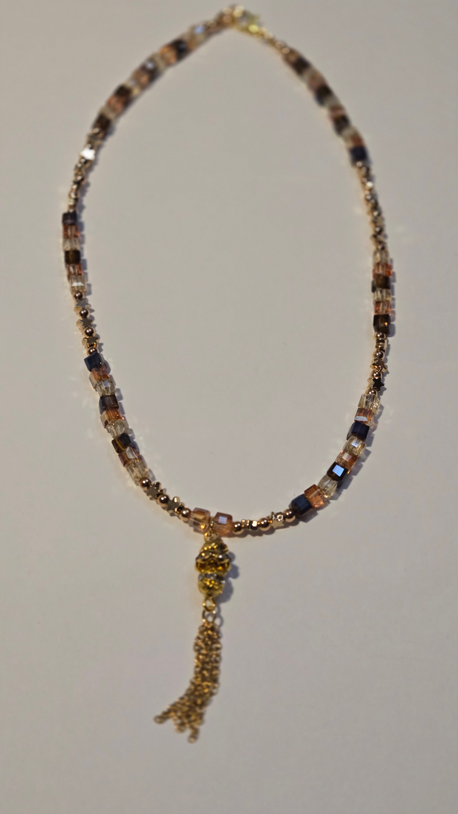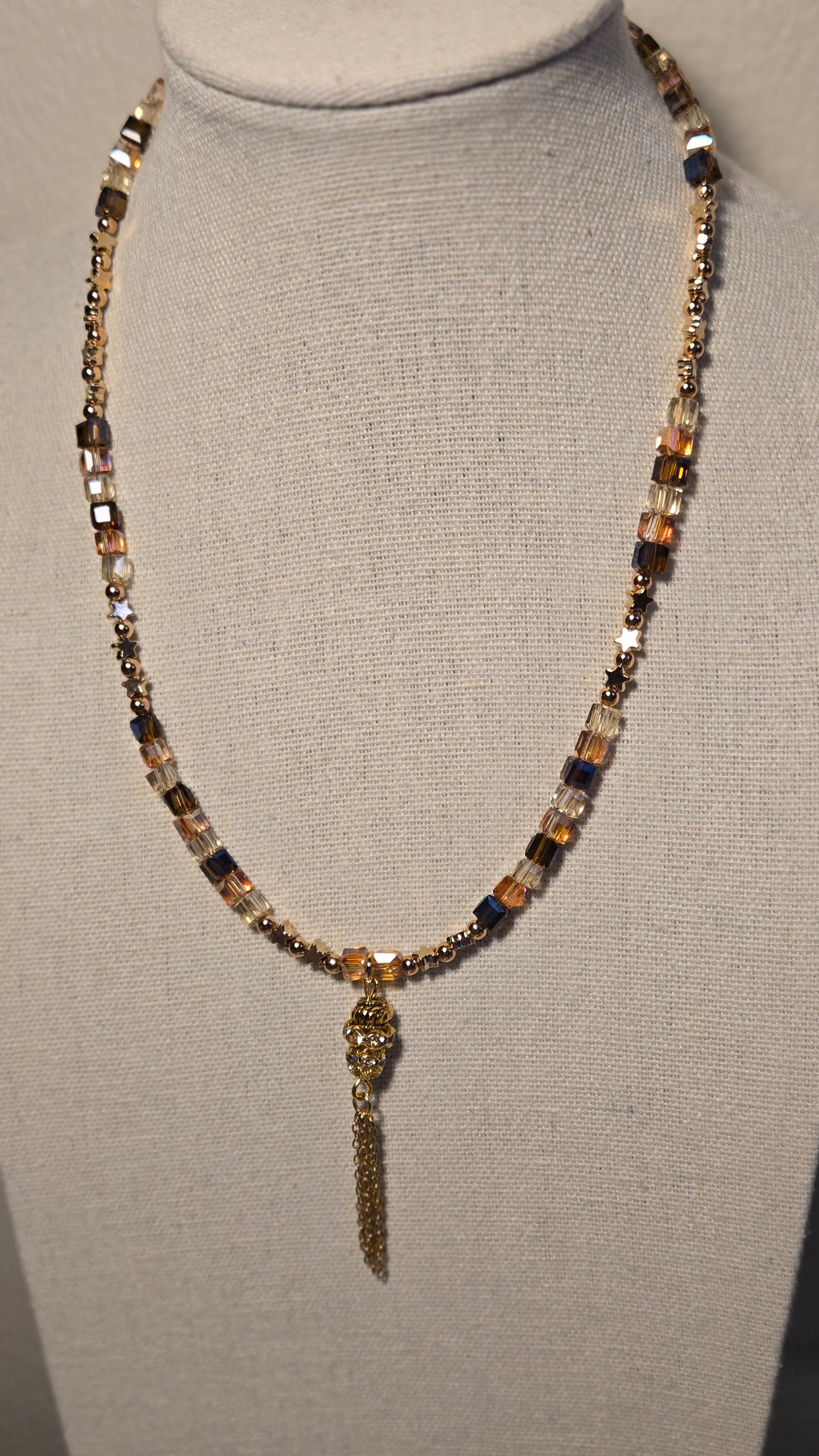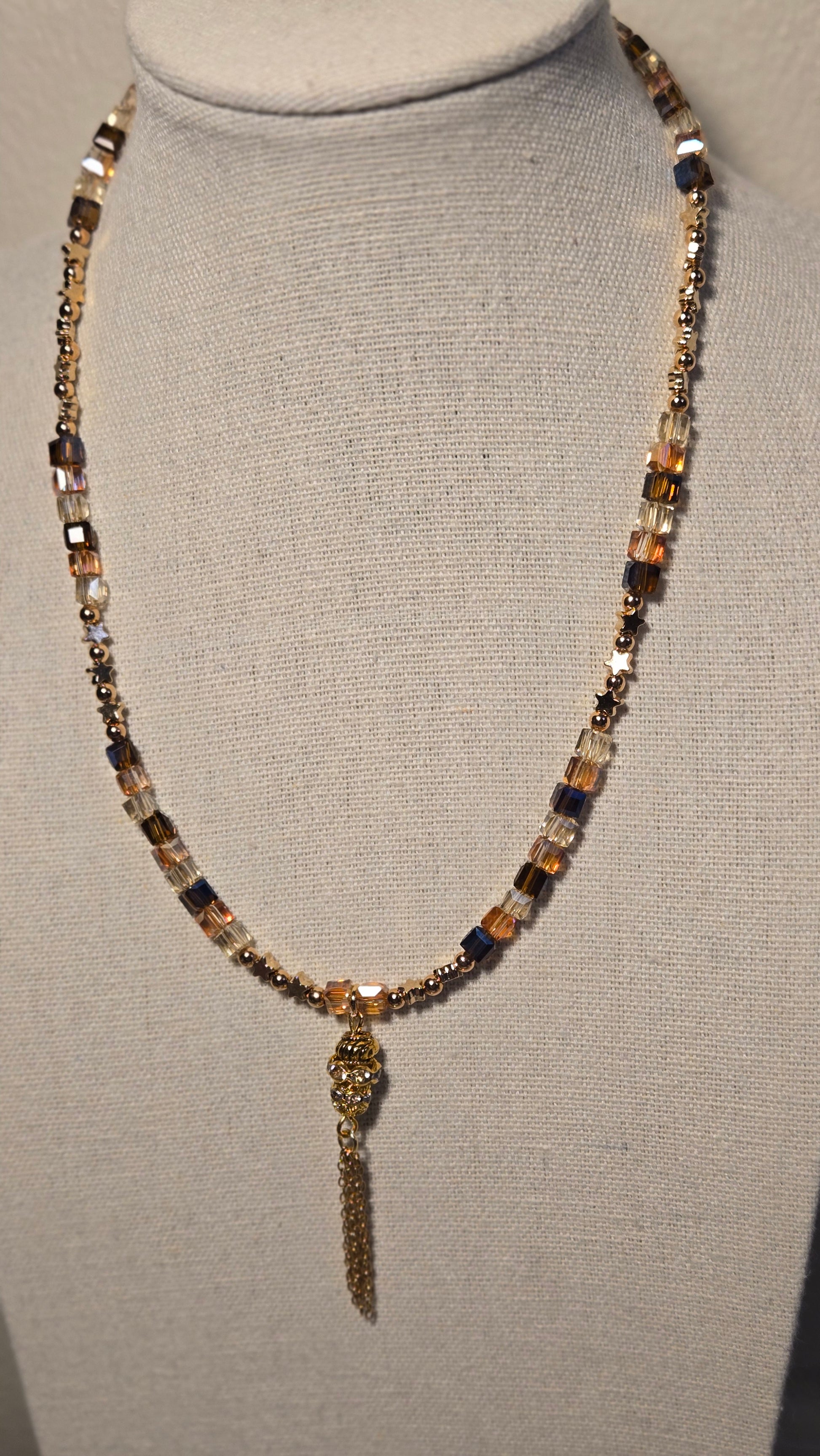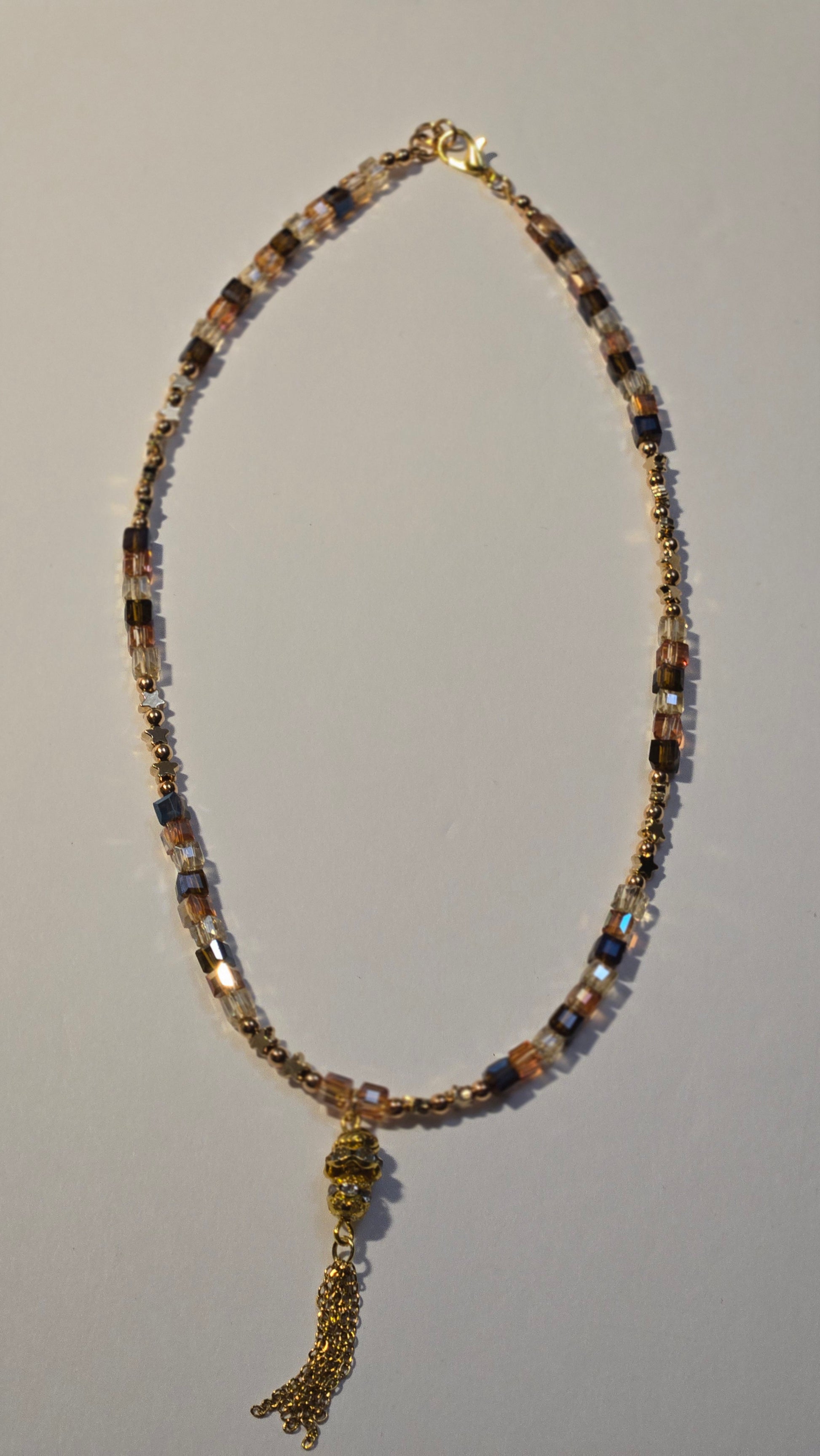 A luxurious necklace featuring a geometric design that combines shimmering crystal cubes in golden and amber sunset tones with delicate golden accents. A crystal-studded charm with fine golden tassels hangs gracefully at the center, adding motion and elegance. The perfect statement piece to elevate your evening look with warmth and sophistication.