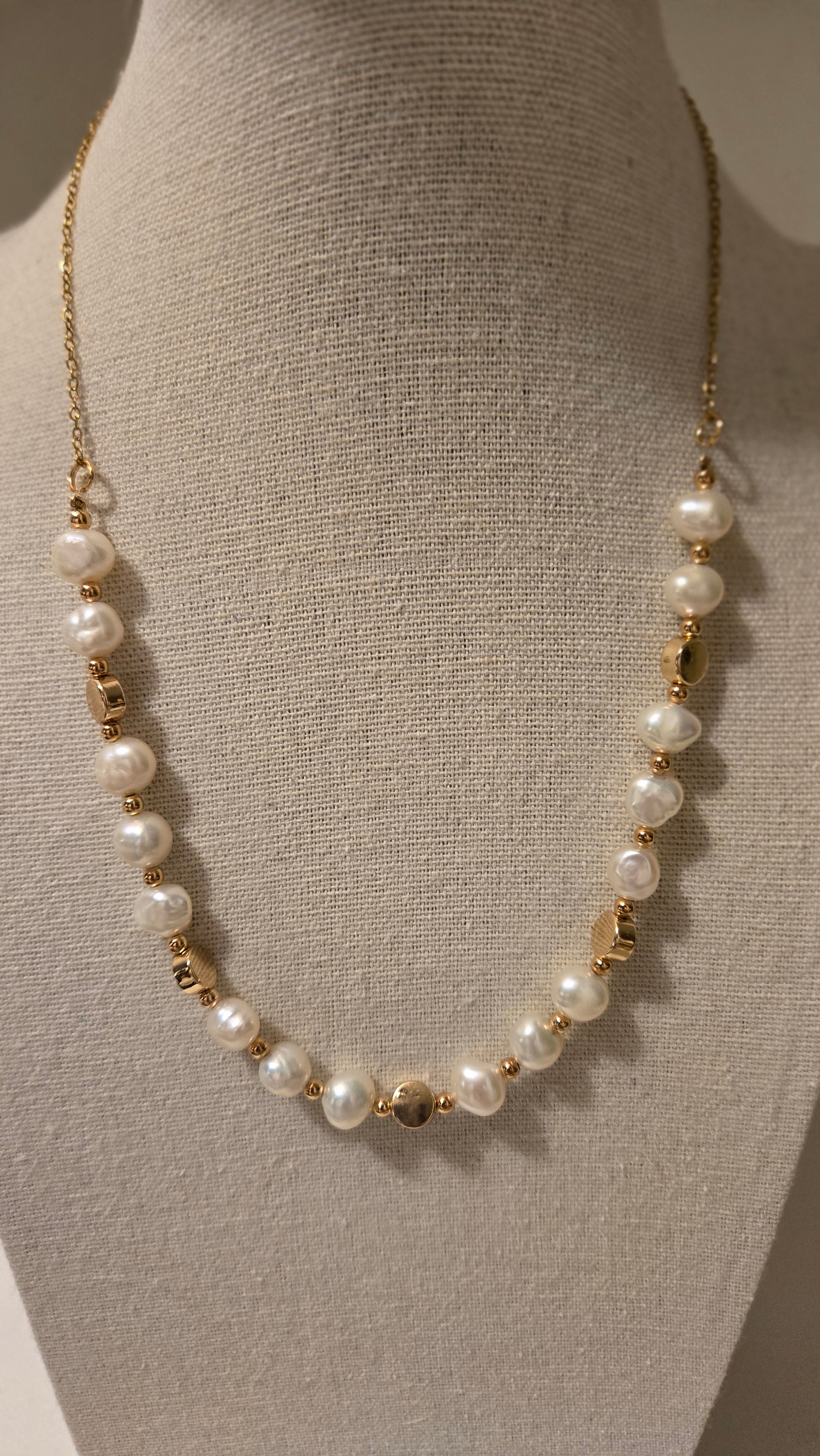 This necklace blends timeless grace with modern charm, featuring natural pearls delicately paired with golden accents to create a masterpiece of sophistication. Its luxurious design makes it the perfect choice for a woman who finds beauty in details, adding a refined glow to every moment she wears it.
