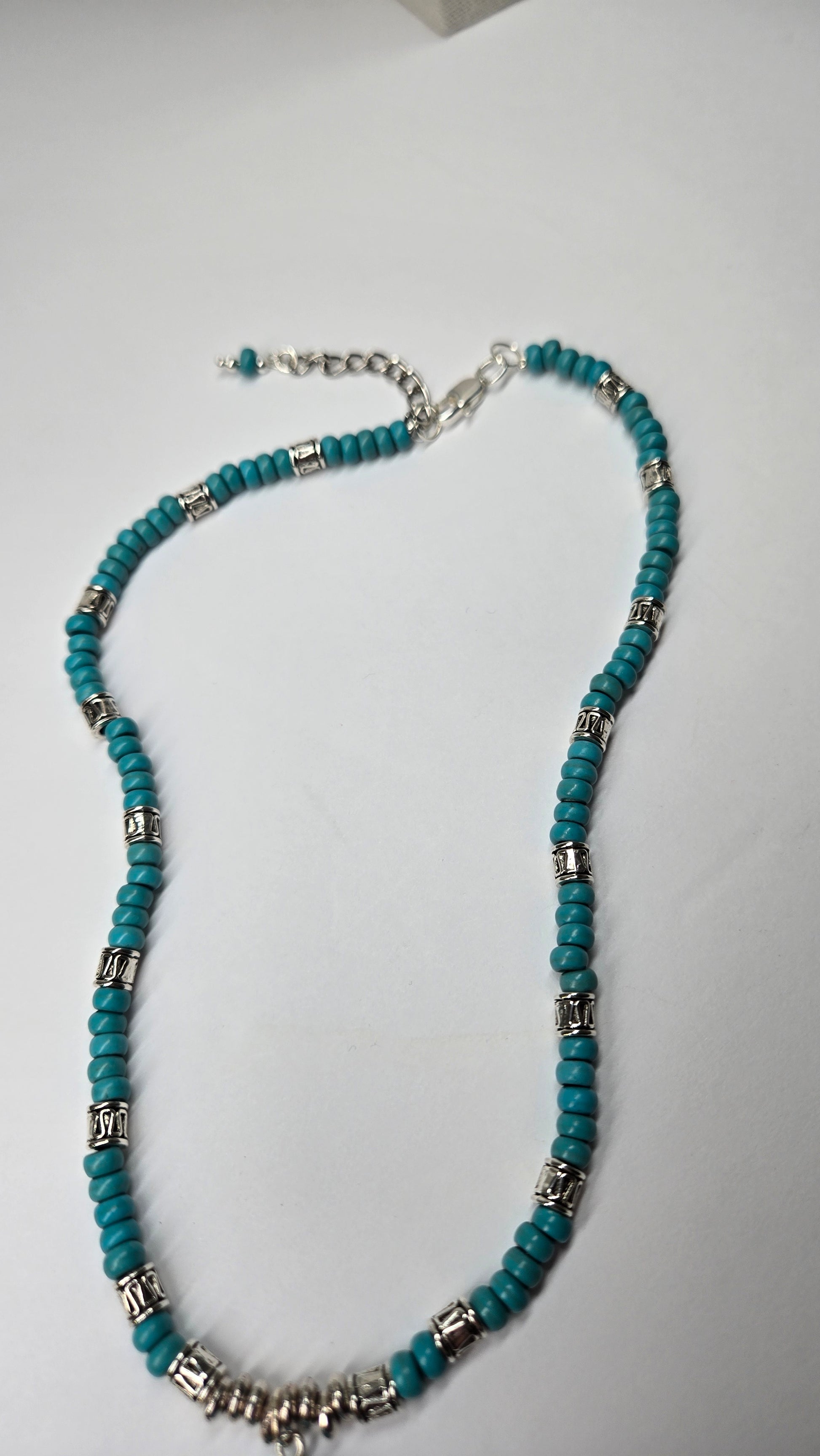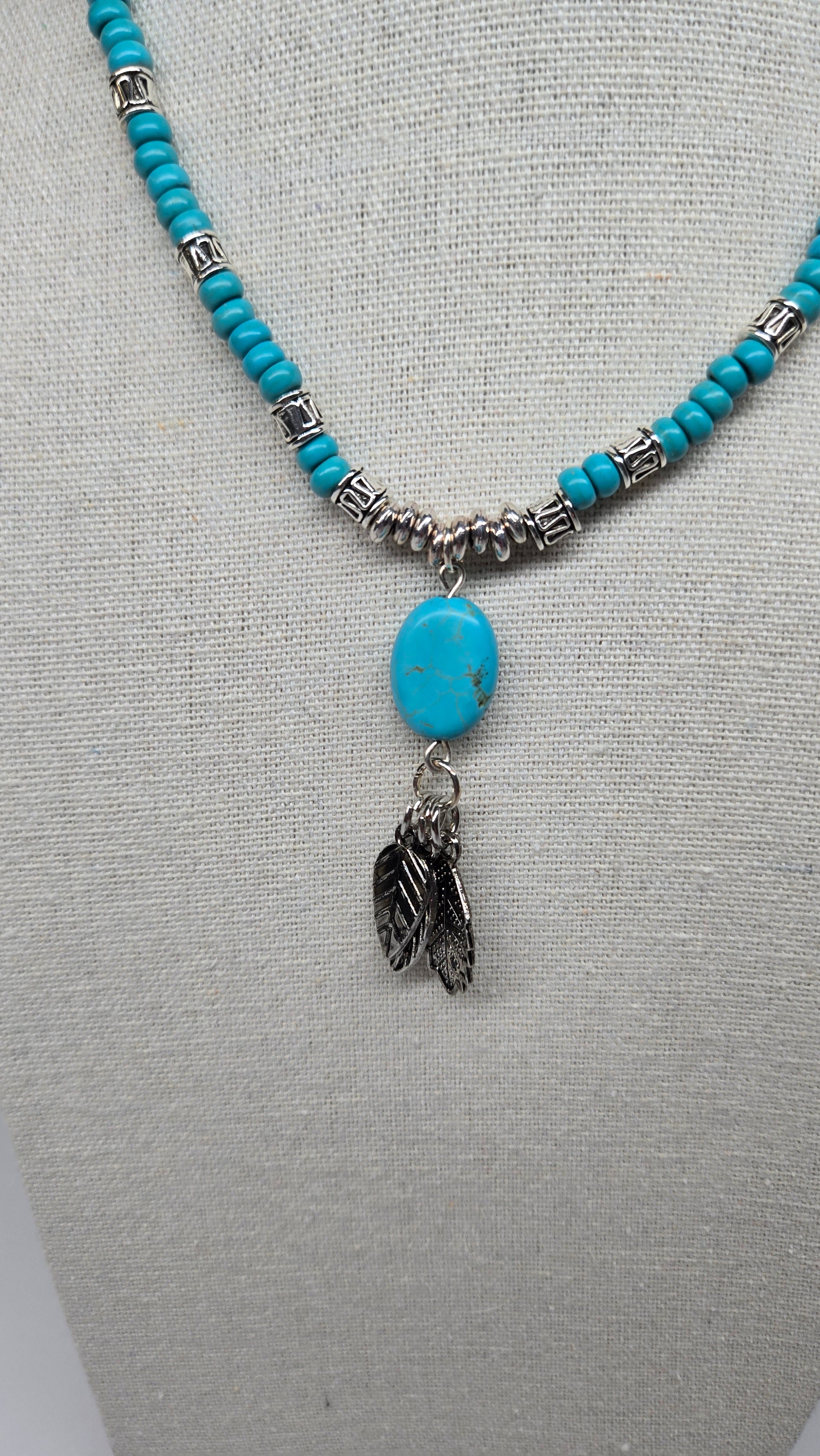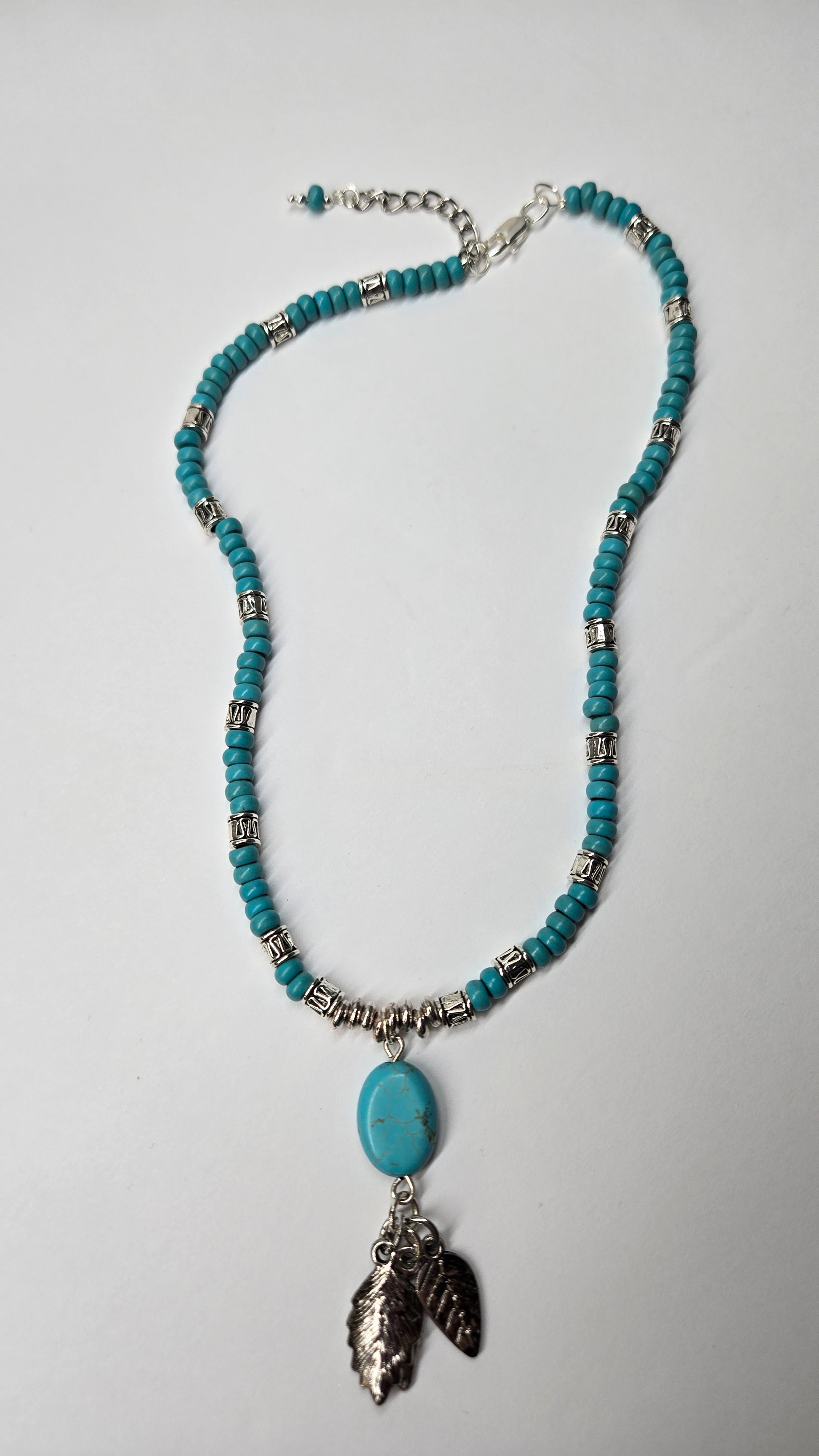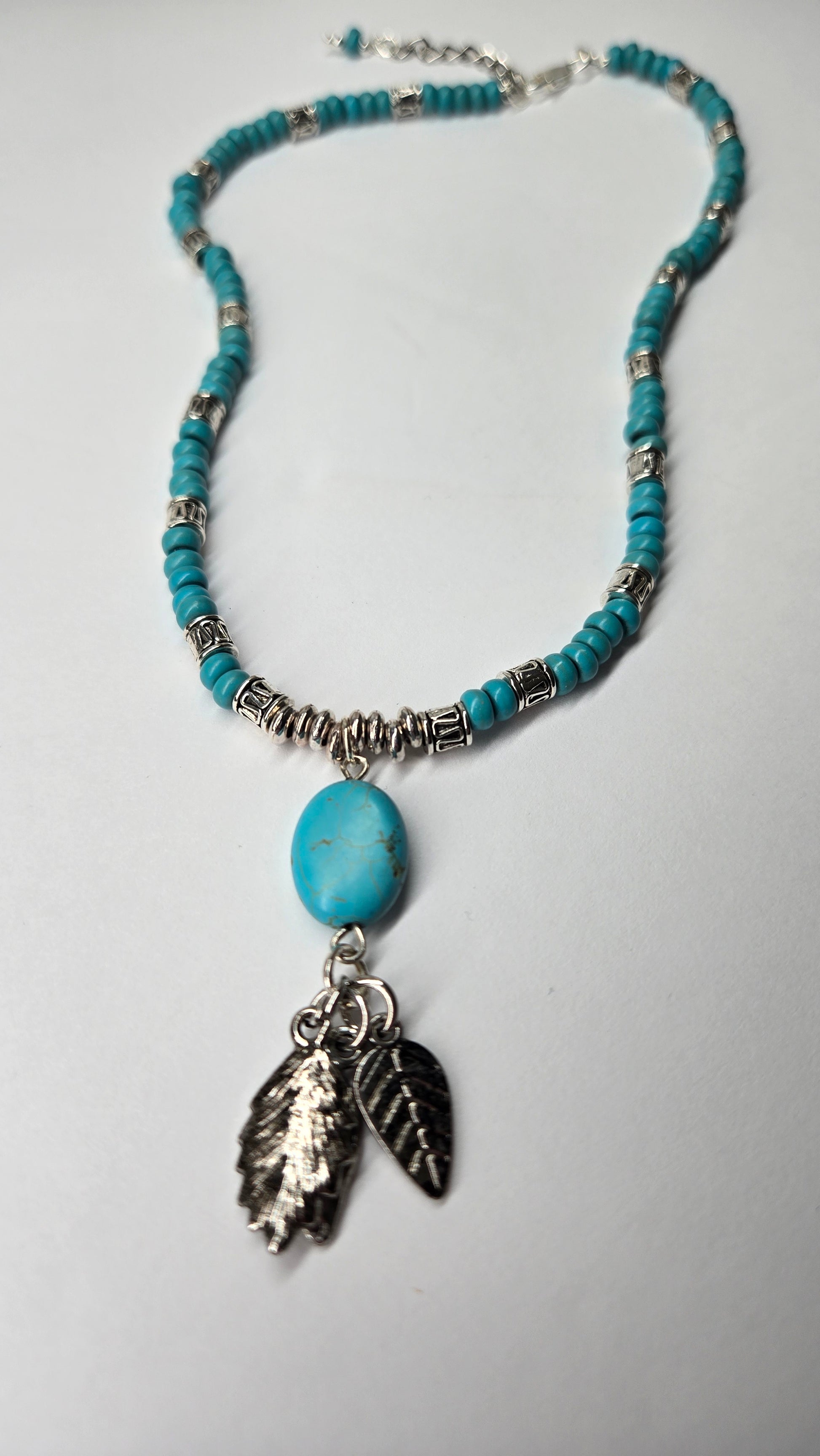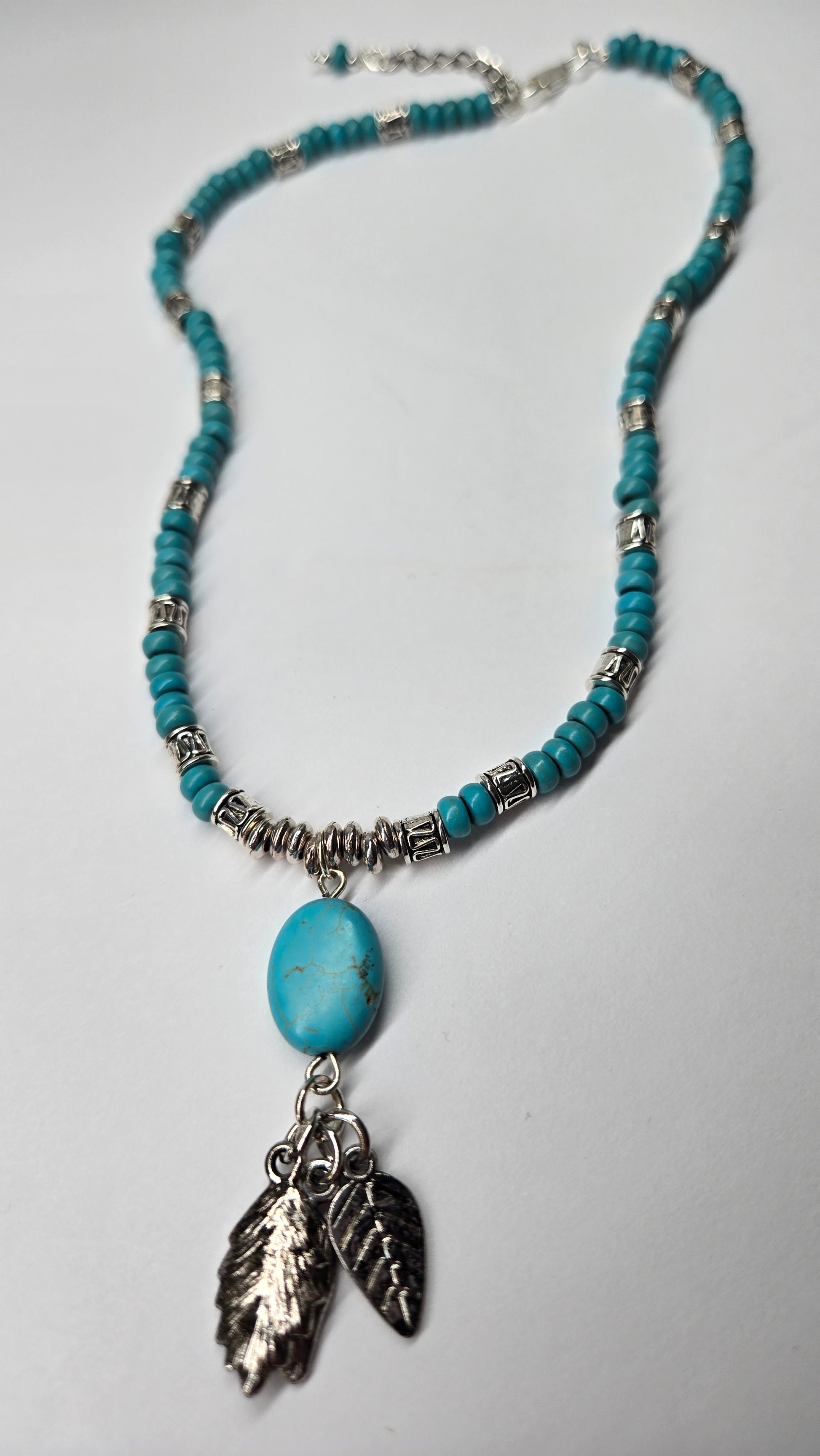 A handcrafted turquoise necklace inspired by nature’s calm and balance. Featuring silver accents and delicate leaf charms, this piece radiates peaceful elegance . perfect for those who love natural beauty and boho charm.